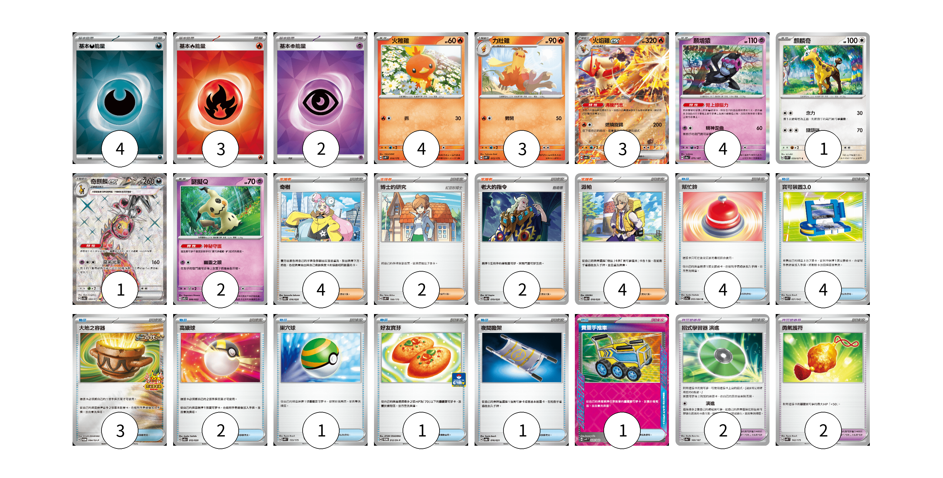 牌組構築方案 以此牌組為基礎新構築牌組 顯示卡面 顯示列表 寶可夢卡(18) 4 3 3 4 1 1 2 寶可夢道具(4) 2 2 物品卡(17) 4 4 3 2 1 1 1 1 支援者卡(12) 4 2 2 4 能量卡(9) 4 3 2 寶可夢卡(18) 卡牌名稱 張數 卡牌名稱 張數 火稚雞 SVM 014/175 04 力壯雞 SVM 015/175 03 火焰雞ex SVM 016/175 03 願增猿 SV8a 075/187 04 麒麟奇 SV2D 059/071 01 奇麒麟ex SV5M 088/071 01 謎擬Q SVTS 006/022 02 寶可夢道具(4) 卡牌名稱 張數 卡牌名稱 張數 招式學習器 演進 SV8a 160/187 02 勇氣護符 SVM 142/175 02 物品卡(17) 卡牌名稱 張數 卡牌名稱 張數 幫忙鈴 SV7a 053/064 04 寶可裝置3.0 SVK 021/042 04 大地之容器 SV-P 084/SV-P 03 高級球 SVOD 012/020 02 巢穴球 SVM 133/175 01 好友寶芬 SV-P 212/SV-P 01 夜間擔架 SVOM 016/021 01 貴重手推車 SVK 020/042 01 支援者卡(12) 卡牌名稱 張數 卡牌名稱 張數 奇樹 SVOD 016/020 04 博士的研究 SVM 166/175 02 老大的指令 SVOD 019/020 02 派帕 SVOD 018/020 04 能量卡(9) 卡牌名稱 張數 卡牌名稱 張數 基本【惡】能量 SVOM DAR 04 基本【火】能量 SVK FIR 03 基本【超】能量 SVK PSY 02 以此牌組為基礎新構築牌組 牌組編碼 MfonRC-KMPXsV-fGtEOA copy 列印牌組單 牌組編碼已複製 分享至SNS