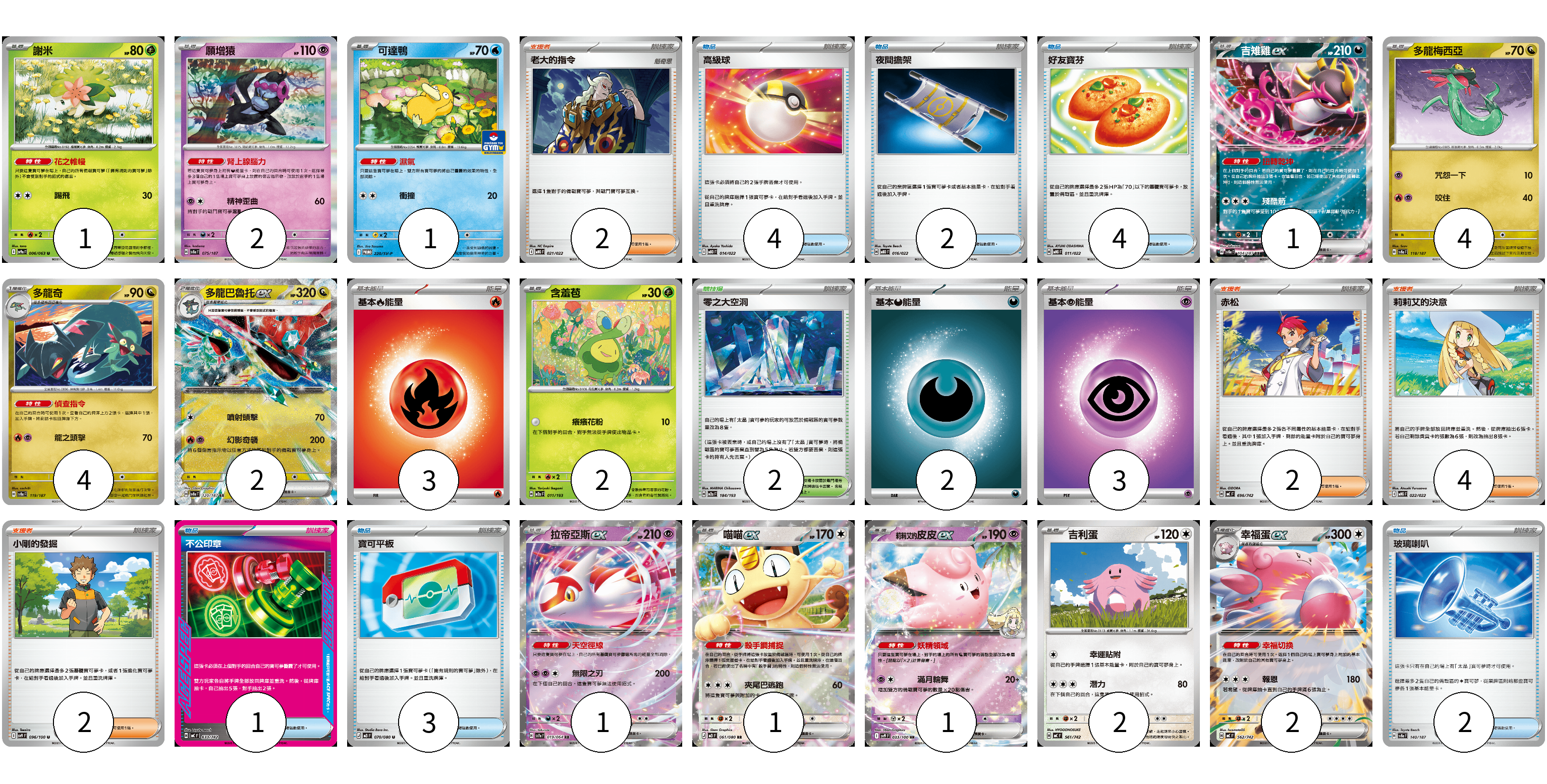 牌組構築方案 以此牌組為基礎新構築牌組 顯示卡面 顯示列表 寶可夢卡(24) 1 2 1 1 4 4 2 2 1 1 1 2 2 物品卡(16) 4 2 4 1 3 2 支援者卡(10) 2 2 4 2 競技場卡(2) 2 能量卡(8) 3 2 3 寶可夢卡(24) 卡牌名稱 張數 卡牌名稱 張數 謝米 SV9a 006/063 01 願增猿 SV8a 075/187 02 可達鴨 SV-P 220/SV-P 01 吉雉雞ex SV8a 104/187 01 多龍梅西亞 SV8a 118/187 04 多龍奇 SV8a 119/187 04 多龍巴魯托ex SV8a 120/187 02 含羞苞 M2a 011/193 02 拉帝亞斯ex SV7a 019/064 01 喵喵ex M3 061/080 01 莉莉艾的皮皮ex SV9 033/100 01 吉利蛋 MC 561/742 02 幸福蛋ex MC 562/742 02 物品卡(16) 卡牌名稱 張數 卡牌名稱 張數 高級球 MBD 014/022 04 夜間擔架 MBD 016/022 02 好友寶芬 MBG 011/022 04 不公印章 MC 633/742 01 寶可平板 M3 070/080 03 玻璃喇叭 SV8a 140/187 02 支援者卡(10) 卡牌名稱 張數 卡牌名稱 張數 老大的指令 MBG 021/022 02 赤松 MC 696/742 02 莉莉艾的決意 MBG 022/022 04 小剛的發掘 SV9 096/100 02 競技場卡(2) 卡牌名稱 張數 卡牌名稱 張數 零之大空洞 M2a 184/193 02 能量卡(8) 卡牌名稱 張數 卡牌名稱 張數 基本【火】能量 M-P FIR 03 基本【惡】能量 MC DAR 02 基本【超】能量 MC PSY 03 以此牌組為基礎新構築牌組 牌組編碼 MoqzvD-unwEYV-CMnpOl copy 列印牌組單 牌組編碼已複製 分享至SNS