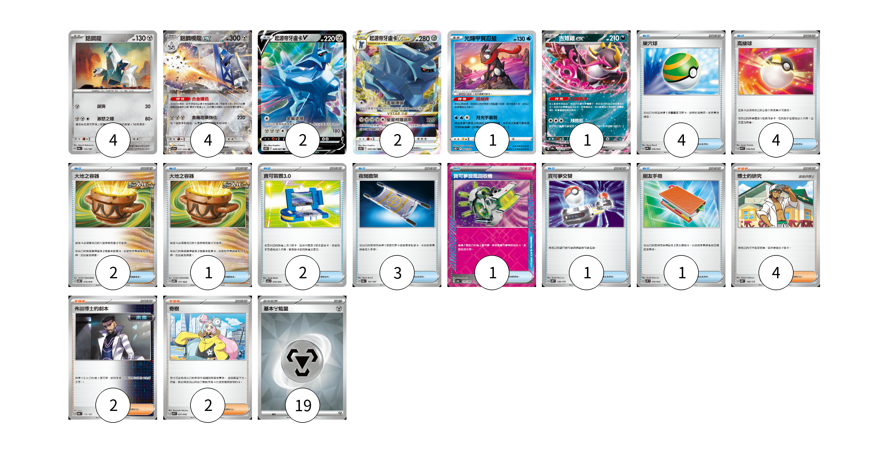 牌組構築方案 以此牌組為基礎新構築牌組 顯示卡面 顯示列表 寶可夢卡(14) 4 4 2 2 1 1 物品卡(19) 4 4 2 1 2 3 1 1 1 支援者卡(8) 4 2 2 能量卡(19) 19 寶可夢卡(14) 卡牌名稱 張數 卡牌名稱 張數 鋁鋼龍 SV8a 112/187 04 鋁鋼橋龍ex SV7a 037/064 04 起源帝牙盧卡V S10D 048/067 02 起源帝牙盧卡VSTAR S10D 049/067 02 光輝甲賀忍蛙 SVTG 002/019 01 吉雉雞ex SV8a 104/187 01 物品卡(19) 卡牌名稱 張數 卡牌名稱 張數 巢穴球 SVK 016/042 04 高級球 SVK 018/042 04 大地之容器 SVTG 010/019 02 大地之容器 SVTS 011/022 01 寶可裝置3.0 SVEL 014/020 02 夜間擔架 SV8a 151/187 03 寶可夢旋風回收機 SV8a 149/187 01 寶可夢交替 SVM 136/175 01 朋友手冊 SVK 014/042 01 支援者卡(8) 卡牌名稱 張數 卡牌名稱 張數 博士的研究 SVM 168/175 04 弗圖博士的劇本 SV8a 175/187 02 奇樹 SVK 031/042 02 能量卡(19) 卡牌名稱 張數 卡牌名稱 張數 基本【鋼】能量 SVK MET 19 以此牌組為基礎新構築牌組 牌組編碼 MpIDXY-WXdoZp-gYRbxA copy 列印牌組單 牌組編碼已複製 分享至SNS