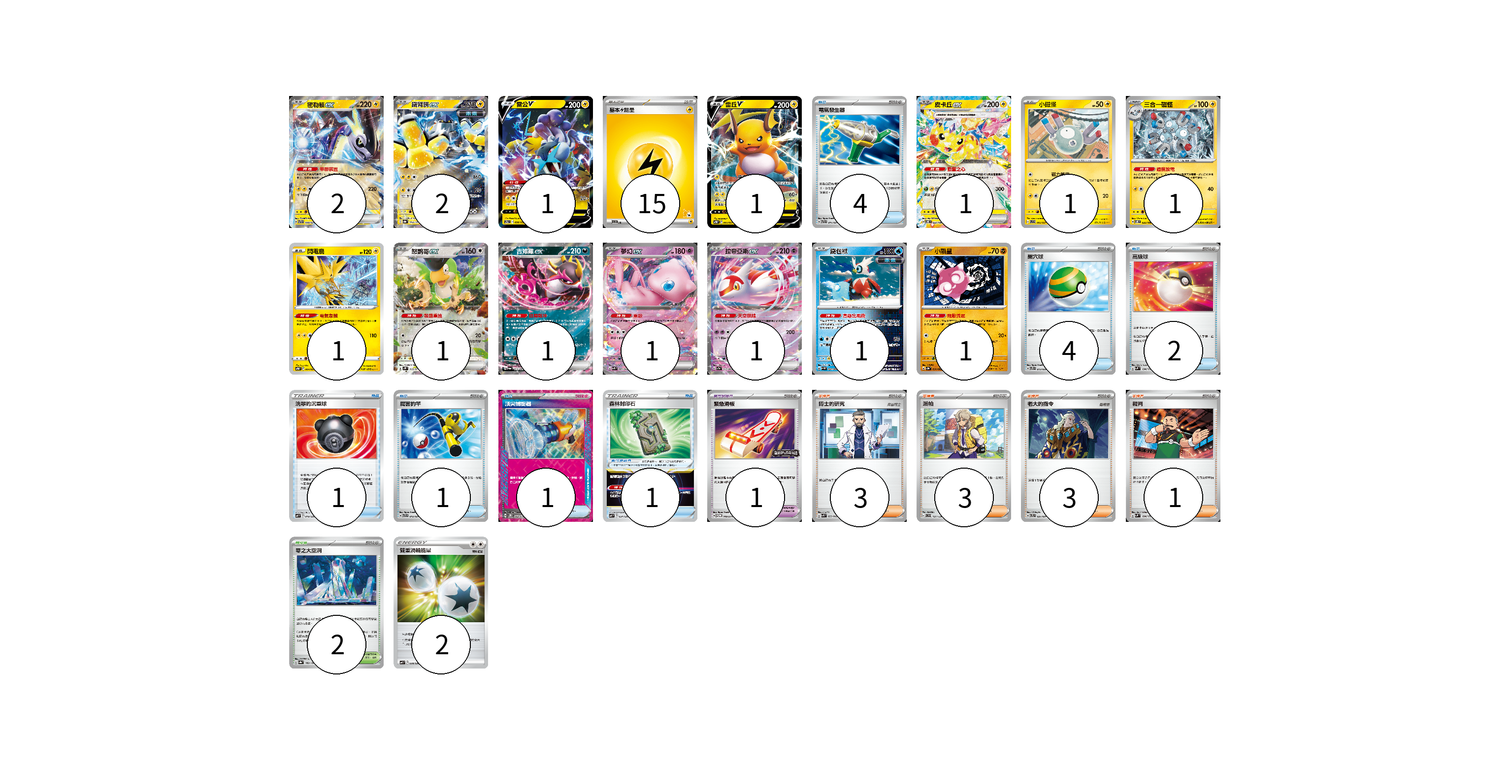 牌組構築方案 以此牌組為基礎新構築牌組 顯示卡面 顯示列表 寶可夢卡(16) 2 2 1 1 1 1 1 1 1 1 1 1 1 1 寶可夢道具(1) 1 物品卡(14) 4 4 2 1 1 1 1 支援者卡(10) 3 3 3 1 競技場卡(2) 2 能量卡(17) 15 2 寶可夢卡(16) 卡牌名稱 張數 卡牌名稱 張數 密勒頓ex SVTR 008/021 02 鐵臂膀ex SV8a 054/187 02 雷公V S12a 038/172 01 雷丘V SVTR 003/021 01 皮卡丘ex SV8 033/106 01 小磁怪 SVC 002/021 01 三合一磁怪 SV8 035/106 01 閃電鳥 SVTR 004/021 01 怒鸚哥ex SV2P 065/071 01 吉雉雞ex SV6a 038/064 01 夢幻ex SVK 001/042 01 拉帝亞斯ex SV7a 019/064 01 鐵包袱 SV4M 020/066 01 小隕星 SV3a 030/062 01 寶可夢道具(1) 卡牌名稱 張數 卡牌名稱 張數 緊急滑板 SV-P 140/SV-P 01 物品卡(14) 卡牌名稱 張數 卡牌名稱 張數 電氣發生器 SVTR 011/021 04 巢穴球 SVTS 013/022 04 高級球 SVM 134/175 02 洗翠的沉重球 SVF 019/038 01 厲害釣竿 SVTR 012/021 01 頂尖捕捉器 SV5M 062/071 01 森林封印石 SVF 024/038 01 支援者卡(10) 卡牌名稱 張數 卡牌名稱 張數 博士的研究 SVK 033/042 03 派帕 SVD 137/139 03 老大的指令 SVTL 021/021 03 裁判 SVM 154/175 01 競技場卡(2) 卡牌名稱 張數 卡牌名稱 張數 零之大空洞 SV8a 182/187 02 能量卡(17) 卡牌名稱 張數 卡牌名稱 張數 基本【雷】能量 SVI LIG 15 雙重渦輪能量 SVF 038/038 02 以此牌組為基礎新構築牌組 牌組編碼 MpJBZQ-rVCreh-Qtbubc copy 列印牌組單 牌組編碼已複製 分享至SNS