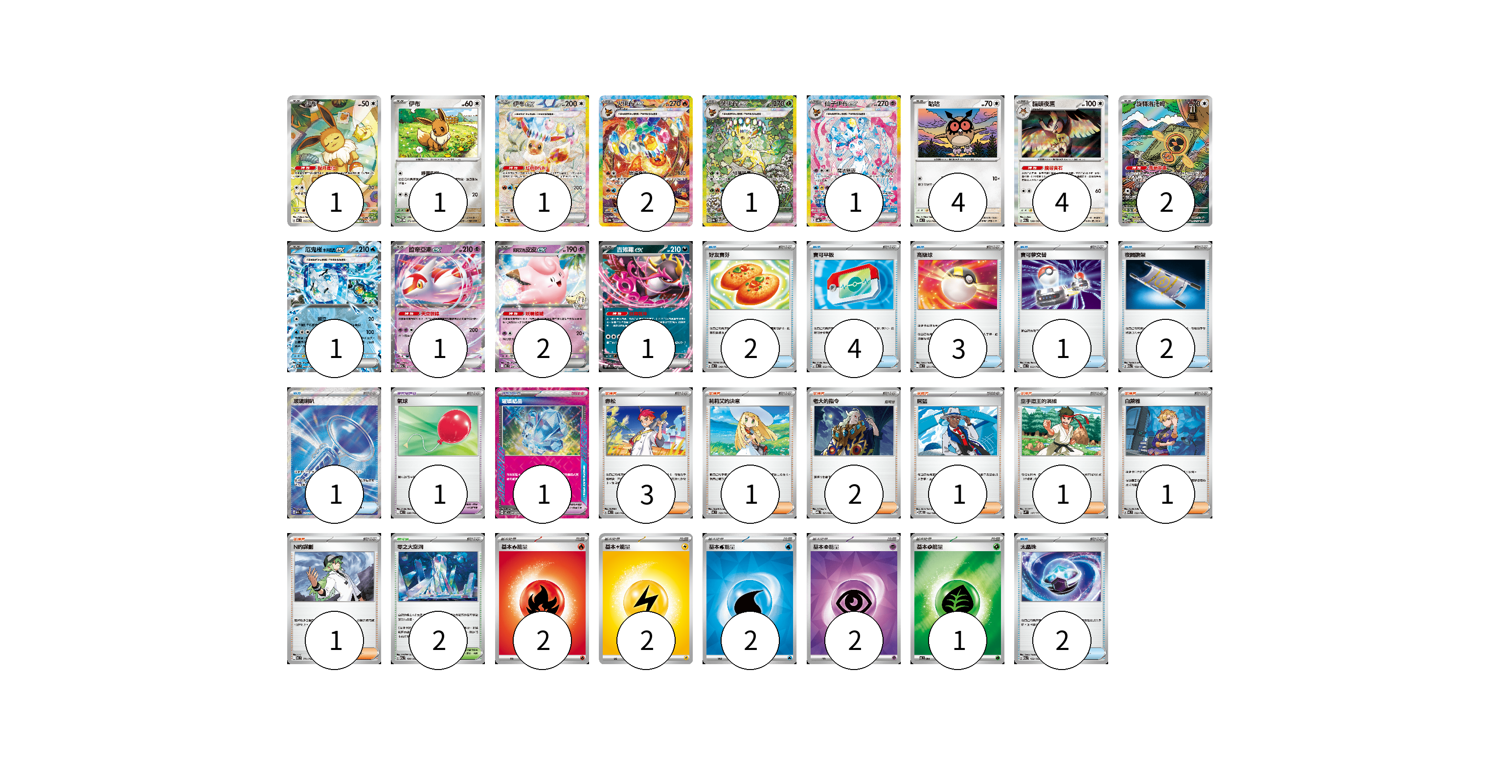 牌組構築方案 以此牌組為基礎新構築牌組 顯示卡面 顯示列表 寶可夢卡(22) 1 1 1 2 1 1 4 4 2 1 1 2 1 寶可夢道具(2) 1 1 物品卡(15) 2 4 3 1 2 1 2 支援者卡(10) 3 1 2 1 1 1 1 競技場卡(2) 2 能量卡(9) 2 2 2 2 1 寶可夢卡(22) 卡牌名稱 張數 卡牌名稱 張數 伊布 MC 755/742 01 伊布 M-P 072/M-P 01 伊布ex SV8a 223/187 01 火伊布ex SV8a 202/187 02 葉伊布ex SV8a 200/187 01 仙子伊布ex SV8a 212/187 01 咕咕 MC 572/742 04 貓頭夜鷹 M2a 138/193 04 旋轉洛托姆 M2a 213/193 02 厄鬼椪 水井面具ex MC 224/742 01 拉帝亞斯ex M2a 075/193 01 莉莉艾的皮皮ex MC 287/742 02 吉雉雞ex MC 489/742 01 寶可夢道具(2) 卡牌名稱 張數 卡牌名稱 張數 氣球 MC 688/742 01 璀璨結晶 SV7 094/102 01 物品卡(15) 卡牌名稱 張數 卡牌名稱 張數 好友寶芬 MC 648/742 02 寶可平板 MC 662/742 04 高級球 MC 651/742 03 寶可夢交替 MC 663/742 01 夜間擔架 M2a 159/193 02 玻璃喇叭 M2a 215/193 01 太晶珠 M2a 152/193 02 支援者卡(10) 卡牌名稱 張數 卡牌名稱 張數 赤松 MC 696/742 03 莉莉艾的決意 MC 729/742 01 老大的指令 MBG 021/022 02 席藍 SV8 102/106 01 空手道王的演練 SVM 147/175 01 白蕾雅 MC 722/742 01 N的謀劃 MC 701/742 01 競技場卡(2) 卡牌名稱 張數 卡牌名稱 張數 零之大空洞 M2a 184/193 02 能量卡(9) 卡牌名稱 張數 卡牌名稱 張數 基本【火】能量 MC FIR 02 基本【雷】能量 MJ LIG 02 基本【水】能量 SVM WAT 02 基本【超】能量 SVOD PSY 02 基本【草】能量 MC GRA 01 以此牌組為基礎新構築牌組 牌組編碼 MpdEuN-VjJARL-CTiVpg copy 列印牌組單 牌組編碼已複製 分享至SNS