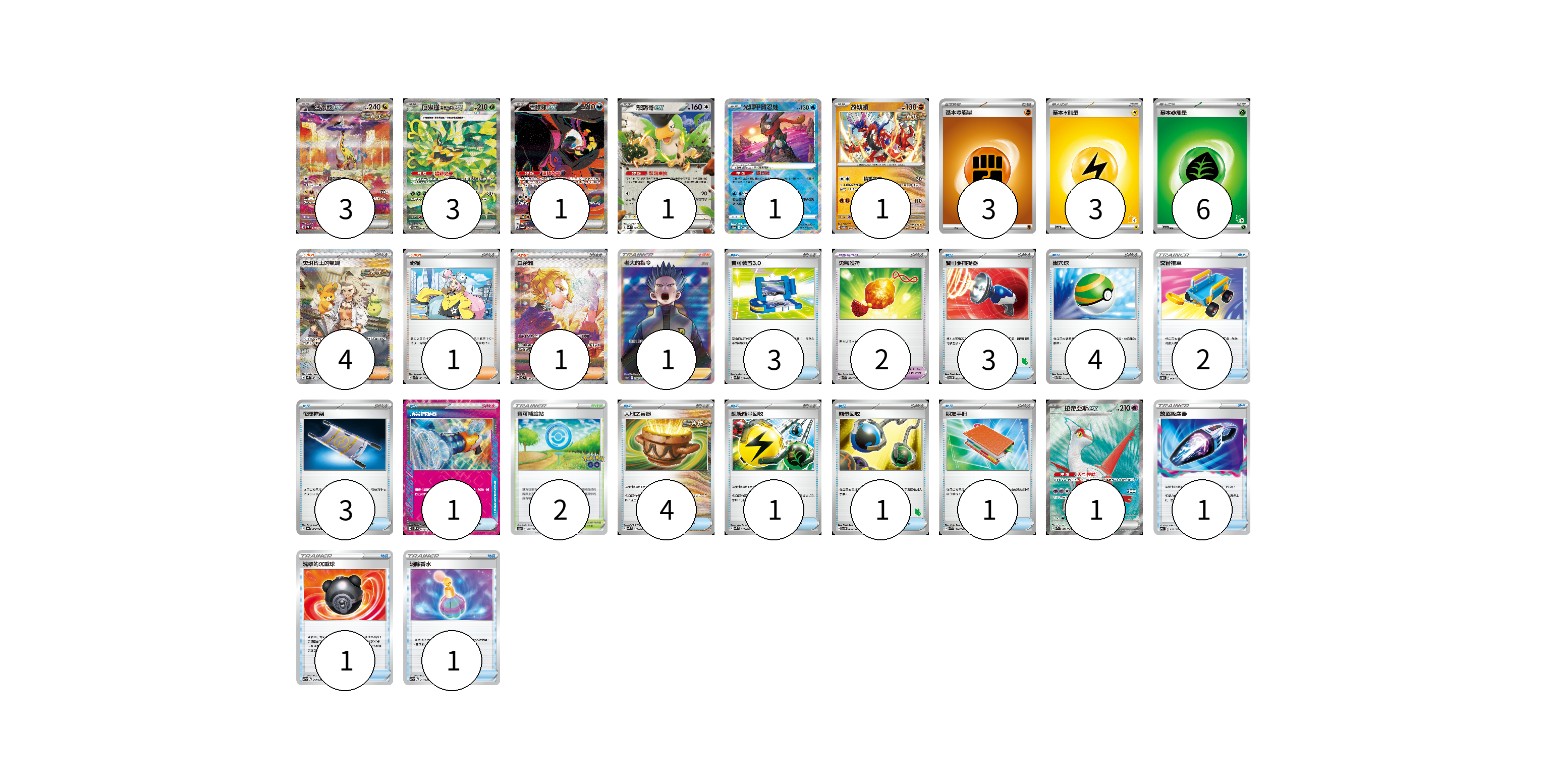 牌組構築方案 以此牌組為基礎新構築牌組 顯示卡面 顯示列表 寶可夢卡(11) 3 3 1 1 1 1 1 寶可夢道具(2) 2 物品卡(26) 3 3 4 2 3 1 4 1 1 1 1 1 1 支援者卡(7) 4 1 1 1 競技場卡(2) 2 能量卡(12) 3 3 6 寶可夢卡(11) 卡牌名稱 張數 卡牌名稱 張數 猛雷鼓ex SV5K 095/071 03 厄鬼椪 碧草面具ex SV6 125/101 03 吉雉雞ex SV6a 089/064 01 怒鸚哥ex SVK 006/042 01 光輝甲賀忍蛙 S12a 033/172 01 故勒頓 SV8 069/106 01 拉帝亞斯ex SV7a 078/064 01 寶可夢道具(2) 卡牌名稱 張數 卡牌名稱 張數 勇氣護符 SVK 024/042 02 物品卡(26) 卡牌名稱 張數 卡牌名稱 張數 寶可裝置3.0 SVK 021/042 03 寶可夢捕捉器 SVI 055/066 03 巢穴球 SVTG 012/019 04 交替推車 SVTR 009/021 02 夜間擔架 SV6a 056/064 03 頂尖捕捉器 SV5M 062/071 01 大地之容器 SVK 012/042 04 超級能量回收 SVK 010/042 01 能量回收 SVI 049/066 01 朋友手冊 SVK 014/042 01 放逐吸塵器 SVF 023/038 01 洗翠的沉重球 SVF 019/038 01 消除香水 SVF 011/038 01 支援者卡(7) 卡牌名稱 張數 卡牌名稱 張數 奧琳博士的氣魄 SV4K 091/066 04 奇樹 SVK 031/042 01 白蕾雅 SV7 132/102 01 老大的指令(赤日) S12a 250/172 01 競技場卡(2) 卡牌名稱 張數 卡牌名稱 張數 寶可補給站 S10b 071/071 02 能量卡(12) 卡牌名稱 張數 卡牌名稱 張數 基本【鬥】能量 SVD FIG 03 基本【雷】能量 SVI LIG 03 基本【草】能量 SVI GRA 06 以此牌組為基礎新構築牌組 牌組編碼 MrgnPl-sFQMqA-zeFxUG copy 列印牌組單 牌組編碼已複製 分享至SNS