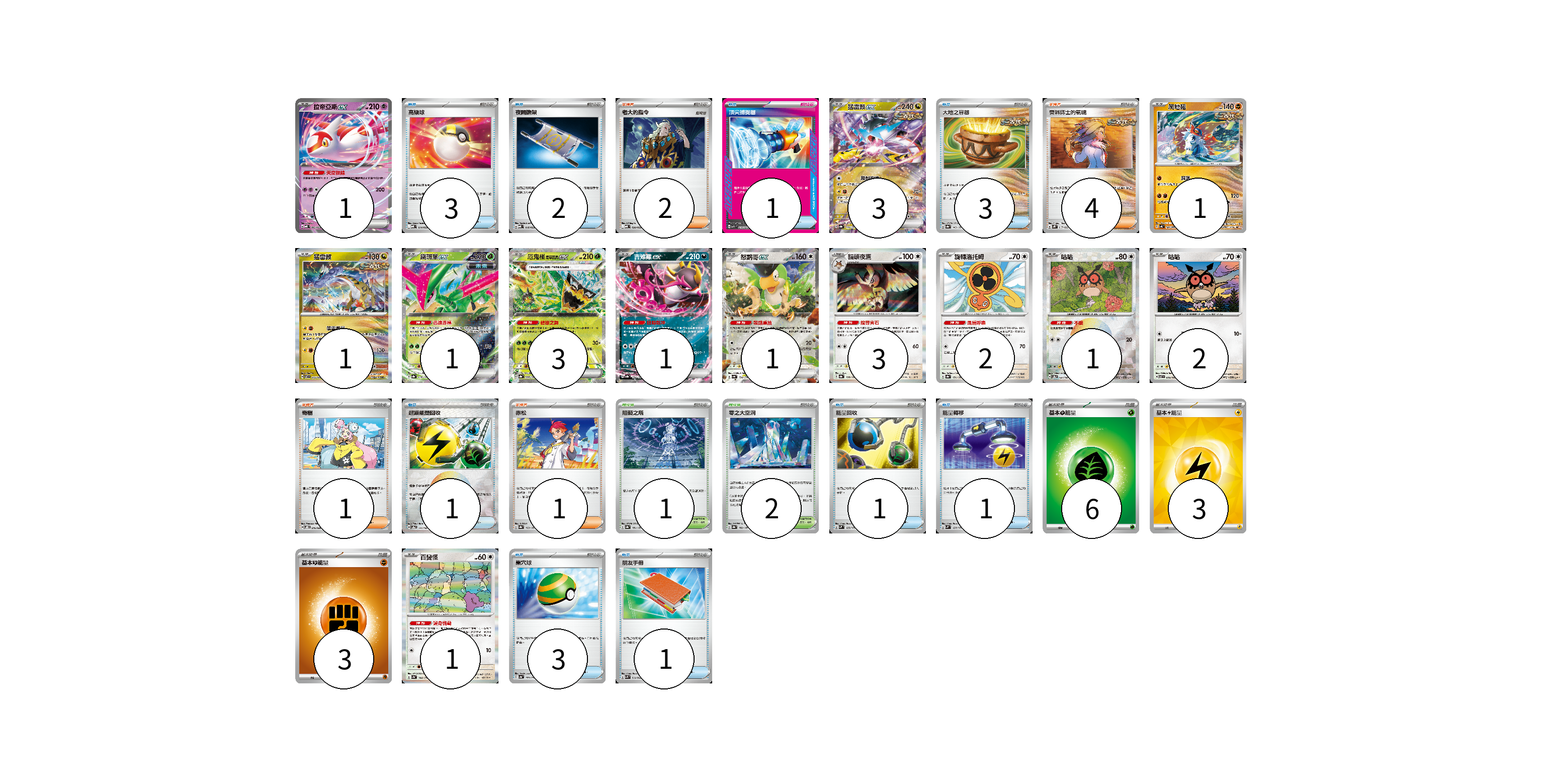 牌組構築方案 以此牌組為基礎新構築牌組 顯示卡面 顯示列表 寶可夢卡(21) 1 3 1 1 1 3 1 1 3 2 1 2 1 物品卡(16) 3 2 1 3 1 1 1 3 1 支援者卡(8) 2 4 1 1 競技場卡(3) 1 2 能量卡(12) 6 3 3 寶可夢卡(21) 卡牌名稱 張數 卡牌名稱 張數 拉帝亞斯ex MBD 003/022 01 猛雷鼓ex SV8a 124/187 03 爬地翅 SV4K 041/066 01 猛雷鼓 SV7 075/102 01 鐵斑葉ex SV8a 016/187 01 厄鬼椪 碧草面具ex SV8a 020/187 03 吉雉雞ex SV8a 104/187 01 怒鸚哥ex SV4a 154/190 01 貓頭夜鷹 SV8a 128/187 03 旋轉洛托姆 SV8a 131/187 02 咕咕 SV8a 127/187 01 咕咕 SV7 076/102 02 百變怪 SV4a 144/190 01 物品卡(16) 卡牌名稱 張數 卡牌名稱 張數 高級球 MBD 014/022 03 夜間擔架 MBD 016/022 02 頂尖捕捉器 MBG 014/022 01 大地之容器 SV8a 143/187 03 超級能量回收 SV8a 141/187 01 能量回收 SVM 125/175 01 能量轉移 SVM 127/175 01 巢穴球 SV4a 159/190 03 朋友手冊 SVK 014/042 01 支援者卡(8) 卡牌名稱 張數 卡牌名稱 張數 老大的指令 MBD 020/022 02 奧琳博士的氣魄 SVHK 017/022 04 奇樹 SVOD 016/020 01 赤松 SV8a 163/187 01 競技場卡(3) 卡牌名稱 張數 卡牌名稱 張數 阻礙之塔 SV8a 181/187 01 零之大空洞 SV8a 182/187 02 能量卡(12) 卡牌名稱 張數 卡牌名稱 張數 基本【草】能量 M-P GRA 06 基本【雷】能量 SVQP LIG 03 基本【鬥】能量 M-P FIG 03 以此牌組為基礎新構築牌組 牌組編碼 Mweeaa-yqcZIn-xiGJXQ copy 列印牌組單 牌組編碼已複製 分享至SNS