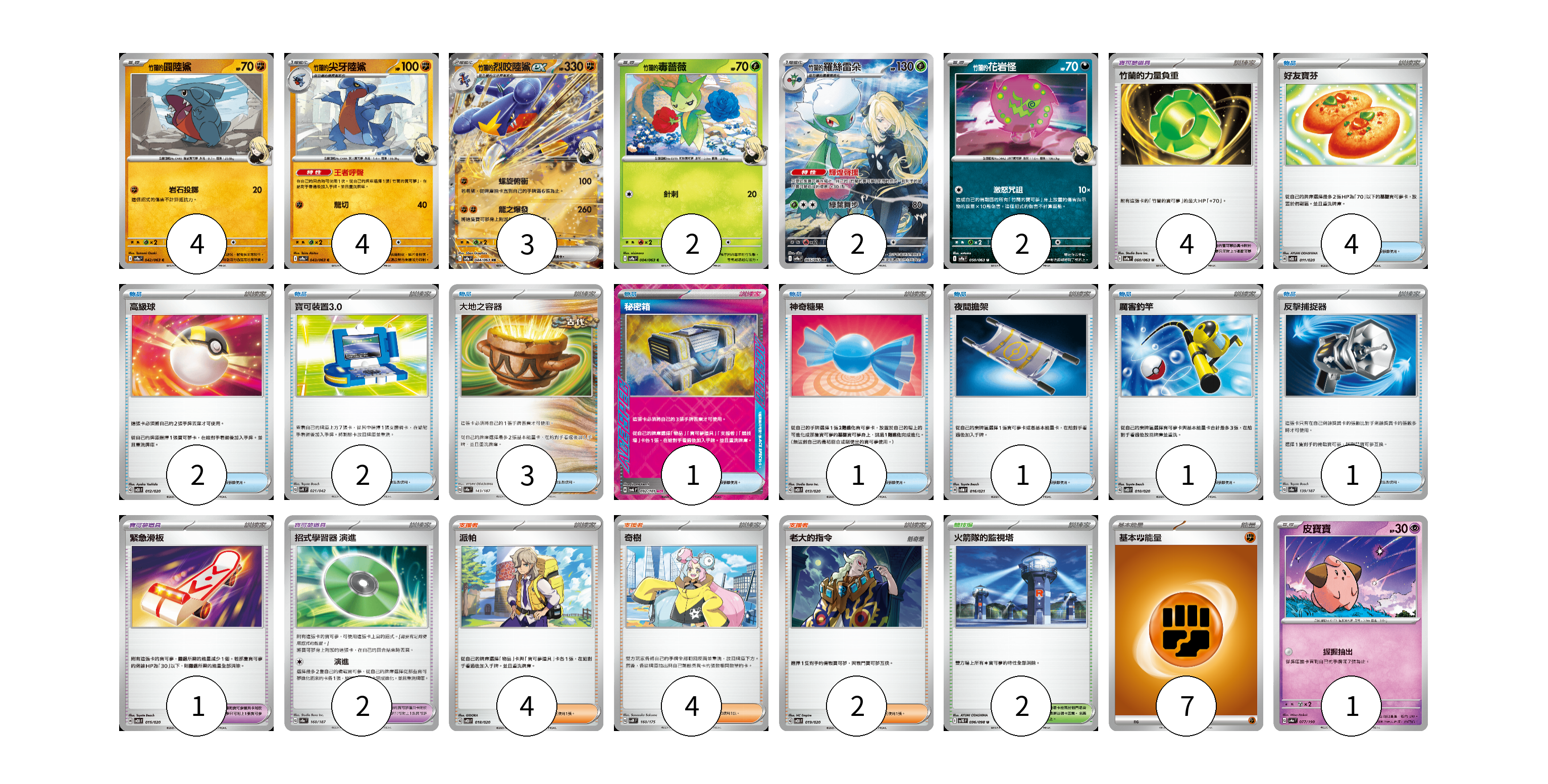 牌組構築方案 以此牌組為基礎新構築牌組 顯示卡面 顯示列表 寶可夢卡(18) 4 4 3 2 2 2 1 寶可夢道具(7) 4 1 2 物品卡(16) 4 2 2 3 1 1 1 1 1 支援者卡(10) 4 4 2 競技場卡(2) 2 能量卡(7) 7 寶可夢卡(18) 卡牌名稱 張數 卡牌名稱 張數 <竹蘭的>圓陸鯊 SV9a 042/063 04 <竹蘭的>尖牙陸鯊 SV9a 043/063 04 <竹蘭的>烈咬陸鯊ex SV9a 044/063 03 <竹蘭的>毒薔薇 SV9a 004/063 02 <竹蘭的>羅絲雷朵 SV9a 065/063 02 <竹蘭的>花岩怪 SV9a 050/063 02 皮寶寶 SV4a 077/190 01 寶可夢道具(7) 卡牌名稱 張數 卡牌名稱 張數 竹蘭的力量負重 SV9a 060/063 04 緊急滑板 SVOD 015/020 01 招式學習器 演進 SV8a 160/187 02 物品卡(16) 卡牌名稱 張數 卡牌名稱 張數 好友寶芬 SVOD 011/020 04 高級球 SVOD 012/020 02 寶可裝置3.0 SVK 021/042 02 大地之容器 SV8a 143/187 03 秘密箱 SV6 092/101 01 神奇糖果 SVOD 013/020 01 夜間擔架 SVOM 016/021 01 厲害釣竿 SVOD 010/020 01 反擊捕捉器 SV8a 139/187 01 支援者卡(10) 卡牌名稱 張數 卡牌名稱 張數 派帕 SVOD 018/020 04 奇樹 SVM 160/175 04 老大的指令 SVOD 019/020 02 競技場卡(2) 卡牌名稱 張數 卡牌名稱 張數 火箭隊的監視塔 SV10 096/098 02 能量卡(7) 卡牌名稱 張數 卡牌名稱 張數 基本鬥能量 sv-p FIG 07 以此牌組為基礎新構築牌組 牌組編碼 NCqrEV-cKUlVz-XLVQiS copy 列印牌組單 牌組編碼已複製 分享至SNS