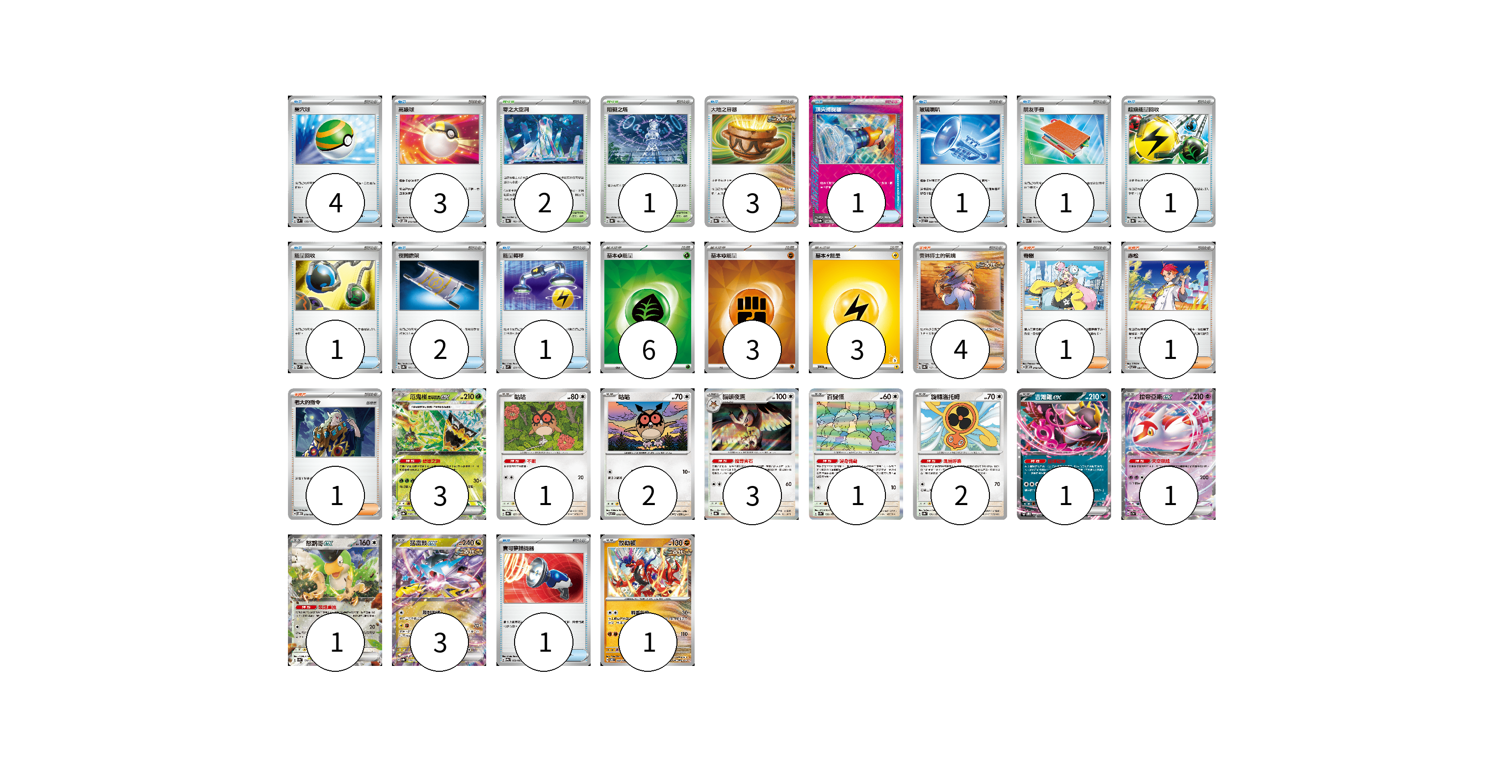 牌組構築方案 以此牌組為基礎新構築牌組 顯示卡面 顯示列表 寶可夢卡(19) 3 1 2 3 1 2 1 1 1 3 1 物品卡(19) 4 3 3 1 1 1 1 1 2 1 1 支援者卡(7) 4 1 1 1 競技場卡(3) 2 1 能量卡(12) 6 3 3 寶可夢卡(19) 卡牌名稱 張數 卡牌名稱 張數 厄鬼椪 碧草面具ex SV8a 020/187 03 咕咕 SV8a 127/187 01 咕咕 SV7 076/102 02 貓頭夜鷹 SV8a 128/187 03 百變怪 SV2a 132/165 01 旋轉洛托姆 SV8a 131/187 02 吉雉雞ex SVOD 004/020 01 拉帝亞斯ex SV7a 019/064 01 怒鸚哥ex SV4a 154/190 01 猛雷鼓ex SV8a 124/187 03 故勒頓 SV8 069/106 01 物品卡(19) 卡牌名稱 張數 卡牌名稱 張數 巢穴球 SVM 133/175 04 高級球 SVOD 012/020 03 大地之容器 SV8a 143/187 03 頂尖捕捉器 SV8a 148/187 01 玻璃喇叭 SV7 089/102 01 朋友手冊 SVK 014/042 01 超級能量回收 SV8a 141/187 01 能量回收 SVM 125/175 01 夜間擔架 SV8a 151/187 02 能量轉移 SVM 127/175 01 寶可夢捕捉器 SV9a 059/063 01 支援者卡(7) 卡牌名稱 張數 卡牌名稱 張數 奧琳博士的氣魄 SV8a 167/187 04 奇樹 SVOM 018/021 01 赤松 SV7 097/102 01 老大的指令 SVOD 019/020 01 競技場卡(3) 卡牌名稱 張數 卡牌名稱 張數 零之大空洞 SV8a 182/187 02 阻礙之塔 SV8a 181/187 01 能量卡(12) 卡牌名稱 張數 卡牌名稱 張數 基本【草】能量 SVK GRA 06 基本【鬥】能量 SVK FIG 03 基本【雷】能量 SVI LIG 03 以此牌組為基礎新構築牌組 牌組編碼 NCxfpY-dUEGwz-XEkqlP copy 列印牌組單 牌組編碼已複製 分享至SNS