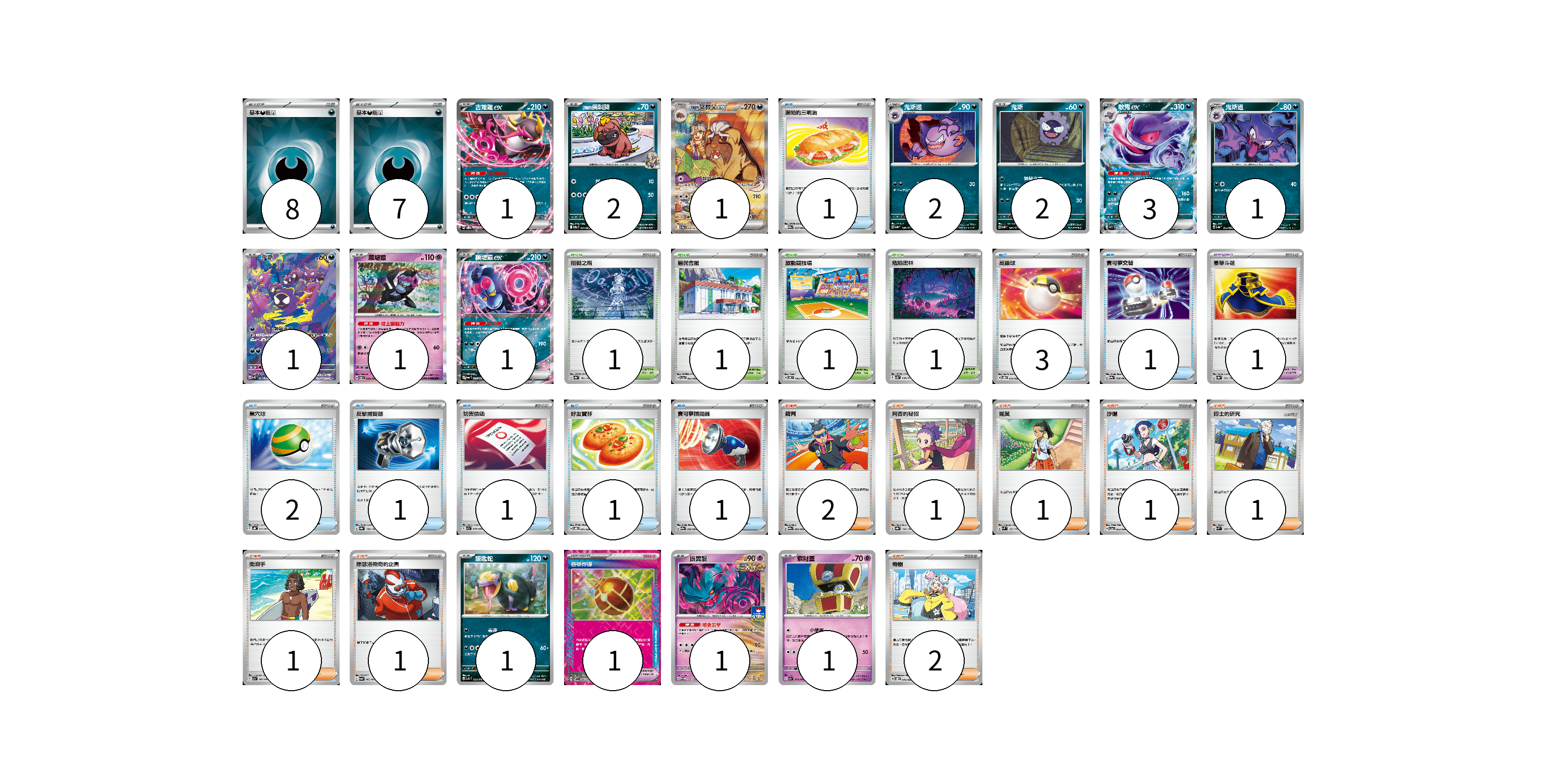 牌組構築方案 以此牌組為基礎新構築牌組 顯示卡面 顯示列表 寶可夢卡(18) 1 2 1 2 2 3 1 1 1 1 1 1 1 寶可夢道具(2) 1 1 物品卡(11) 1 3 1 2 1 1 1 1 支援者卡(10) 2 1 1 1 1 1 1 2 競技場卡(4) 1 1 1 1 能量卡(15) 8 7 寶可夢卡(18) 卡牌名稱 張數 卡牌名稱 張數 吉雉雞ex SVOD 004/020 01 <派帕的>偶叫獒 SV9a 051/063 02 <派帕的>獒教父ex SV9a 088/063 01 鬼斯通 SV5K 046/071 02 鬼斯 SV5K 045/071 02 耿鬼ex SV5K 047/071 03 鬼斯通 SV3a 034/062 01 鬼斯 SV5K 080/071 01 願增猿 SV6 055/101 01 願增猿ex SV6a 037/064 01 飯匙蛇 SV1S 053/078 01 振翼髮 SV-P 225/SV-P 01 索財靈 SV7a 024/064 01 寶可夢道具(2) 卡牌名稱 張數 卡牌名稱 張數 豪華斗篷 SV8a 155/187 01 奢華炸彈 SV7 096/102 01 物品卡(11) 卡牌名稱 張數 卡牌名稱 張數 派帕的三明治 SV9a 057/063 01 高級球 SVOD 012/020 03 寶可夢交替 SV9a 058/063 01 巢穴球 SVHK 012/022 02 反擊捕捉器 SV8a 139/187 01 妨害信函 SV7a 055/064 01 好友寶芬 SVOD 011/020 01 寶可夢捕捉器 SV9a 059/063 01 支援者卡(10) 卡牌名稱 張數 卡牌名稱 張數 裁判 SV9a 062/063 02 阿杏的秘招 SV8a 166/187 01 妮莫 SVM 161/175 01 沙儷 SV5a 063/066 01 博士的研究 SVM 165/175 01 衝浪手 SV7a 061/064 01 庫瑟洛斯奇的企圖 SV6a 062/064 01 奇樹 SVOD 016/020 02 競技場卡(4) 卡牌名稱 張數 卡牌名稱 張數 阻礙之塔 SV8a 181/187 01 居民會館 SV5a 065/066 01 激動競技場 SV8 105/106 01 危險密林 SV5K 070/071 01 能量卡(15) 卡牌名稱 張數 卡牌名稱 張數 基本【惡】能量 SVM DAR 08 基本【惡】能量 SVOM DAR 07 以此牌組為基礎新構築牌組 牌組編碼 NMbEAc-KNvXsP-HZcfgE copy 列印牌組單 牌組編碼已複製 分享至SNS
