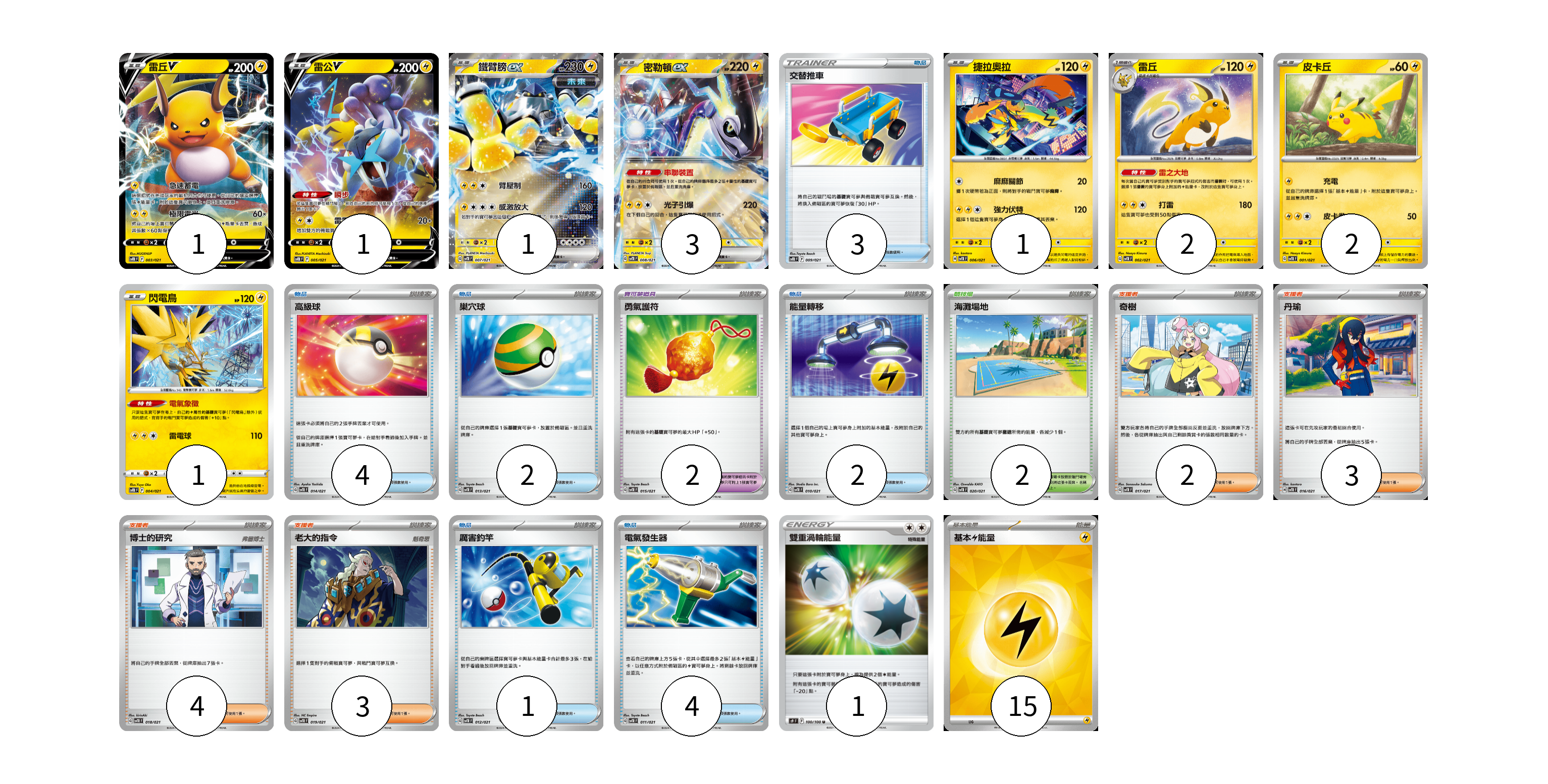 牌組構築方案 以此牌組為基礎新構築牌組 顯示卡面 顯示列表 寶可夢卡(12) 1 1 1 3 1 2 2 1 寶可夢道具(2) 2 物品卡(16) 3 4 2 2 1 4 支援者卡(12) 2 3 4 3 競技場卡(2) 2 能量卡(16) 1 15 寶可夢卡(12) 卡牌名稱 張數 卡牌名稱 張數 雷丘V SVTR 003/021 01 雷公V SVTR 005/021 01 鐵臂膀ex SVTR 007/021 01 密勒頓ex SVTR 008/021 03 捷拉奧拉 SVTR 006/021 01 雷丘 SVTR 002/021 02 皮卡丘 SVTR 001/021 02 閃電鳥 SVTR 004/021 01 寶可夢道具(2) 卡牌名稱 張數 卡牌名稱 張數 勇氣護符 SVTR 015/021 02 物品卡(16) 卡牌名稱 張數 卡牌名稱 張數 交替推車 SVTR 009/021 03 高級球 SVTR 014/021 04 巢穴球 SVTR 013/021 02 能量轉移 SVTR 010/021 02 厲害釣竿 SVTR 012/021 01 電氣發生器 SVTR 011/021 04 支援者卡(12) 卡牌名稱 張數 卡牌名稱 張數 奇樹 SVTR 017/021 02 丹瑜 SVTR 016/021 03 博士的研究 SVTR 018/021 04 老大的指令 SVTR 019/021 03 競技場卡(2) 卡牌名稱 張數 卡牌名稱 張數 海灘場地 SVTR 020/021 02 能量卡(16) 卡牌名稱 張數 卡牌名稱 張數 雙重渦輪能量 S9 100/100 01 基本【雷】能量 SVK LIG 15 以此牌組為基礎新構築牌組 牌組編碼 NSjijM-LUJYeM-vjFKwa copy 列印牌組單 牌組編碼已複製 分享至SNS