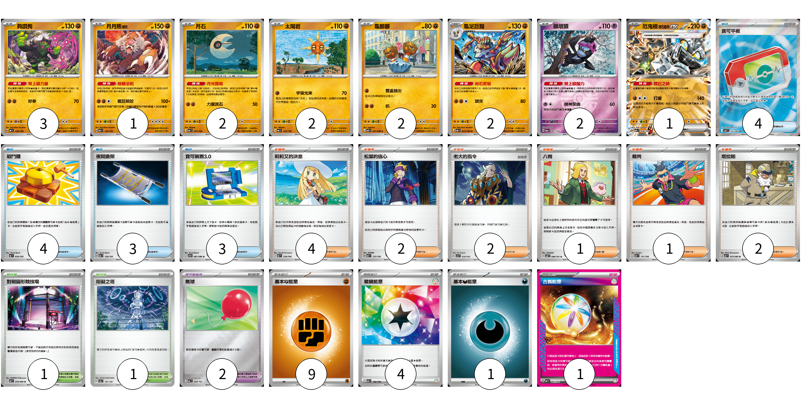 牌組構築方案 以此牌組為基礎新構築牌組 顯示卡面 顯示列表 寶可夢卡(15) 3 1 2 2 2 2 2 1 寶可夢道具(2) 2 物品卡(14) 4 4 3 3 支援者卡(12) 4 2 2 1 1 2 競技場卡(2) 1 1 能量卡(15) 9 4 1 1 寶可夢卡(15) 卡牌名稱 張數 卡牌名稱 張數 夠讚狗 MC 426/742 03 月月熊 赫月 MC 415/742 01 月石 MC 371/742 02 太陽岩 MC 372/742 02 龜腳腳 M3 041/080 02 龜足巨鎧 M3 042/080 02 願增猿 M2a 081/193 02 厄鬼椪 礎石面具ex MC 428/742 01 寶可夢道具(2) 卡牌名稱 張數 卡牌名稱 張數 氣球 MC 688/742 02 物品卡(14) 卡牌名稱 張數 卡牌名稱 張數 寶可平板 M3 103/080 04 戰鬥鑼 MC 654/742 04 夜間擔架 M2a 159/193 03 寶可裝置3.0 SV11B 081/086 03 支援者卡(12) 卡牌名稱 張數 卡牌名稱 張數 莉莉艾的決意 MC 729/742 04 松葉的信心 MC 727/742 02 老大的指令 SVK 036/042 02 八朔 SV6 098/101 01 裁判 MC 711/742 01 塔拉剛 M3 073/080 02 競技場卡(2) 卡牌名稱 張數 卡牌名稱 張數 對戰圓形競技場 M2 079/080 01 阻礙之塔 SV8a 181/187 01 能量卡(15) 卡牌名稱 張數 卡牌名稱 張數 基本【鬥】能量 MC FIG 09 稜鏡能量 M2a 192/193 04 基本【惡】能量 MC DAR 01 古舊能量 MC 741/742 01 以此牌組為基礎新構築牌組 牌組編碼 NTSCZo-fvfEgM-deKAqb copy 列印牌組單 牌組編碼已複製 分享至SNS