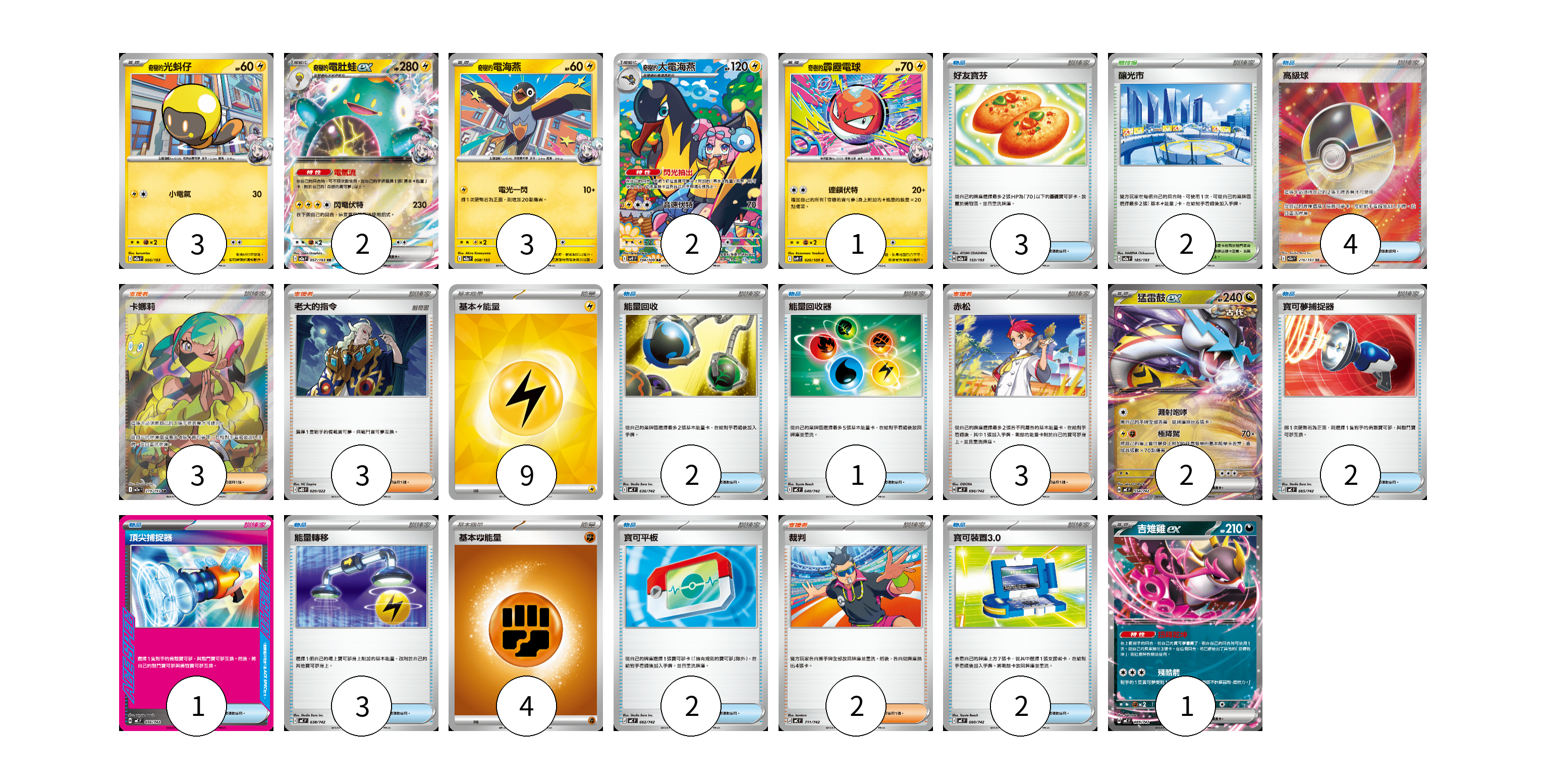 牌組構築方案 以此牌組為基礎新構築牌組 顯示卡面 顯示列表 寶可夢卡(14) 3 2 3 2 1 2 1 物品卡(20) 3 4 2 1 2 1 3 2 2 支援者卡(11) 3 3 3 2 競技場卡(2) 2 能量卡(13) 9 4 寶可夢卡(14) 卡牌名稱 張數 卡牌名稱 張數 奇樹的光蚪仔 M2a 056/193 03 奇樹的電肚蛙ex M2a 057/193 02 奇樹的電海燕 M2a 058/193 03 奇樹的大電海燕 SV9 104/100 02 奇樹的霹靂電球 SV9 026/100 01 猛雷鼓ex MC 554/742 02 吉雉雞ex MC 489/742 01 物品卡(20) 卡牌名稱 張數 卡牌名稱 張數 好友寶芬 M2a 153/193 03 高級球 M2a 216/193 04 能量回收 MC 636/742 02 能量回收器 MC 640/742 01 寶可夢捕捉器 MC 665/742 02 頂尖捕捉器 MC 656/742 01 能量轉移 MC 638/742 03 寶可平板 MC 662/742 02 寶可裝置3.0 MC 660/742 02 支援者卡(11) 卡牌名稱 張數 卡牌名稱 張數 卡娜莉 M2a 219/193 03 老大的指令 MBD 020/022 03 赤松 MC 696/742 03 裁判 MC 711/742 02 競技場卡(2) 卡牌名稱 張數 卡牌名稱 張數 釀光市 M2a 185/193 02 能量卡(13) 卡牌名稱 張數 卡牌名稱 張數 基本【雷】能量 SVQP LIG 09 基本【鬥】能量 MC FIG 04 以此牌組為基礎新構築牌組 牌組編碼 NUVDAI-nCSpzm-XfIjOT copy 列印牌組單 牌組編碼已複製 分享至SNS