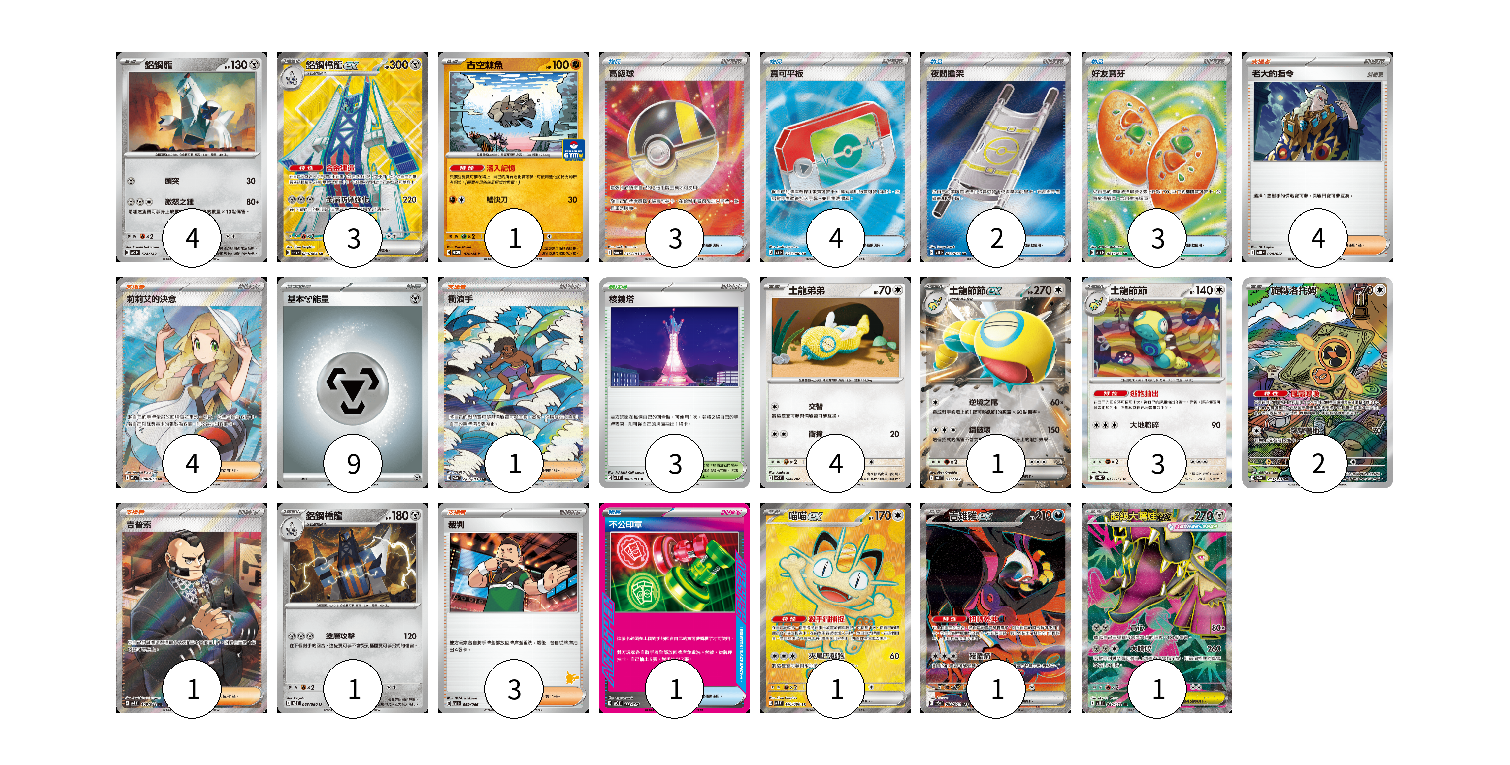 牌組構築方案 以此牌組為基礎新構築牌組 顯示卡面 顯示列表 寶可夢卡(22) 4 3 1 4 1 3 2 1 1 1 1 物品卡(13) 3 4 2 3 1 支援者卡(13) 4 4 1 1 3 競技場卡(3) 3 能量卡(9) 9 寶可夢卡(22) 卡牌名稱 張數 卡牌名稱 張數 鋁鋼龍 MC 524/742 04 鋁鋼橋龍ex SV7a 080/064 03 古空棘魚 M-P 078/M-P 01 土龍弟弟 MC 574/742 04 土龍節節ex MC 575/742 01 土龍節節 SV5K 057/071 03 旋轉洛托姆 M2a 213/193 02 鋁鋼橋龍 M2 063/080 01 喵喵ex M3 100/080 01 吉雉雞ex SV6a 089/064 01 超級大嘴娃ex M1L 080/063 01 物品卡(13) 卡牌名稱 張數 卡牌名稱 張數 高級球 M2a 216/193 03 寶可平板 M3 103/080 04 夜間擔架 M1L 083/063 02 好友寶芬 M1S 081/063 03 不公印章 MC 633/742 01 支援者卡(13) 卡牌名稱 張數 卡牌名稱 張數 老大的指令 MBD 020/022 04 莉莉艾的決意 M1L 086/063 04 衝浪手 M2a 249/193 01 吉普索 M4 109/083 01 裁判 SVI 059/066 03 競技場卡(3) 卡牌名稱 張數 卡牌名稱 張數 稜鏡塔 M4 080/083 03 能量卡(9) 卡牌名稱 張數 卡牌名稱 張數 基本【鋼】能量 MC MET 09 以此牌組為基礎新構築牌組 牌組編碼 NWUXOD-HMkngf-PPcwse copy 列印牌組單 牌組編碼已複製 分享至SNS