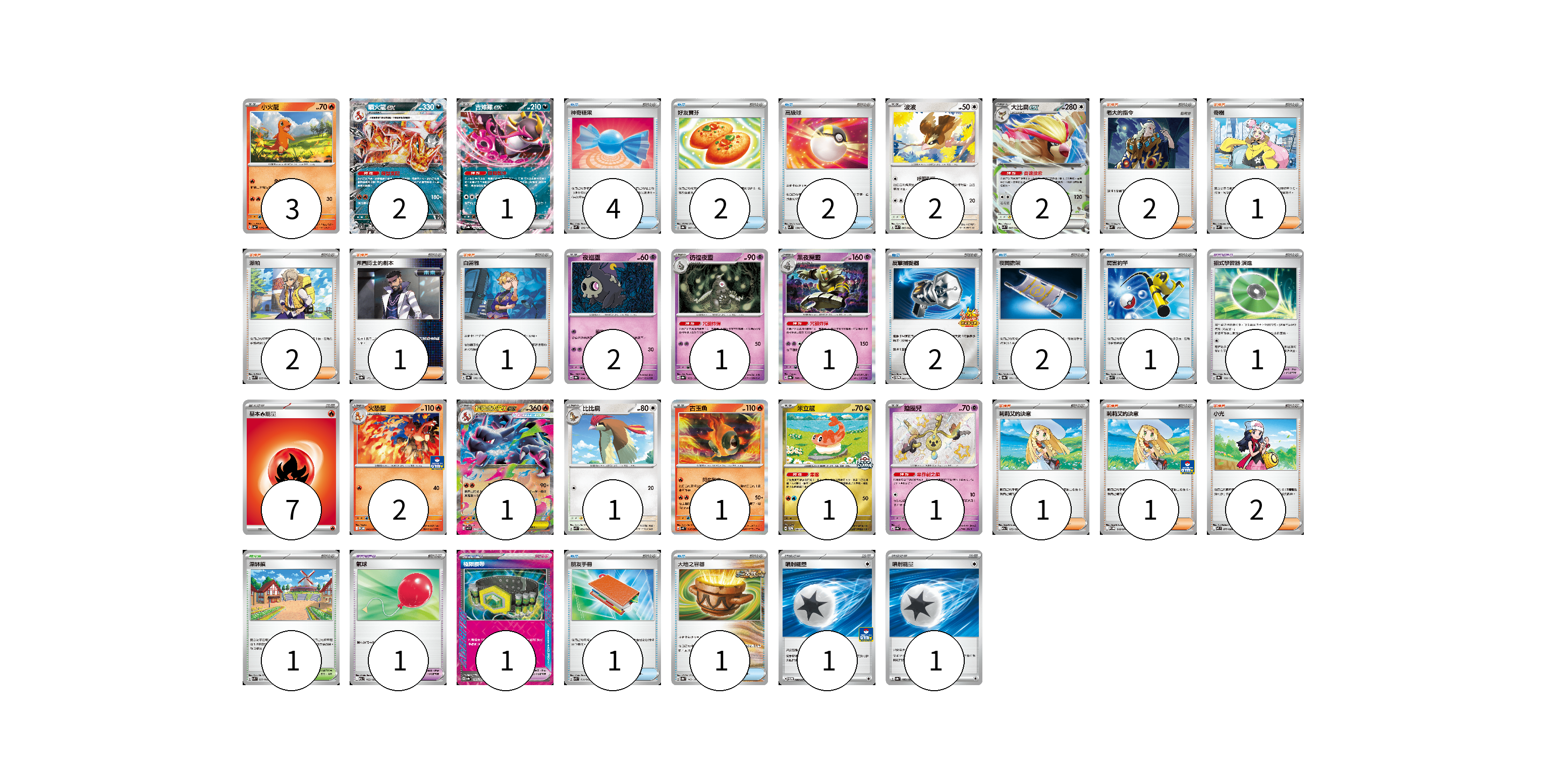 牌組構築方案 以此牌組為基礎新構築牌組 顯示卡面 顯示列表 寶可夢卡(21) 3 2 1 2 2 2 1 1 2 1 1 1 1 1 寶可夢道具(3) 1 1 1 物品卡(15) 4 2 2 2 2 1 1 1 支援者卡(11) 2 1 2 1 1 1 1 2 競技場卡(1) 1 能量卡(9) 7 1 1 寶可夢卡(21) 卡牌名稱 張數 卡牌名稱 張數 小火龍 SV4a 025/190 03 噴火龍ex SVTL 006/021 02 吉雉雞ex SV8a 104/187 01 波波 SVK 003/042 02 大比鳥ex SVK 005/042 02 夜巡靈 SV8a 064/187 02 彷徨夜靈 SV8a 065/187 01 黑夜魔靈 SV8a 066/187 01 火恐龍 M-P 042/M-P 02 超級噴火龍Xex M2 013/080 01 比比鳥 SVK 004/042 01 古玉魚 SV4K 016/066 01 米立龍 SV-P 186/SV-P 01 鑰圈兒 SV4a 264/190 01 寶可夢道具(3) 卡牌名稱 張數 卡牌名稱 張數 招式學習器 演進 SV8a 160/187 01 氣球 M2a 165/193 01 極限腰帶 SV8a 159/187 01 物品卡(15) 卡牌名稱 張數 卡牌名稱 張數 神奇糖果 SVM 135/175 04 好友寶芬 SV8a 147/187 02 高級球 SVM 134/175 02 反擊捕捉器 SV-P 083/SV-P 02 夜間擔架 SV8a 151/187 02 厲害釣竿 SVK 011/042 01 朋友手冊 SVK 014/042 01 大地之容器 SV8a 143/187 01 支援者卡(11) 卡牌名稱 張數 卡牌名稱 張數 老大的指令 SVM 172/175 02 奇樹 SVM 160/175 01 派帕 SVK 035/042 02 弗圖博士的劇本 SV8a 175/187 01 白蕾雅 SV8a 176/187 01 莉莉艾的決意 M2a 175/193 01 莉莉艾的決意 M-P 018/M-P 01 小光 M2 077/080 02 競技場卡(1) 卡牌名稱 張數 卡牌名稱 張數 深缽鎮 SVK 039/042 01 能量卡(9) 卡牌名稱 張數 卡牌名稱 張數 基本【火】能量 SVTL FIR 07 噴射能量 SV-P 180/SV-P 01 噴射能量 SV8a 185/187 01 以此牌組為基礎新構築牌組 牌組編碼 NXGWNS-tSituI-zqvPDk copy 列印牌組單 牌組編碼已複製 分享至SNS
