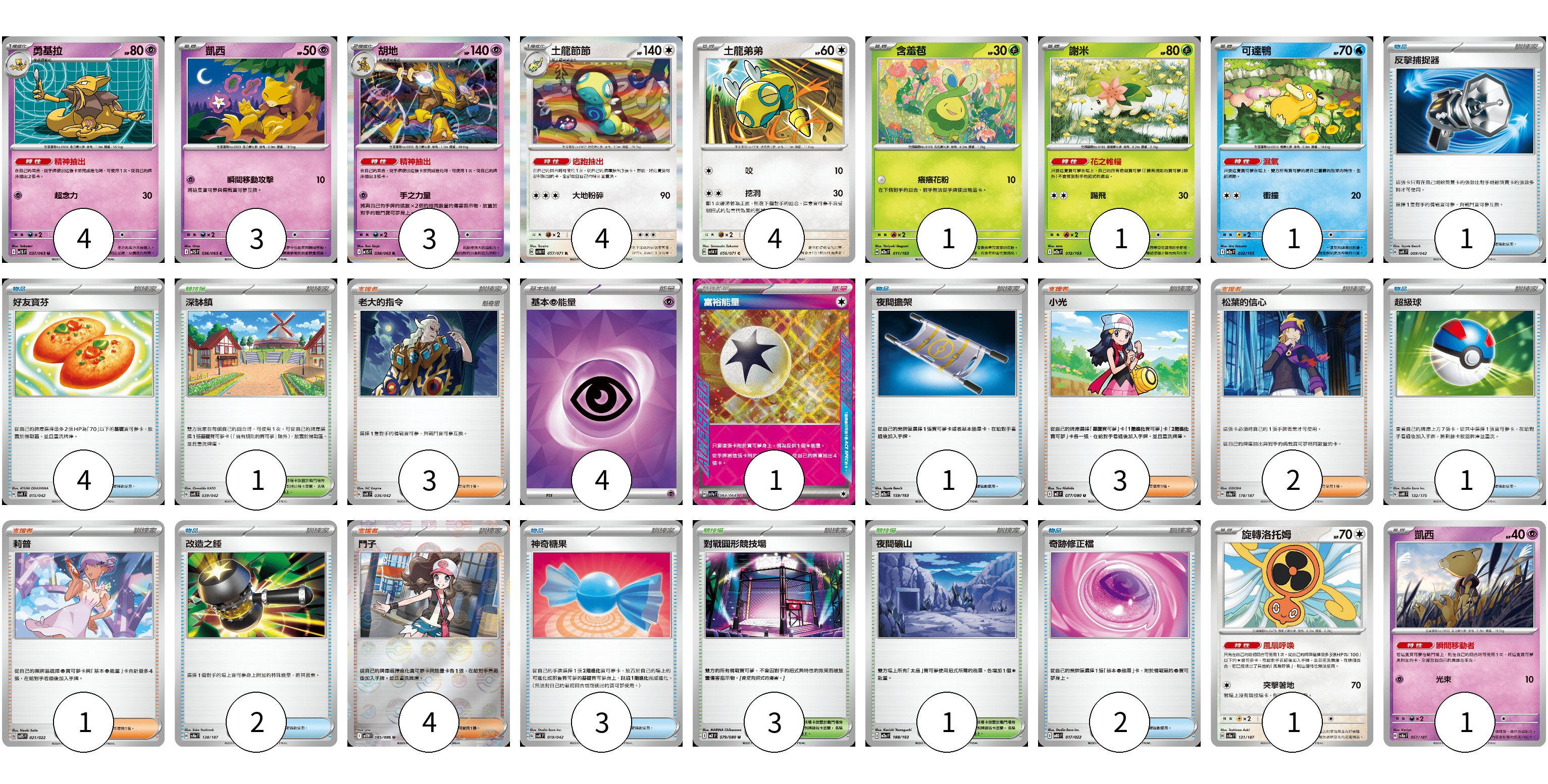 牌組構築方案 以此牌組為基礎新構築牌組 顯示卡面 顯示列表 寶可夢卡(23) 4 3 3 4 4 1 1 1 1 1 物品卡(14) 1 4 1 1 2 3 2 支援者卡(13) 3 3 2 1 4 競技場卡(5) 1 3 1 能量卡(5) 4 1 寶可夢卡(23) 卡牌名稱 張數 卡牌名稱 張數 勇基拉 M1S 037/063 04 凱西 M1S 036/063 03 胡地 M1S 038/063 03 土龍節節 SV5K 057/071 04 土龍弟弟 SV5K 056/071 04 含羞苞 M2a 011/193 01 謝米 M2a 012/193 01 可達鴨 M2a 032/193 01 旋轉洛托姆 SV8a 131/187 01 凱西 SV8a 057/187 01 物品卡(14) 卡牌名稱 張數 卡牌名稱 張數 反擊捕捉器 SVK 009/042 01 好友寶芬 SVK 015/042 04 夜間擔架 M2a 159/193 01 超級球 SVM 132/175 01 改造之錘 SV8a 138/187 02 神奇糖果 SVK 019/042 03 奇跡修正檔 MBD 017/022 02 支援者卡(13) 卡牌名稱 張數 卡牌名稱 張數 老大的指令 SVK 036/042 03 小光 M2 077/080 03 松葉的信心 SV8a 178/187 02 莉普 SVTS 021/022 01 鬥子 SV11W 085/086 04 競技場卡(5) 卡牌名稱 張數 卡牌名稱 張數 深缽鎮 SVK 039/042 01 對戰圓形競技場 M2 079/080 03 夜間礦山 M2a 188/193 01 能量卡(5) 卡牌名稱 張數 卡牌名稱 張數 基本【超】能量 SVK PSY 04 富裕能量 SV7a 064/064 01 以此牌組為基礎新構築牌組 牌組編碼 NYuuDt-zvLnNz-gVBIpU copy 列印牌組單 牌組編碼已複製 分享至SNS