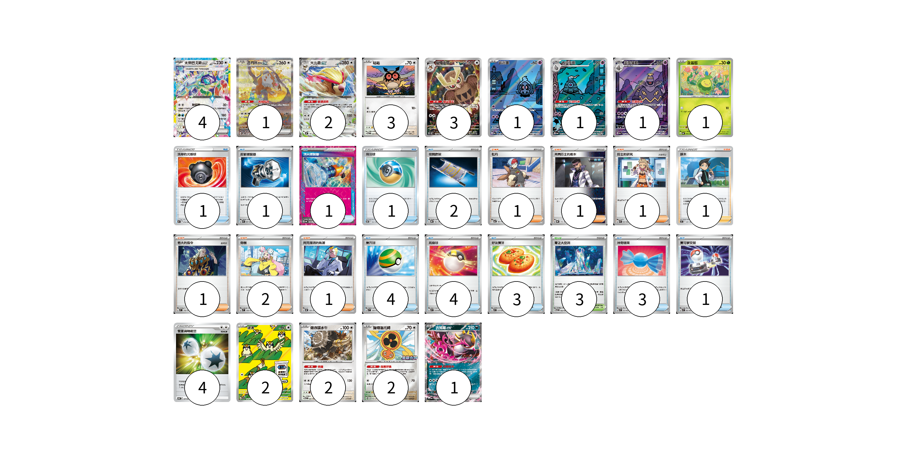 牌組構築方案 以此牌組為基礎新構築牌組 顯示卡面 顯示列表 寶可夢卡(24) 4 1 2 3 3 1 1 1 1 2 2 2 1 物品卡(21) 1 1 1 1 2 4 4 3 3 1 支援者卡(8) 1 1 1 1 1 2 1 競技場卡(3) 3 能量卡(4) 4 寶可夢卡(24) 卡牌名稱 張數 卡牌名稱 張數 太樂巴戈斯ex SV8a 136/187 04 月月熊 赫月 ex SV5a 091/066 01 大比鳥ex SV4a 139/190 02 咕咕 SV7 076/102 03 貓頭夜鷹 SV7 114/102 03 夜巡靈 SV6a 068/064 01 彷徨夜靈 SV6a 069/064 01 黑夜魔靈 SV6a 070/064 01 含羞苞 SV8a 001/187 01 波波 SV3 118/108 02 爆炸頭水牛 SV7 081/102 02 旋轉洛托姆 SV-P 146/SV-P 02 吉雉雞ex SV6a 038/064 01 物品卡(21) 卡牌名稱 張數 卡牌名稱 張數 洗翠的沉重球 SVF 019/038 01 反擊捕捉器 SVK 009/042 01 頂尖捕捉器 SV8a 148/187 01 飛羽球 S10D 063/067 01 夜間擔架 SV8a 151/187 02 巢穴球 SVM 133/175 04 高級球 SVK 018/042 04 好友寶芬 SVK 015/042 03 神奇糖果 SVK 019/042 03 寶可夢交替 SVK 022/042 01 支援者卡(8) 卡牌名稱 張數 卡牌名稱 張數 牡丹 SV4a 182/190 01 弗圖博士的劇本 SV8a 175/187 01 博士的研究 SVK 032/042 01 捩木 S11 097/100 01 老大的指令 SVM 172/175 01 奇樹 SVM 160/175 02 阿克羅瑪的執著 SV8a 164/187 01 競技場卡(3) 卡牌名稱 張數 卡牌名稱 張數 零之大空洞 SV7 102/102 03 能量卡(4) 卡牌名稱 張數 卡牌名稱 張數 雙重渦輪能量 SVTR 021/021 04 以此牌組為基礎新構築牌組 牌組編碼 NZqbtG-QLQovA-lmOqPZ copy 列印牌組單 牌組編碼已複製 分享至SNS