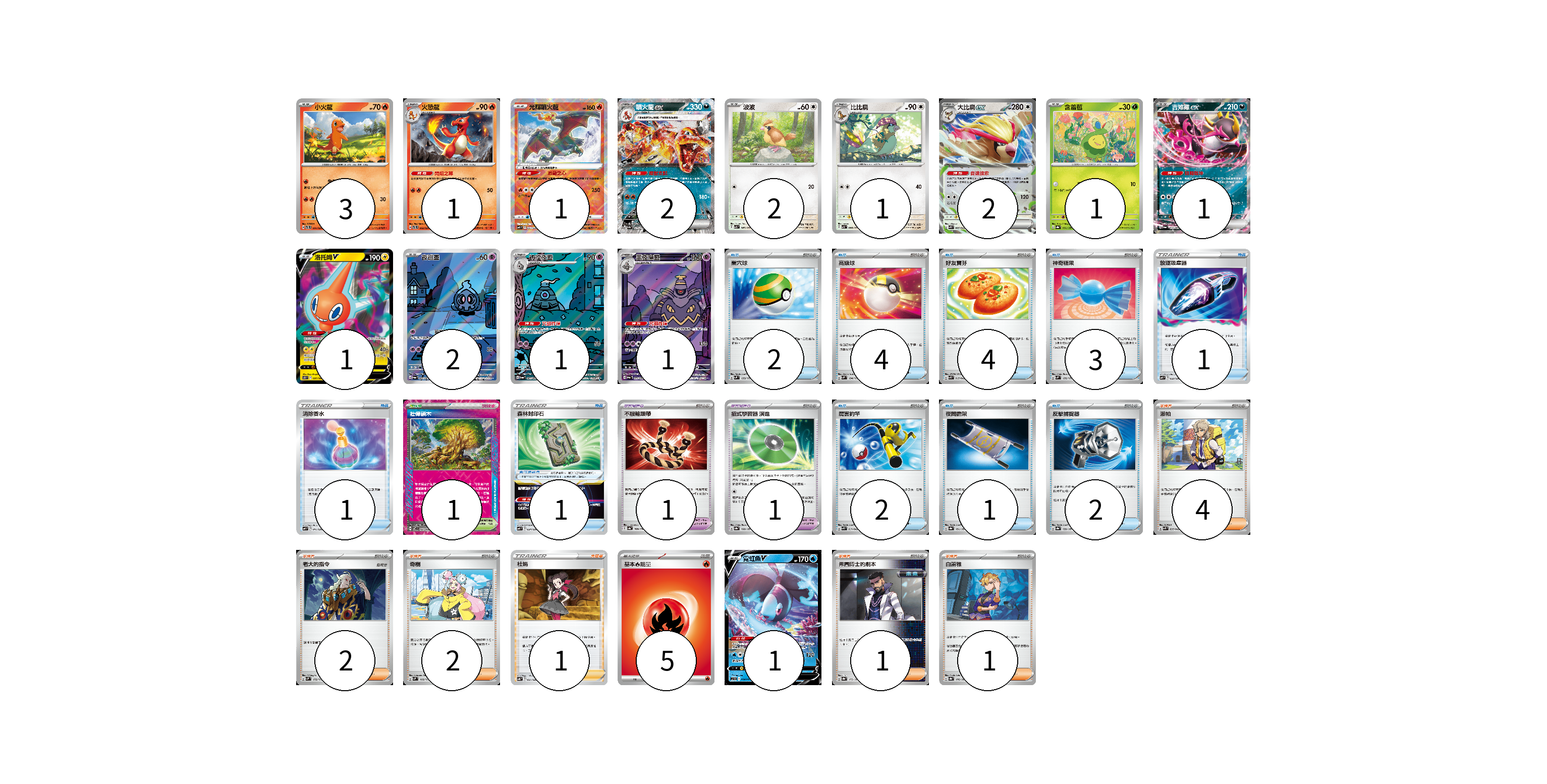 牌組構築方案 以此牌組為基礎新構築牌組 顯示卡面 顯示列表 寶可夢卡(20) 3 1 1 2 2 1 2 1 1 1 2 1 1 1 寶可夢道具(2) 1 1 物品卡(21) 2 4 4 3 1 1 1 2 1 2 支援者卡(11) 4 2 2 1 1 1 競技場卡(1) 1 能量卡(5) 5 寶可夢卡(20) 卡牌名稱 張數 卡牌名稱 張數 小火龍 SVTL 001/021 03 火恐龍 SVTL 002/021 01 光輝噴火龍 SVF 001/038 01 噴火龍ex SV4a 115/190 02 波波 SV3 087/108 02 比比鳥 SV3 088/108 01 大比鳥ex SVK 005/042 02 含羞苞 SV8a 001/187 01 吉雉雞ex SV6a 038/064 01 洛托姆V S11 037/100 01 夜巡靈 SV6a 068/064 02 彷徨夜靈 SV6a 069/064 01 黑夜魔靈 SV6a 070/064 01 霓虹魚V SVHK 004/022 01 寶可夢道具(2) 卡牌名稱 張數 卡牌名稱 張數 不服輸頭帶 SV4a 168/190 01 招式學習器 演進 SV8a 160/187 01 物品卡(21) 卡牌名稱 張數 卡牌名稱 張數 巢穴球 SVM 133/175 02 高級球 SVM 134/175 04 好友寶芬 SVK 015/042 04 神奇糖果 SVM 135/175 03 放逐吸塵器 SVF 023/038 01 消除香水 SVF 011/038 01 森林封印石 SVF 024/038 01 厲害釣竿 SVK 011/042 02 夜間擔架 SV8a 151/187 01 反擊捕捉器 SV8a 139/187 02 支援者卡(11) 卡牌名稱 張數 卡牌名稱 張數 派帕 SVK 035/042 04 老大的指令 SVM 172/175 02 奇樹 SVM 160/175 02 杜娟 SVB 021/028 01 弗圖博士的劇本 SV8a 175/187 01 白蕾雅 SV8a 176/187 01 競技場卡(1) 卡牌名稱 張數 卡牌名稱 張數 壯偉碩木 SV7 101/102 01 能量卡(5) 卡牌名稱 張數 卡牌名稱 張數 基本火能量 sv-p FIR 05 以此牌組為基礎新構築牌組 牌組編碼 NcPyVc-MWNVFk-WhkhNV copy 列印牌組單 牌組編碼已複製 分享至SNS