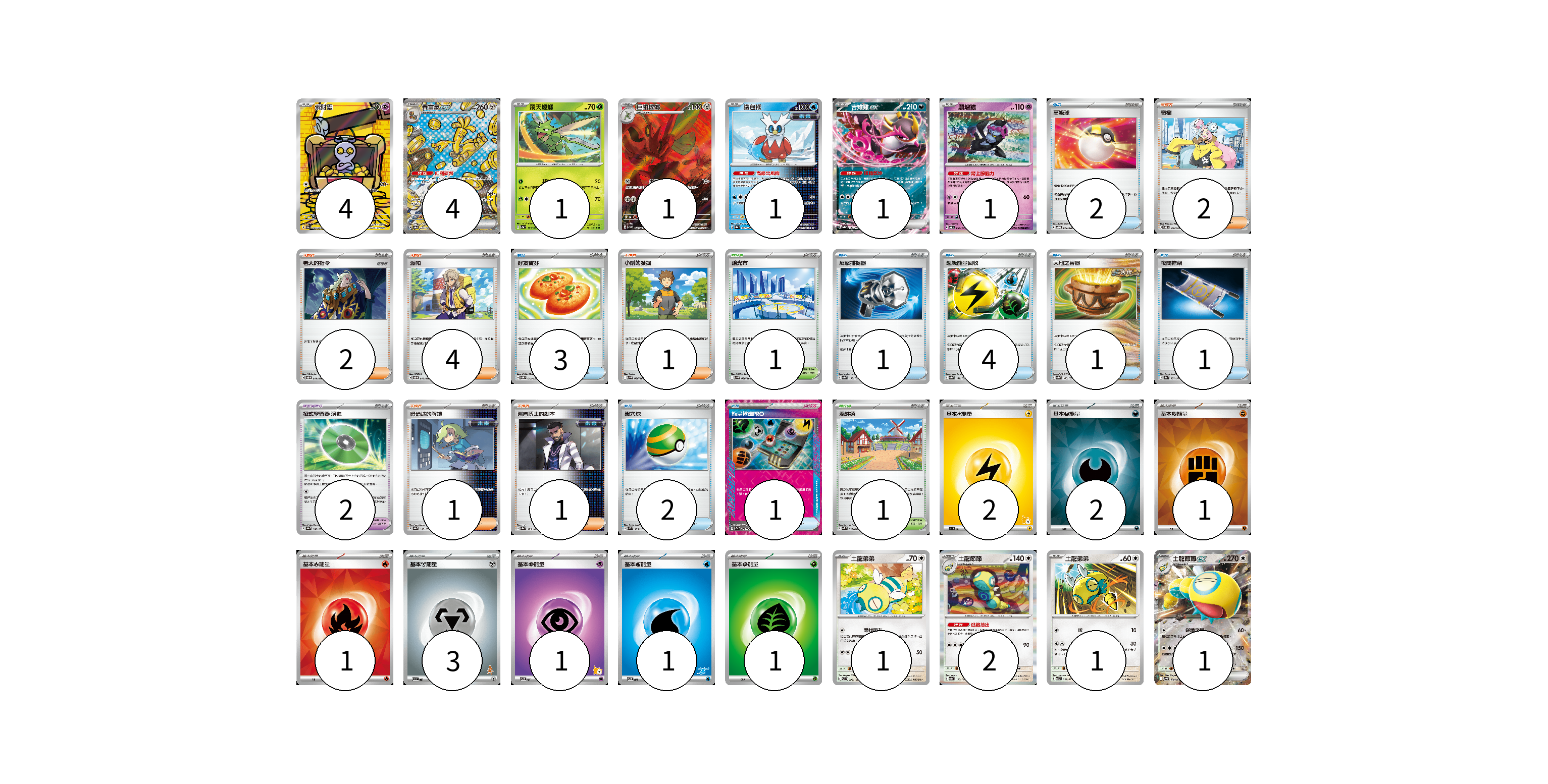 牌組構築方案 以此牌組為基礎新構築牌組 顯示卡面 顯示列表 寶可夢卡(18) 4 4 1 1 1 1 1 1 2 1 1 寶可夢道具(2) 2 物品卡(15) 2 3 1 4 1 1 2 1 支援者卡(11) 2 2 4 1 1 1 競技場卡(2) 1 1 能量卡(12) 2 2 1 1 3 1 1 1 寶可夢卡(18) 卡牌名稱 張數 卡牌名稱 張數 索財靈 SV3a 068/062 04 賽富豪ex SV8a 220/187 04 飛天螳螂 SV2a 123/165 01 巨鉗螳螂 SV3 116/108 01 鐵包袱 SV8a 047/187 01 吉雉雞ex SV8a 104/187 01 願增猿 SV6 055/101 01 土龍弟弟 SVD 092/139 01 土龍節節 SV8a 130/187 02 土龍弟弟 SV5K 056/071 01 土龍節節ex SV9 079/100 01 寶可夢道具(2) 卡牌名稱 張數 卡牌名稱 張數 招式學習器 演進 SV8a 160/187 02 物品卡(15) 卡牌名稱 張數 卡牌名稱 張數 高級球 SVOD 012/020 02 好友寶芬 SVOM 012/021 03 反擊捕捉器 SV8a 139/187 01 超級能量回收 SV8a 141/187 04 大地之容器 SV8a 143/187 01 夜間擔架 SV8a 151/187 01 巢穴球 SVM 133/175 02 能量輸送PRO SV7a 052/064 01 支援者卡(11) 卡牌名稱 張數 卡牌名稱 張數 奇樹 SVOD 016/020 02 老大的指令 SVOD 019/020 02 派帕 SVOD 018/020 04 小剛的發掘 SV9 096/100 01 暗碼迷的解讀 SV8a 165/187 01 弗圖博士的劇本 SV8a 175/187 01 競技場卡(2) 卡牌名稱 張數 卡牌名稱 張數 釀光市 SV9 098/100 01 深缽鎮 SVK 039/042 01 能量卡(12) 卡牌名稱 張數 卡牌名稱 張數 基本【雷】能量 SVI LIG 02 基本【惡】能量 SVK DAR 02 基本【鬥】能量 SVK FIG 01 基本【火】能量 SVK FIR 01 基本【鋼】能量 SVI MET 03 基本【超】能量 SVI PSY 01 基本【水】能量 SVI WAT 01 基本【草】能量 SVTM GRA 01 以此牌組為基礎新構築牌組 牌組編碼 NdMCwn-eFcJUn-cHSgfz copy 列印牌組單 牌組編碼已複製 分享至SNS