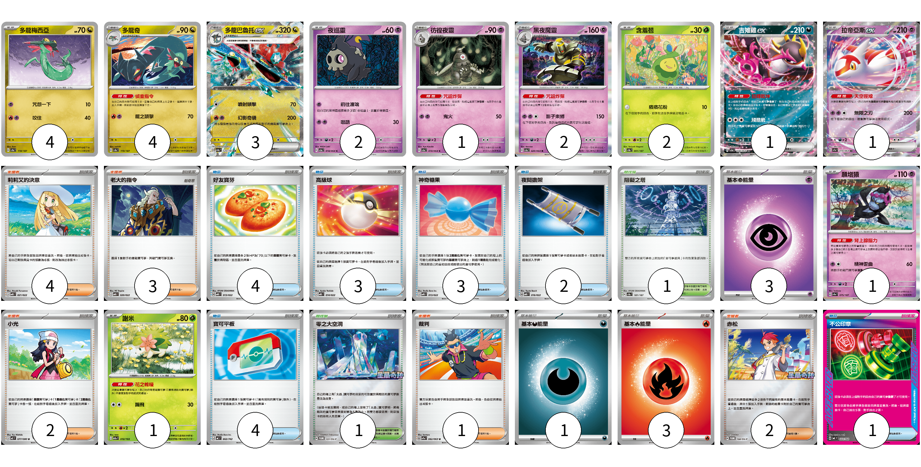牌組構築方案 以此牌組為基礎新構築牌組 顯示卡面 顯示列表 寶可夢卡(22) 4 4 3 2 1 2 2 1 1 1 1 物品卡(17) 4 3 3 2 4 1 支援者卡(12) 4 3 2 1 2 競技場卡(2) 1 1 能量卡(7) 3 1 3 寶可夢卡(22) 卡牌名稱 張數 卡牌名稱 張數 多龍梅西亞 SV8a 118/187 04 多龍奇 SV8a 119/187 04 多龍巴魯托ex SV8a 120/187 03 夜巡靈 SV6a 018/064 02 彷徨夜靈 SV6a 019/064 01 黑夜魔靈 SV6a 020/064 02 含羞苞 SV8a 001/187 02 吉雉雞ex SV6a 038/064 01 拉帝亞斯ex SV7a 019/064 01 願增猿 SV8a 075/187 01 謝米 M2a 012/193 01 物品卡(17) 卡牌名稱 張數 卡牌名稱 張數 好友寶芬 MBD 013/022 04 高級球 MBD 014/022 03 神奇糖果 MBG 013/022 03 夜間擔架 MBD 016/022 02 寶可平板 MC 662/742 04 不公印章 MC 633/742 01 支援者卡(12) 卡牌名稱 張數 卡牌名稱 張數 莉莉艾的決意 MBD 021/022 04 老大的指令 MBD 020/022 03 小光 M2 077/080 02 裁判 SV9a 062/063 01 赤松 SV-P 150/SV-P 02 競技場卡(2) 卡牌名稱 張數 卡牌名稱 張數 阻礙之塔 SV8a 181/187 01 零之大空洞 SV-P 151/SV-P 01 能量卡(7) 卡牌名稱 張數 卡牌名稱 張數 基本【超】能量 MBD PSY 03 基本【惡】能量 MC DAR 01 基本【火】能量 MC FIR 03 以此牌組為基礎新構築牌組 牌組編碼 NdzebK-LoEkFL-mHjCnq copy 列印牌組單 牌組編碼已複製 分享至SNS