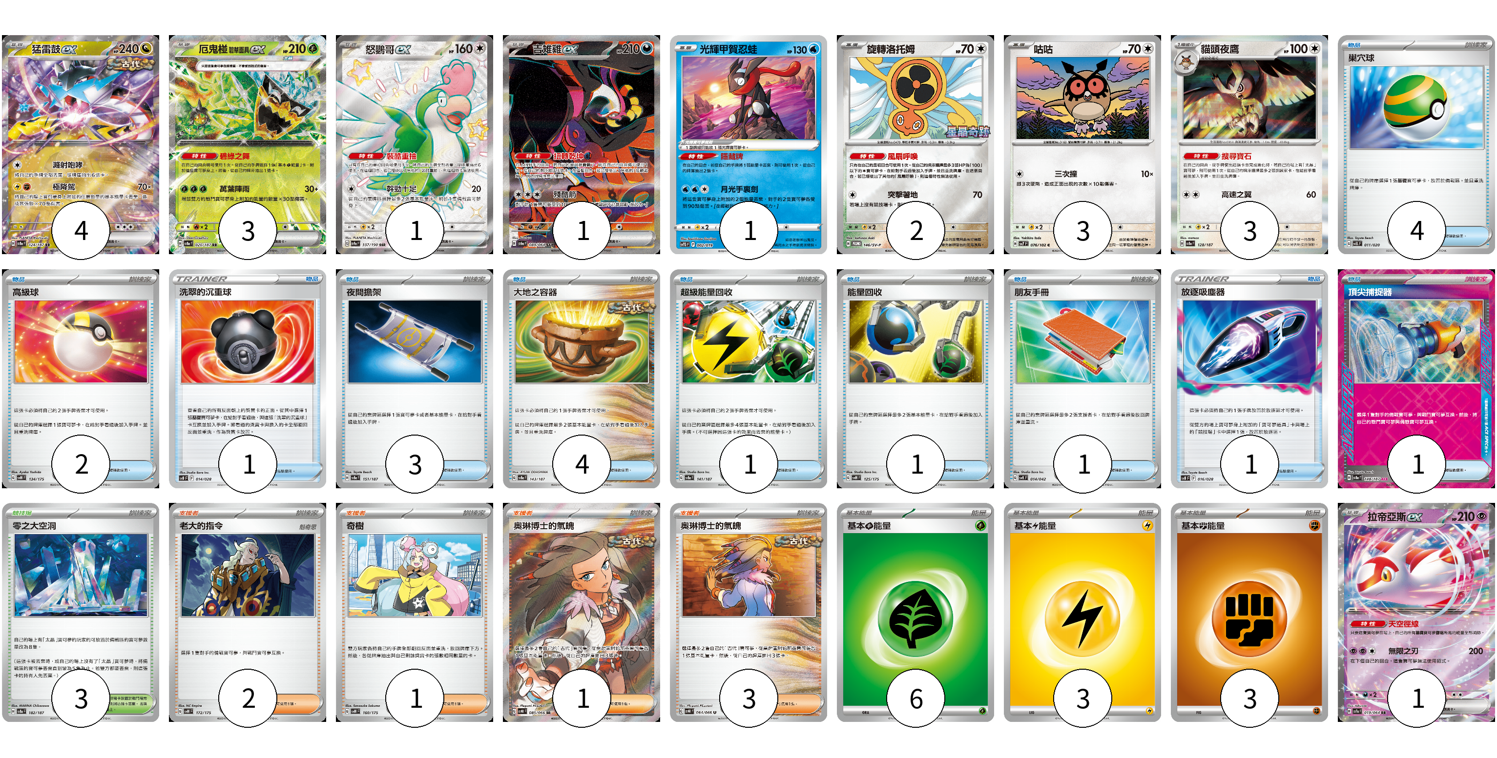 牌組構築方案 以此牌組為基礎新構築牌組 顯示卡面 顯示列表 寶可夢卡(19) 4 3 1 1 1 2 3 3 1 物品卡(19) 4 2 1 3 4 1 1 1 1 1 支援者卡(7) 2 1 1 3 競技場卡(3) 3 能量卡(12) 6 3 3 寶可夢卡(19) 卡牌名稱 張數 卡牌名稱 張數 猛雷鼓ex SV8a 124/187 04 厄鬼椪 碧草面具ex SV8a 020/187 03 怒鸚哥ex SV4a 337/190 01 吉雉雞ex SV6a 089/064 01 光輝甲賀忍蛙 SVTG 002/019 01 旋轉洛托姆 SV-P 146/SV-P 02 咕咕 SV7 076/102 03 貓頭夜鷹 SV8a 128/187 03 拉帝亞斯ex SV7a 019/064 01 物品卡(19) 卡牌名稱 張數 卡牌名稱 張數 巢穴球 SVEL 011/020 04 高級球 SVM 134/175 02 洗翠的沉重球 SVB 014/028 01 夜間擔架 SV8a 151/187 03 大地之容器 SV8a 143/187 04 超級能量回收 SV8a 141/187 01 能量回收 SVM 125/175 01 朋友手冊 SVK 014/042 01 放逐吸塵器 SVB 016/028 01 頂尖捕捉器 SV8a 148/187 01 支援者卡(7) 卡牌名稱 張數 卡牌名稱 張數 老大的指令 SVM 172/175 02 奇樹 SVM 160/175 01 奧琳博士的氣魄 SV4K 085/066 01 奧琳博士的氣魄 SV4K 064/066 03 競技場卡(3) 卡牌名稱 張數 卡牌名稱 張數 零之大空洞 SV8a 182/187 03 能量卡(12) 卡牌名稱 張數 卡牌名稱 張數 基本【草】能量 SVTM GRA 06 基本【雷】能量 SVTR LIG 03 基本【鬥】能量 SVTG FIG 03 以此牌組為基礎新構築牌組 牌組編碼 NgeNoQ-ploPFd-RcbTrW copy 列印牌組單 牌組編碼已複製 分享至SNS