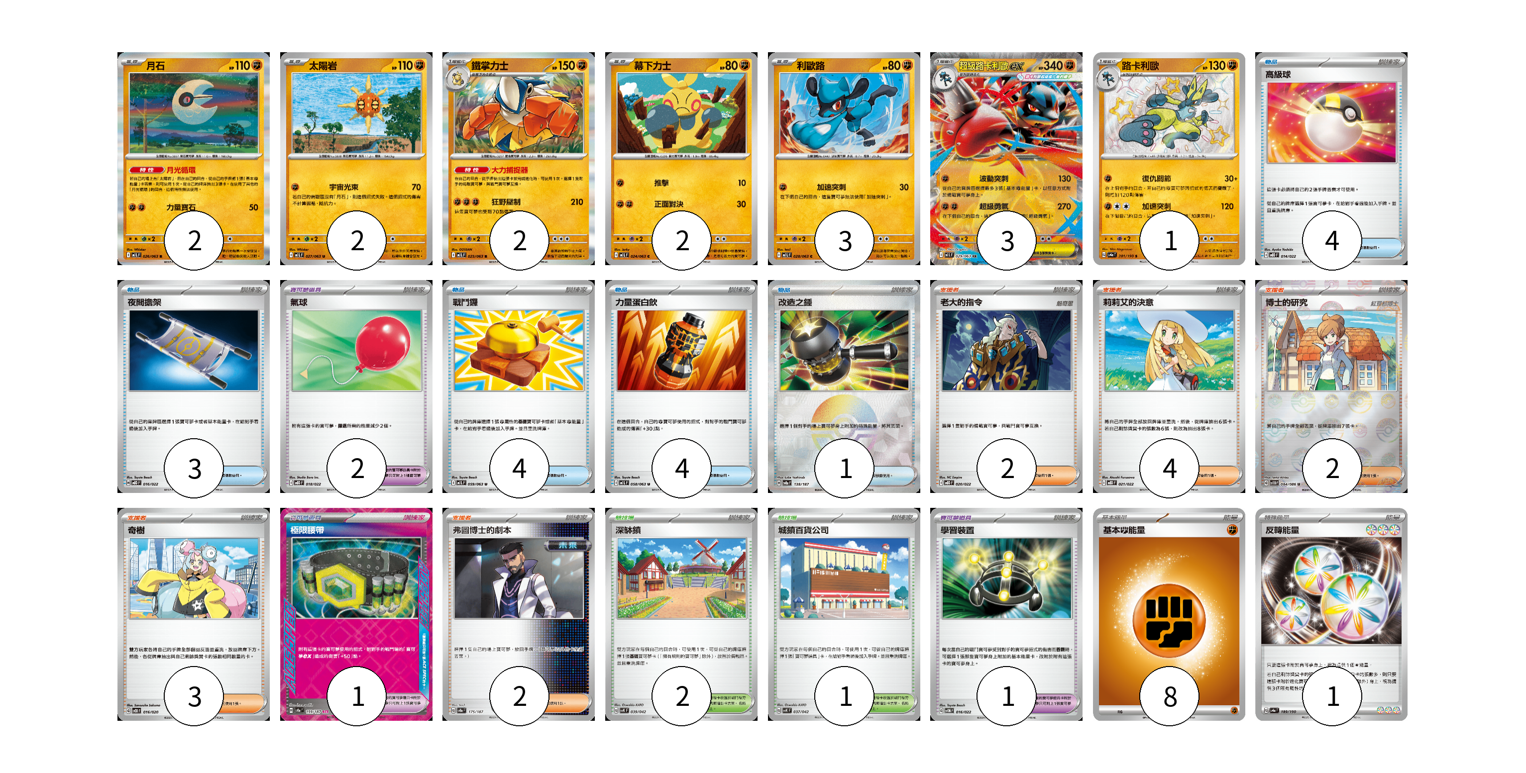牌組構築方案 以此牌組為基礎新構築牌組 顯示卡面 顯示列表 寶可夢卡(15) 2 2 2 2 3 3 1 寶可夢道具(2) 1 1 物品卡(18) 4 3 2 4 4 1 支援者卡(13) 2 4 2 3 2 競技場卡(3) 2 1 能量卡(9) 8 1 寶可夢卡(15) 卡牌名稱 張數 卡牌名稱 張數 月石 M1L 026/063 02 太陽岩 M1L 027/063 02 鐵掌力士 M1L 025/063 02 幕下力士 M1L 024/063 02 利歐路 M1L 028/063 03 超級路卡利歐ex M1L 029/063 03 路卡利歐 SV4a 281/190 01 寶可夢道具(2) 卡牌名稱 張數 卡牌名稱 張數 極限腰帶 SV8a 159/187 01 學習裝置 SVTM 016/022 01 物品卡(18) 卡牌名稱 張數 卡牌名稱 張數 高級球 MBD 014/022 04 夜間擔架 MBD 016/022 03 氣球 MBD 018/022 02 戰鬥鑼 M1L 059/063 04 力量蛋白飲 M1L 058/063 04 改造之錘 SV8a 138/187 01 支援者卡(13) 卡牌名稱 張數 卡牌名稱 張數 老大的指令 MBD 020/022 02 莉莉艾的決意 MBD 021/022 04 博士的研究 SV11B 084/086 02 奇樹 SVOD 016/020 03 弗圖博士的劇本 SV8a 175/187 02 競技場卡(3) 卡牌名稱 張數 卡牌名稱 張數 深缽鎮 SVK 039/042 02 城鎮百貨公司 SVK 037/042 01 能量卡(9) 卡牌名稱 張數 卡牌名稱 張數 基本【鬥】能量 M-P FIG 08 反轉能量 SV4a 189/190 01 以此牌組為基礎新構築牌組 牌組編碼 NhvPsE-afwecI-ibFpmC copy 列印牌組單 牌組編碼已複製 分享至SNS