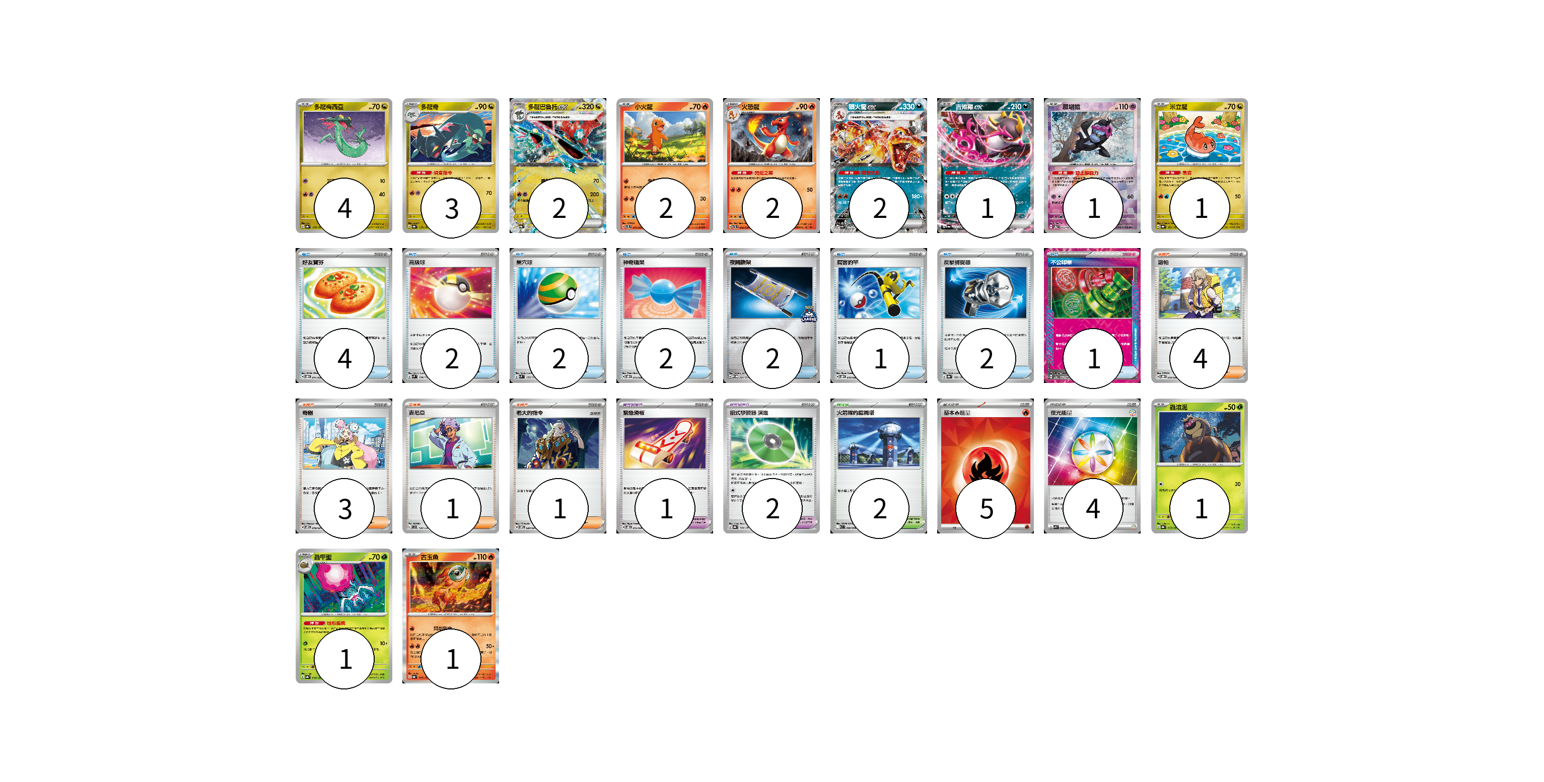 牌組構築方案 以此牌組為基礎新構築牌組 顯示卡面 顯示列表 寶可夢卡(21) 4 3 2 2 2 2 1 1 1 1 1 1 寶可夢道具(3) 1 2 物品卡(16) 4 2 2 2 2 1 2 1 支援者卡(9) 4 3 1 1 競技場卡(2) 2 能量卡(9) 5 4 寶可夢卡(21) 卡牌名稱 張數 卡牌名稱 張數 多龍梅西亞 SV8a 118/187 04 多龍奇 SV8a 119/187 03 多龍巴魯托ex SV8a 120/187 02 小火龍 SVTL 001/021 02 火恐龍 SVTL 002/021 02 噴火龍ex SV4a 115/190 02 吉雉雞ex SV6a 038/064 01 願增猿 SV8a 075/187 01 米立龍 SV8a 121/187 01 蟲滾泥 SV8a 013/187 01 蟲甲聖 SV8a 014/187 01 古玉魚 SV8a 025/187 01 寶可夢道具(3) 卡牌名稱 張數 卡牌名稱 張數 緊急滑板 SVOD 015/020 01 招式學習器 演進 SV8a 160/187 02 物品卡(16) 卡牌名稱 張數 卡牌名稱 張數 好友寶芬 SVOD 011/020 04 高級球 SVM 134/175 02 巢穴球 SVM 133/175 02 神奇糖果 SVOD 013/020 02 夜間擔架 SV-P 204/SV-P 02 厲害釣竿 SVOD 010/020 01 反擊捕捉器 SV8a 139/187 02 不公印章 SV5a 053/066 01 支援者卡(9) 卡牌名稱 張數 卡牌名稱 張數 派帕 SVOD 018/020 04 奇樹 SVOM 018/021 03 吉尼亞 SVD 129/139 01 老大的指令 SVOM 020/021 01 競技場卡(2) 卡牌名稱 張數 卡牌名稱 張數 火箭隊的監視塔 SV10 096/098 02 能量卡(9) 卡牌名稱 張數 卡牌名稱 張數 基本【火】能量 SVK FIR 05 夜光能量 SVK 042/042 04 以此牌組為基礎新構築牌組 牌組編碼 NleDel-kSdmDD-uhMnXd copy 列印牌組單 牌組編碼已複製 分享至SNS