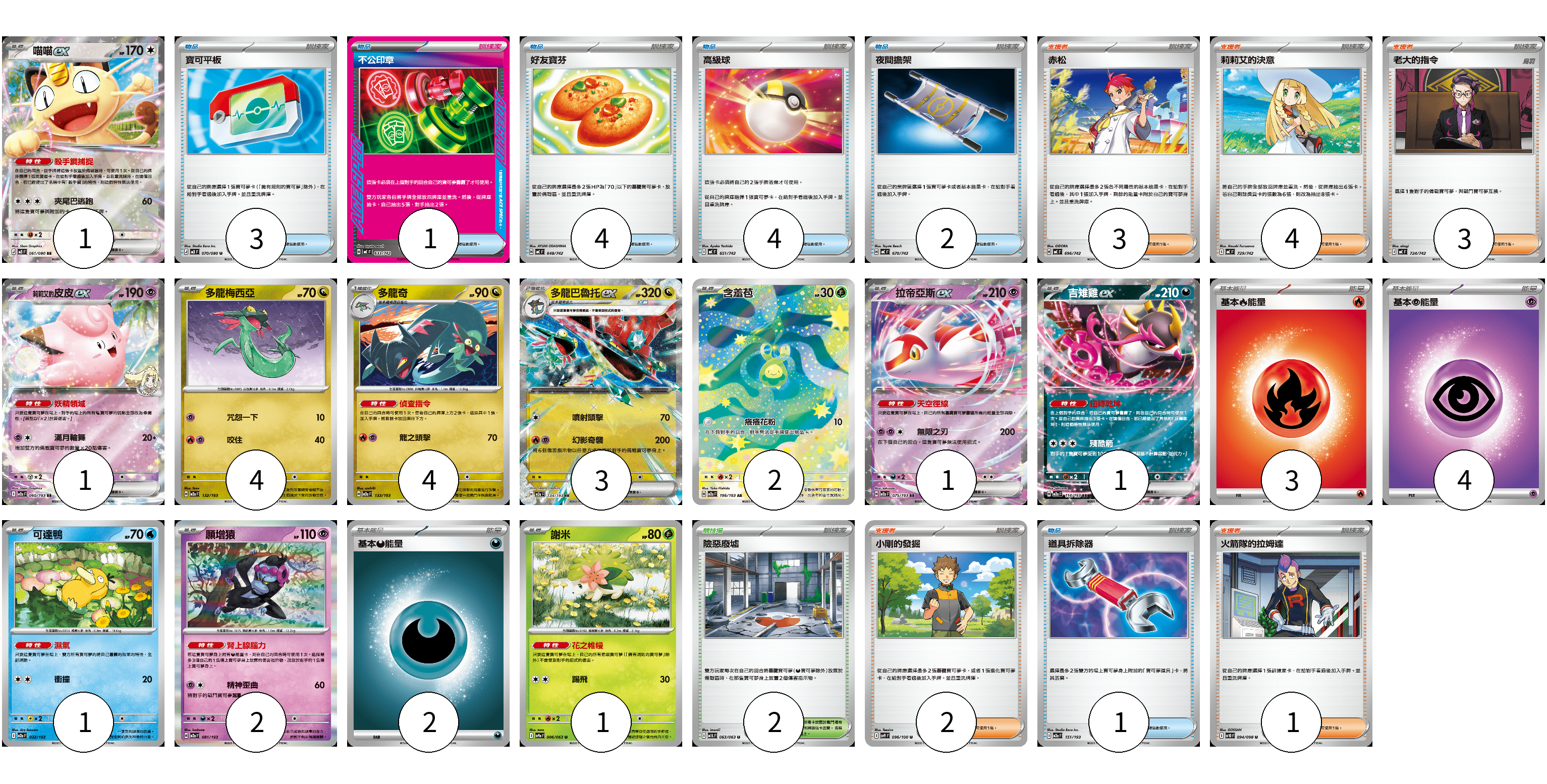 牌組構築方案 以此牌組為基礎新構築牌組 顯示卡面 顯示列表 寶可夢卡(21) 1 1 4 4 3 2 1 1 1 2 1 物品卡(15) 3 1 4 4 2 1 支援者卡(13) 3 4 3 2 1 競技場卡(2) 2 能量卡(9) 3 4 2 寶可夢卡(21) 卡牌名稱 張數 卡牌名稱 張數 喵喵ex M3 061/080 01 莉莉艾的皮皮ex M2a 060/193 01 多龍梅西亞 M2a 132/193 04 多龍奇 M2a 133/193 04 多龍巴魯托ex M2a 134/193 03 含羞苞 M2a 196/193 02 拉帝亞斯ex M2a 075/193 01 吉雉雞ex M2a 114/193 01 可達鴨 M2a 032/193 01 願增猿 M2a 081/193 02 謝米 SV9a 006/063 01 物品卡(15) 卡牌名稱 張數 卡牌名稱 張數 寶可平板 M3 070/080 03 不公印章 MC 633/742 01 好友寶芬 MC 648/742 04 高級球 MC 651/742 04 夜間擔架 MC 670/742 02 道具拆除器 M2a 151/193 01 支援者卡(13) 卡牌名稱 張數 卡牌名稱 張數 赤松 MC 696/742 03 莉莉艾的決意 MC 729/742 04 老大的指令 MC 724/742 03 小剛的發掘 SV9 096/100 02 火箭隊的拉姆達 SV10 094/098 01 競技場卡(2) 卡牌名稱 張數 卡牌名稱 張數 險惡廢墟 M1L 063/063 02 能量卡(9) 卡牌名稱 張數 卡牌名稱 張數 基本【火】能量 MC FIR 03 基本【超】能量 MC PSY 04 基本【惡】能量 MC DAR 02 以此牌組為基礎新構築牌組 牌組編碼 NmMhcm-JSagLH-uMoUYD copy 列印牌組單 牌組編碼已複製 分享至SNS