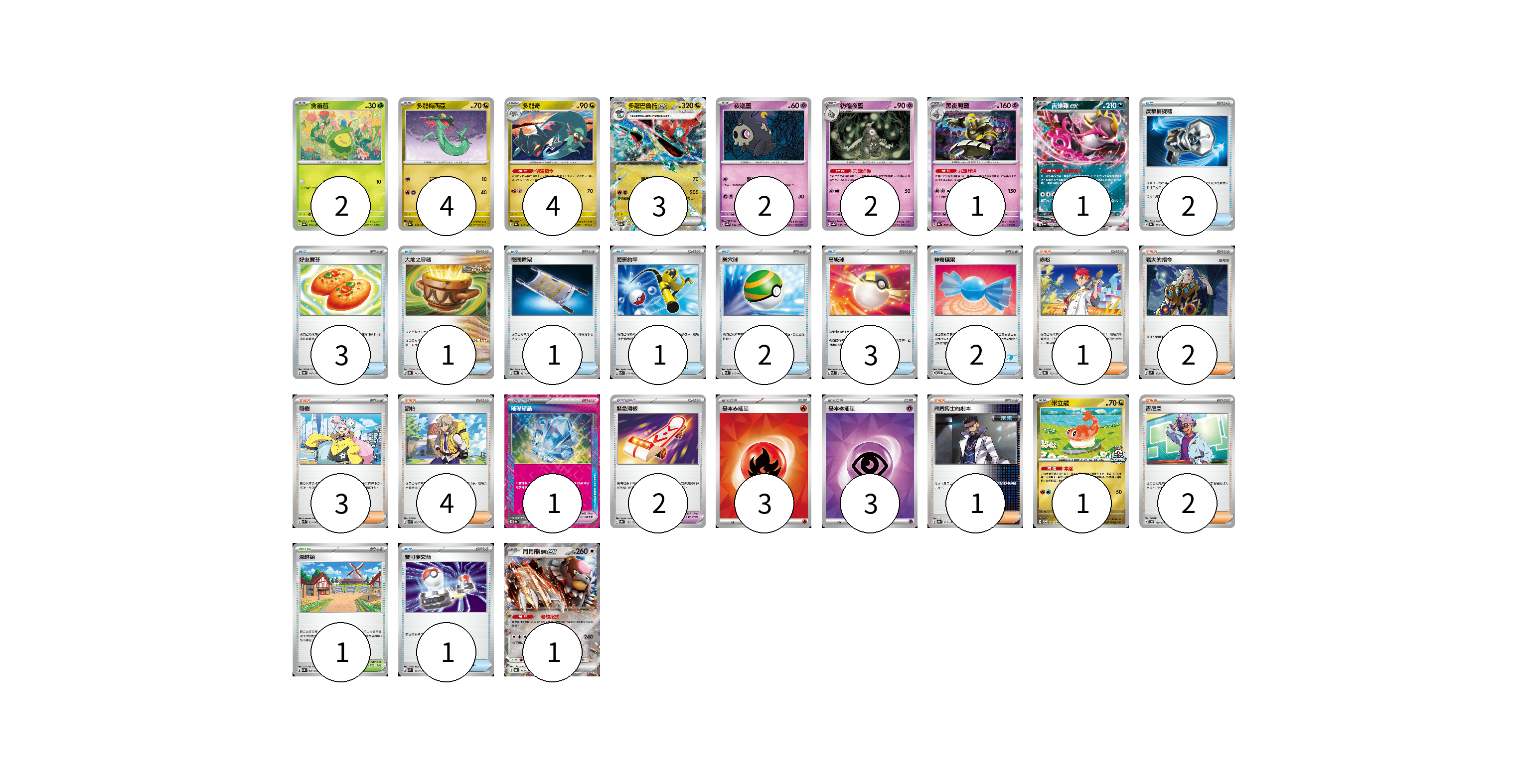牌組構築方案 以此牌組為基礎新構築牌組 顯示卡面 顯示列表 寶可夢卡(21) 2 4 4 3 2 2 1 1 1 1 寶可夢道具(3) 1 2 物品卡(16) 2 3 1 1 1 2 3 2 1 支援者卡(13) 1 2 3 4 1 2 競技場卡(1) 1 能量卡(6) 3 3 寶可夢卡(21) 卡牌名稱 張數 卡牌名稱 張數 含羞苞 SV8a 001/187 02 多龍梅西亞 SV8a 118/187 04 多龍奇 SV8a 119/187 04 多龍巴魯托ex SV8a 120/187 03 夜巡靈 SV8a 064/187 02 彷徨夜靈 SV8a 065/187 02 黑夜魔靈 SV8a 066/187 01 吉雉雞ex SV6a 038/064 01 米立龍 SV-P 186/SV-P 01 月月熊 赫月ex SV8a 134/187 01 寶可夢道具(3) 卡牌名稱 張數 卡牌名稱 張數 璀璨結晶 SV8a 152/187 01 緊急滑板 SV8a 153/187 02 物品卡(16) 卡牌名稱 張數 卡牌名稱 張數 反擊捕捉器 SV8a 139/187 02 好友寶芬 SV8a 147/187 03 大地之容器 SV8a 143/187 01 夜間擔架 SV8a 151/187 01 厲害釣竿 SVK 011/042 01 巢穴球 SVK 016/042 02 高級球 SVK 018/042 03 神奇糖果 SVI 053/066 02 寶可夢交替 SVM 136/175 01 支援者卡(13) 卡牌名稱 張數 卡牌名稱 張數 赤松 SV8a 163/187 01 老大的指令 SVM 172/175 02 奇樹 SVK 031/042 03 派帕 SVK 035/042 04 弗圖博士的劇本 SV8a 175/187 01 吉尼亞 SVD 129/139 02 競技場卡(1) 卡牌名稱 張數 卡牌名稱 張數 深缽鎮 SVK 039/042 01 能量卡(6) 卡牌名稱 張數 卡牌名稱 張數 基本【火】能量 SVK FIR 03 基本【超】能量 SVK PSY 03 以此牌組為基礎新構築牌組 牌組編碼 NnuvSz-oOiwpC-iIczGc copy 列印牌組單 牌組編碼已複製 分享至SNS