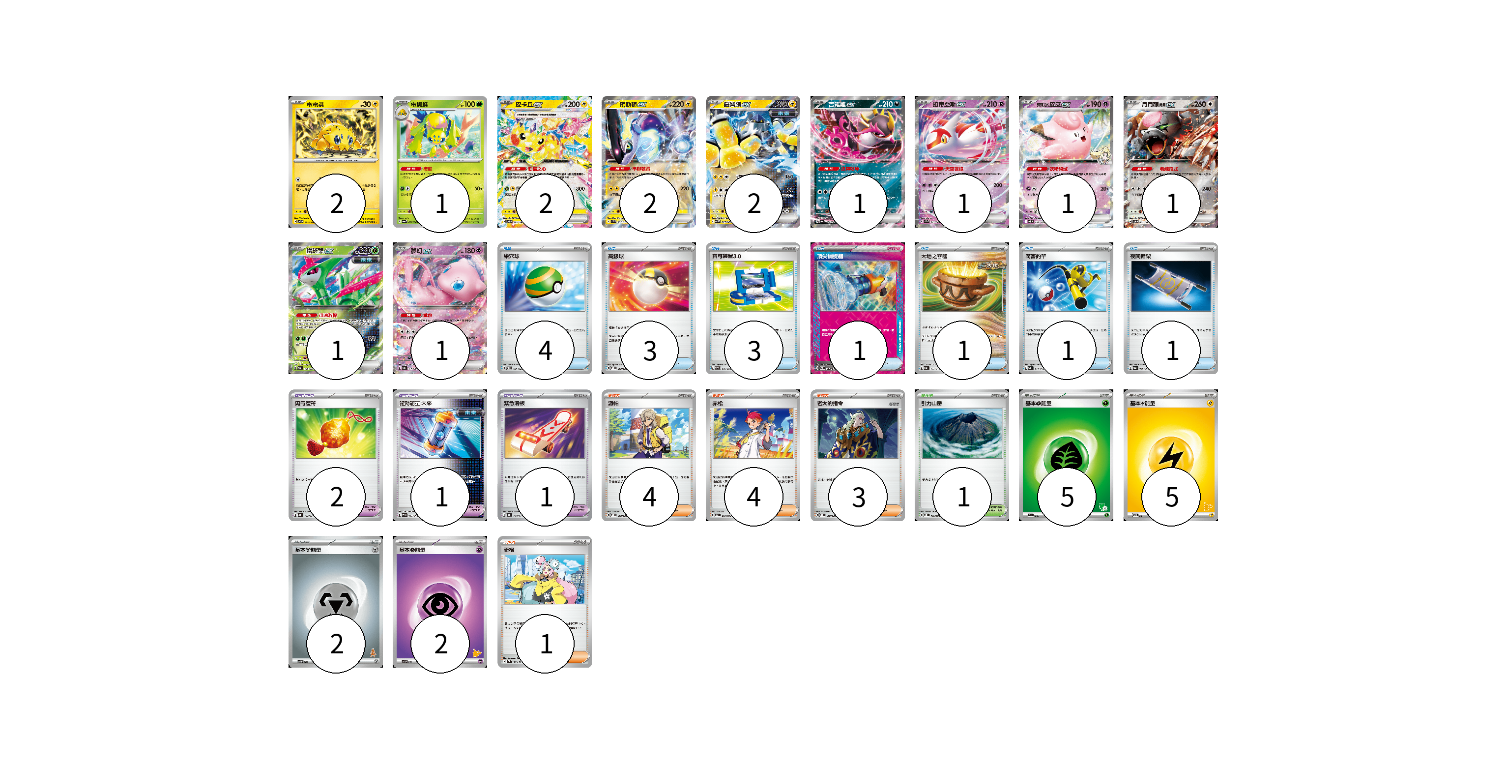 牌組構築方案 以此牌組為基礎新構築牌組 顯示卡面 顯示列表 寶可夢卡(15) 2 1 2 2 2 1 1 1 1 1 1 寶可夢道具(4) 2 1 1 物品卡(14) 4 3 3 1 1 1 1 支援者卡(12) 4 4 3 1 競技場卡(1) 1 能量卡(14) 5 5 2 2 寶可夢卡(15) 卡牌名稱 張數 卡牌名稱 張數 電電蟲 SV7 032/102 02 電蜘蛛 SV6a 002/064 01 皮卡丘ex SV8 033/106 02 密勒頓ex SV1V 037/078 02 鐵臂膀ex SV4M 027/066 02 吉雉雞ex SV6a 038/064 01 拉帝亞斯ex SV7a 019/064 01 莉莉艾的皮皮ex SV9 033/100 01 月月熊 赫月 ex SV5a 052/066 01 鐵斑葉ex SV5M 016/071 01 夢幻ex SV4a 076/190 01 寶可夢道具(4) 卡牌名稱 張數 卡牌名稱 張數 勇氣護符 SV2D 067/071 02 驅勁能量 未來 SV4M 062/066 01 緊急滑板 SV5K 064/071 01 物品卡(14) 卡牌名稱 張數 卡牌名稱 張數 巢穴球 SVEL 011/020 04 高級球 SVOD 012/020 03 寶可裝置3.0 SVAW 016/023 03 頂尖捕捉器 SV5M 062/071 01 大地之容器 SVK 012/042 01 厲害釣竿 SVK 011/042 01 夜間擔架 SV6a 056/064 01 支援者卡(12) 卡牌名稱 張數 卡牌名稱 張數 派帕 SVOD 018/020 04 赤松 SV7 097/102 04 老大的指令 SVOD 019/020 03 奇樹 SV2D 069/071 01 競技場卡(1) 卡牌名稱 張數 卡牌名稱 張數 引力山岳 SV8 106/106 01 能量卡(14) 卡牌名稱 張數 卡牌名稱 張數 基本【草】能量 SVI GRA 05 基本【雷】能量 SVI LIG 05 基本【鋼】能量 SVI MET 02 基本【超】能量 SVI PSY 02 以此牌組為基礎新構築牌組 牌組編碼 NoqINy-wnLAhh-VrwtAw copy 列印牌組單 牌組編碼已複製 分享至SNS