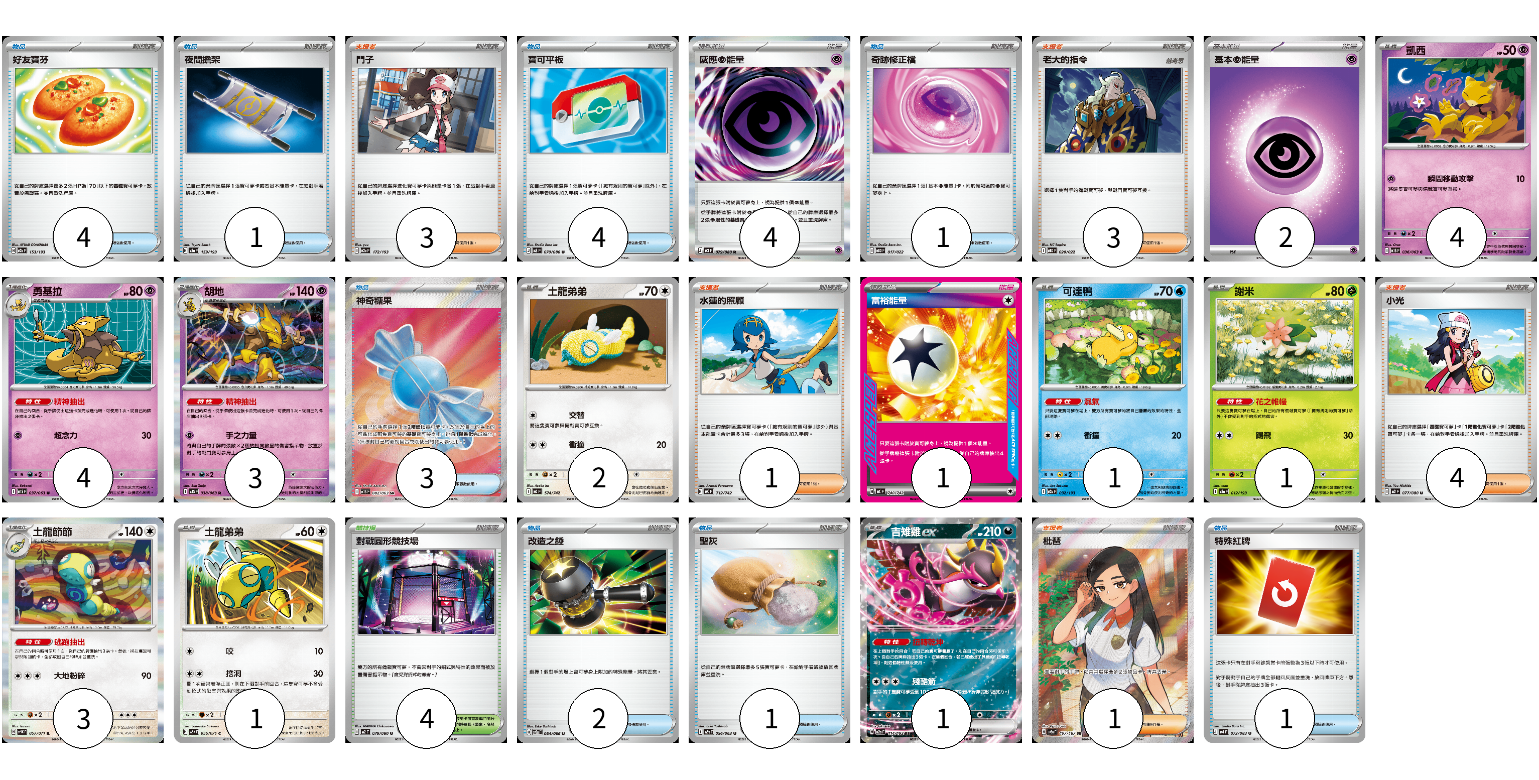 牌組構築方案 以此牌組為基礎新構築牌組 顯示卡面 顯示列表 寶可夢卡(20) 4 4 3 2 1 1 3 1 1 物品卡(17) 4 1 4 1 3 2 1 1 支援者卡(12) 3 3 1 4 1 競技場卡(4) 4 能量卡(7) 4 2 1 寶可夢卡(20) 卡牌名稱 張數 卡牌名稱 張數 凱西 M1S 036/063 04 勇基拉 M1S 037/063 04 胡地 M1S 038/063 03 土龍弟弟 MC 574/742 02 可達鴨 M2a 032/193 01 謝米 M2a 012/193 01 土龍節節 SV5K 057/071 03 土龍弟弟 SV5K 056/071 01 吉雉雞ex M2a 114/193 01 物品卡(17) 卡牌名稱 張數 卡牌名稱 張數 好友寶芬 M2a 153/193 04 夜間擔架 M2a 159/193 01 寶可平板 M3 070/080 04 奇跡修正檔 MBD 017/022 01 神奇糖果 M1S 082/063 03 改造之錘 SV5a 054/066 02 聖灰 SV9a 056/063 01 特殊紅牌 M4 072/083 01 支援者卡(12) 卡牌名稱 張數 卡牌名稱 張數 鬥子 M2a 172/193 03 老大的指令 MBD 020/022 03 水蓮的照顧 MC 712/742 01 小光 M2 077/080 04 枇琶 SV8a 197/187 01 競技場卡(4) 卡牌名稱 張數 卡牌名稱 張數 對戰圓形競技場 M2 079/080 04 能量卡(7) 卡牌名稱 張數 卡牌名稱 張數 感應【超】能量 M3 079/080 04 基本【超】能量 MBD PSY 02 富裕能量 MC 740/742 01 以此牌組為基礎新構築牌組 牌組編碼 NovpPg-AXNyrs-sLfhoO copy 列印牌組單 牌組編碼已複製 分享至SNS