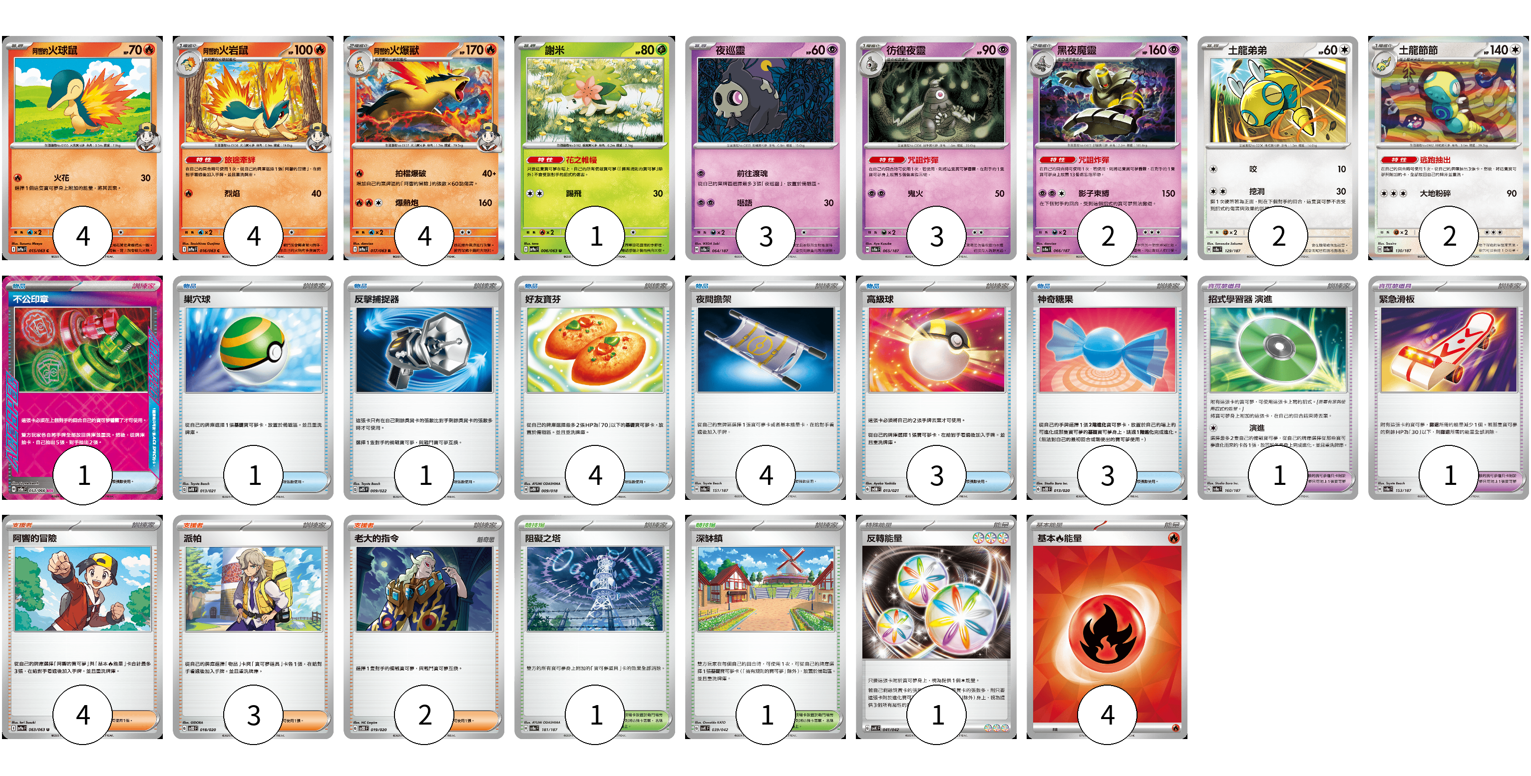 牌組構築方案 以此牌組為基礎新構築牌組 顯示卡面 顯示列表 寶可夢卡(25) 4 4 4 1 3 3 2 2 2 寶可夢道具(2) 1 1 物品卡(17) 1 1 1 4 4 3 3 支援者卡(9) 4 3 2 競技場卡(2) 1 1 能量卡(5) 1 4 寶可夢卡(25) 卡牌名稱 張數 卡牌名稱 張數 <阿響的>火球鼠 SV9a 015/063 04 <阿響的>火岩鼠 SV9a 016/063 04 <阿響的>火爆獸 SV9a 017/063 04 謝米 SV9a 006/063 01 夜巡靈 SV8a 064/187 03 彷徨夜靈 SV8a 065/187 03 黑夜魔靈 SV8a 066/187 02 土龍弟弟 SV8a 129/187 02 土龍節節 SV8a 130/187 02 寶可夢道具(2) 卡牌名稱 張數 卡牌名稱 張數 招式學習器 演進 SV8a 160/187 01 緊急滑板 SV8a 153/187 01 物品卡(17) 卡牌名稱 張數 卡牌名稱 張數 不公印章 SV5a 053/066 01 巢穴球 SVTR 013/021 01 反擊捕捉器 SVTS 009/022 01 好友寶芬 SVTH 009/018 04 夜間擔架 SV8a 151/187 04 高級球 SVOM 013/021 03 神奇糖果 SVOD 013/020 03 支援者卡(9) 卡牌名稱 張數 卡牌名稱 張數 阿響的冒險 SV9a 063/063 04 派帕 SVOD 018/020 03 老大的指令 SVOD 019/020 02 競技場卡(2) 卡牌名稱 張數 卡牌名稱 張數 阻礙之塔 SV8a 181/187 01 深缽鎮 SVK 039/042 01 能量卡(5) 卡牌名稱 張數 卡牌名稱 張數 反轉能量 SVK 041/042 01 基本【火】能量 SVK FIR 04 以此牌組為基礎新構築牌組 牌組編碼 NqFLTw-dvXCPK-COLTmm copy 列印牌組單 牌組編碼已複製 分享至SNS