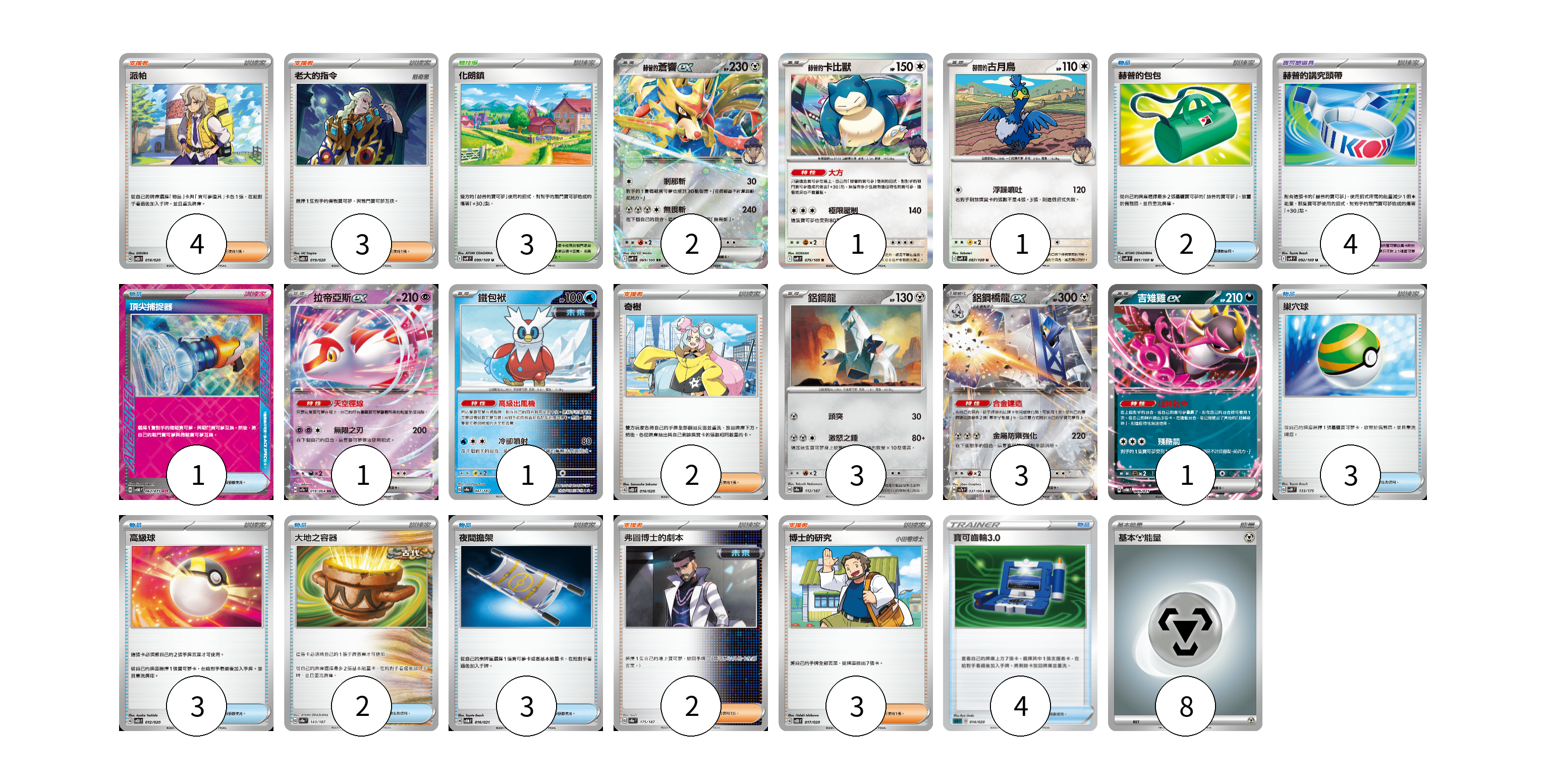 牌組構築方案 以此牌組為基礎新構築牌組 顯示卡面 顯示列表 寶可夢卡(13) 2 1 1 1 1 3 3 1 寶可夢道具(4) 4 物品卡(18) 2 1 3 3 2 3 4 支援者卡(14) 4 3 2 2 3 競技場卡(3) 3 能量卡(8) 8 寶可夢卡(13) 卡牌名稱 張數 卡牌名稱 張數 赫普的蒼響ex SV9 069/100 02 赫普的卡比獸 SV9 075/100 01 赫普的古月鳥 SV9 087/100 01 拉帝亞斯ex SV7a 019/064 01 鐵包袱 SV8a 047/187 01 鋁鋼龍 SV8a 112/187 03 鋁鋼橋龍ex SV7a 037/064 03 吉雉雞ex SVOM 009/021 01 寶可夢道具(4) 卡牌名稱 張數 卡牌名稱 張數 赫普的講究頭帶 SV9 092/100 04 物品卡(18) 卡牌名稱 張數 卡牌名稱 張數 赫普的包包 SV9 091/100 02 頂尖捕捉器 SV5M 062/071 01 巢穴球 SVM 133/175 03 高級球 SVOD 012/020 03 大地之容器 SV8a 143/187 02 夜間擔架 SVOM 016/021 03 寶可齒輪3.0 SLD 014/020 04 支援者卡(14) 卡牌名稱 張數 卡牌名稱 張數 派帕 SVOD 018/020 04 老大的指令 SVOD 019/020 03 奇樹 SVOD 016/020 02 弗圖博士的劇本 SV8a 175/187 02 博士的研究 SVOD 017/020 03 競技場卡(3) 卡牌名稱 張數 卡牌名稱 張數 化朗鎮 SV9 099/100 03 能量卡(8) 卡牌名稱 張數 卡牌名稱 張數 基本鋼能量 sv-p MET 08 以此牌組為基礎新構築牌組 牌組編碼 NrWUbB-arqROM-HSfkfK copy 列印牌組單 牌組編碼已複製 分享至SNS