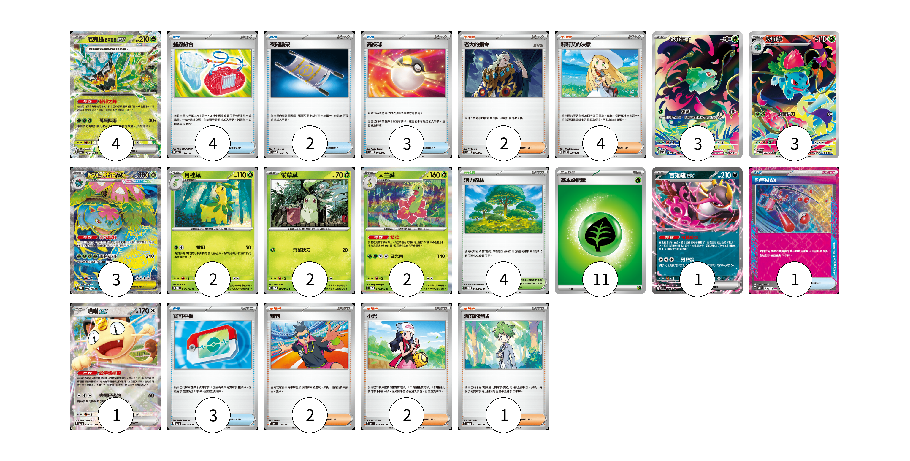 牌組構築方案 以此牌組為基礎新構築牌組 顯示卡面 顯示列表 寶可夢卡(21) 4 3 3 3 2 2 2 1 1 物品卡(13) 4 2 3 1 3 支援者卡(11) 2 4 2 2 1 競技場卡(4) 4 能量卡(11) 11 寶可夢卡(21) 卡牌名稱 張數 卡牌名稱 張數 厄鬼椪 碧草面具ex M2a 017/193 04 妙蛙種子 M1L 064/063 03 妙蛙草 M1L 065/063 03 超級妙蛙花ex M1L 076/063 03 月桂葉 M1S 004/063 02 菊草葉 M1S 003/063 02 大竺葵 M1S 005/063 02 吉雉雞ex SVOD 004/020 01 喵喵ex M3 061/080 01 物品卡(13) 卡牌名稱 張數 卡牌名稱 張數 捕蟲組合 M2a 157/193 04 夜間擔架 M2a 159/193 02 高級球 MBD 014/022 03 釣竿MAX SV8a 142/187 01 寶可平板 M3 070/080 03 支援者卡(11) 卡牌名稱 張數 卡牌名稱 張數 老大的指令 MBD 020/022 02 莉莉艾的決意 MBD 021/022 04 裁判 MC 711/742 02 小光 M2 077/080 02 滿充的體貼 M1S 060/063 01 競技場卡(4) 卡牌名稱 張數 卡牌名稱 張數 活力森林 M1S 061/063 04 能量卡(11) 卡牌名稱 張數 卡牌名稱 張數 基本【草】能量 M-P GRA 11 以此牌組為基礎新構築牌組 牌組編碼 NrjHyX-kONcTl-nwRwfP copy 列印牌組單 牌組編碼已複製 分享至SNS