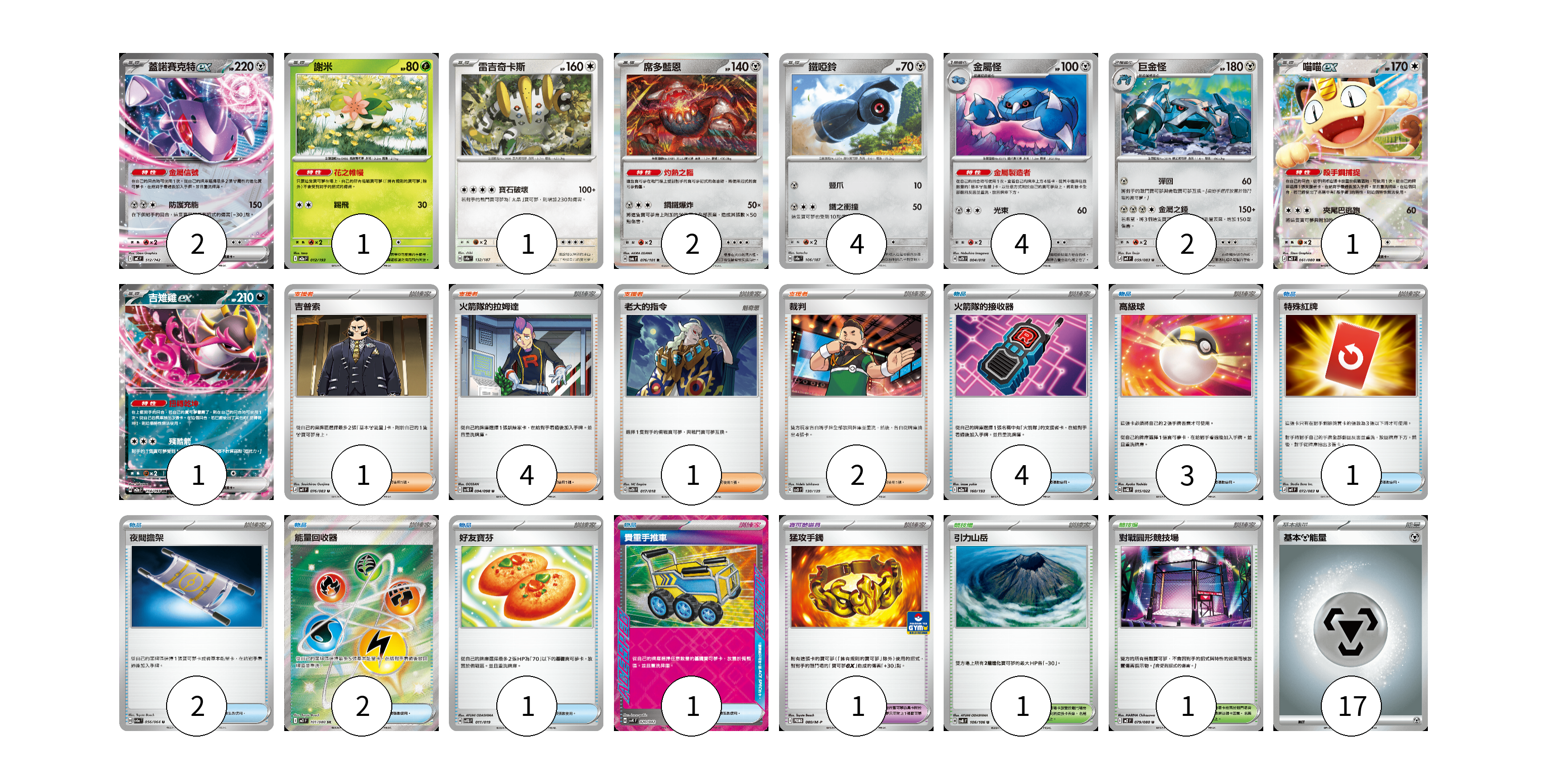 牌組構築方案 以此牌組為基礎新構築牌組 顯示卡面 顯示列表 寶可夢卡(18) 2 1 1 2 4 4 2 1 1 寶可夢道具(1) 1 物品卡(14) 4 3 1 2 2 1 1 支援者卡(8) 1 4 1 2 競技場卡(2) 1 1 能量卡(17) 17 寶可夢卡(18) 卡牌名稱 張數 卡牌名稱 張數 蓋諾賽克特ex MC 512/742 02 謝米 M2a 012/193 01 雷吉奇卡斯 SV8a 132/187 01 席多藍恩 SV6 076/101 02 鐵啞鈴 SV8a 106/187 04 金屬怪 SVTH 004/018 04 巨金怪 M4 059/083 02 喵喵ex M3 061/080 01 吉雉雞ex M2a 114/193 01 寶可夢道具(1) 卡牌名稱 張數 卡牌名稱 張數 猛攻手鐲 M-P 080/M-P 01 物品卡(14) 卡牌名稱 張數 卡牌名稱 張數 火箭隊的接收器 M2a 160/193 04 高級球 SVQL 015/022 03 特殊紅牌 M4 072/083 01 夜間擔架 SV6a 056/064 02 能量回收器 M3 101/080 02 好友寶芬 SVTG 011/019 01 貴重手推車 SVK 020/042 01 支援者卡(8) 卡牌名稱 張數 卡牌名稱 張數 吉普索 M4 076/083 01 火箭隊的拉姆達 SV10 094/098 04 老大的指令 SVTH 017/018 01 裁判 SVD 130/139 02 競技場卡(2) 卡牌名稱 張數 卡牌名稱 張數 引力山岳 SV8 106/106 01 對戰圓形競技場 M2 079/080 01 能量卡(17) 卡牌名稱 張數 卡牌名稱 張數 基本【鋼】能量 M-P MET 17 以此牌組為基礎新構築牌組 牌組編碼 NwQQLs-UpQMoG-qndctl copy 列印牌組單 牌組編碼已複製 分享至SNS