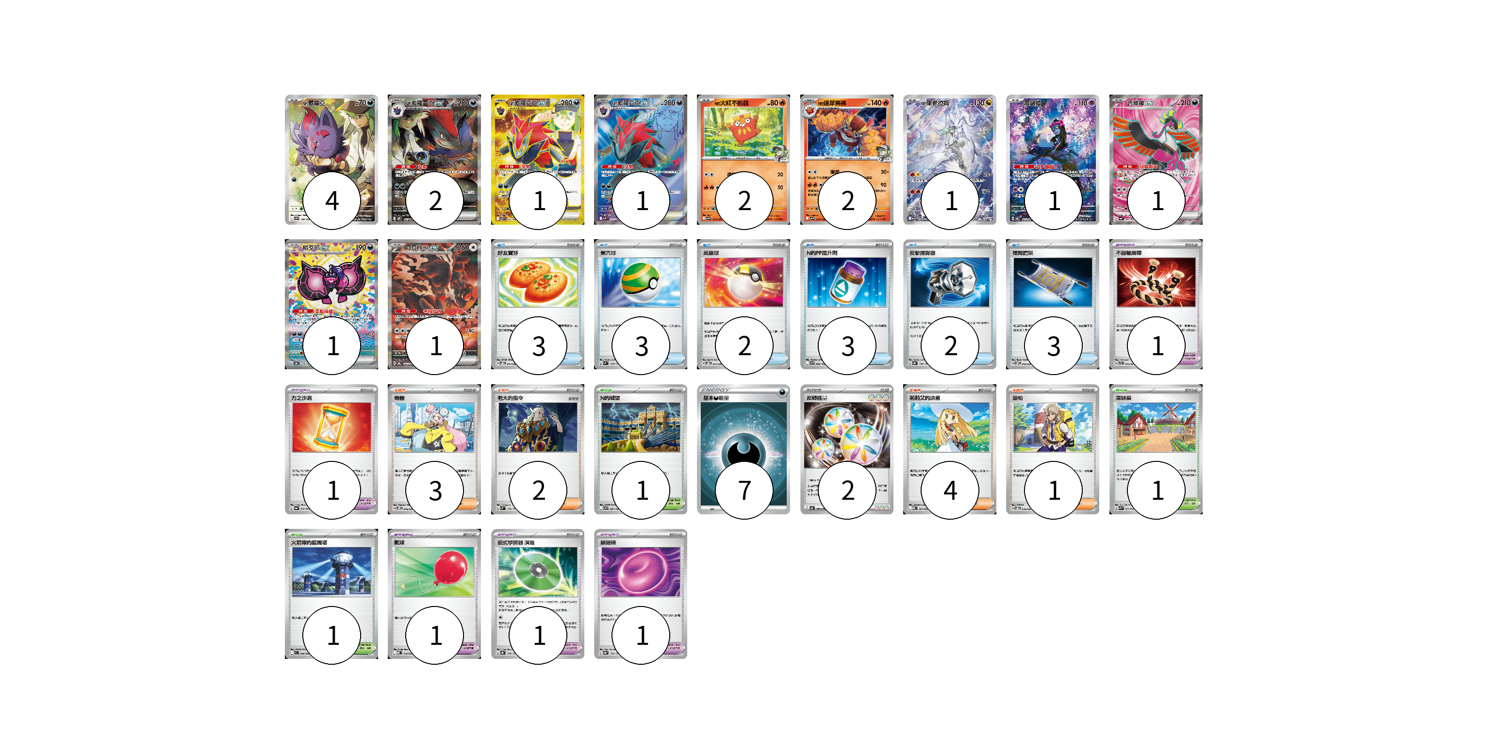 牌組構築方案 以此牌組為基礎新構築牌組 顯示卡面 顯示列表 寶可夢卡(17) 4 2 1 1 2 2 1 1 1 1 1 寶可夢道具(4) 1 1 1 1 物品卡(17) 3 3 2 3 2 3 1 支援者卡(10) 3 2 4 1 競技場卡(3) 1 1 1 能量卡(9) 7 2 寶可夢卡(17) 卡牌名稱 張數 卡牌名稱 張數 N的索羅亞 SV9 108/100 04 N的索羅亞克ex SV9 127/100 02 N的索羅亞克ex SV9 131/100 01 N的索羅亞克ex SV9 117/100 01 N的火紅不倒翁 SV9 015/100 02 N的達摩狒狒 SV9 016/100 02 N的萊希拉姆 SV9 109/100 01 願增猿 SV6 107/101 01 吉雉雞ex SV6a 081/064 01 桃歹郎ex SV8a 219/187 01 月月熊 赫月ex SV8a 225/187 01 寶可夢道具(4) 卡牌名稱 張數 卡牌名稱 張數 不服輸頭帶 SVTL 016/021 01 力之沙漏 SV6a 058/064 01 招式學習器 演進 SV8a 160/187 01 鎖鏈糬 SV8a 154/187 01 物品卡(17) 卡牌名稱 張數 卡牌名稱 張數 好友寶芬 SVOD 011/020 03 巢穴球 SVM 133/175 03 高級球 SVOD 012/020 02 N的PP提升劑 SV9 089/100 03 反擊捕捉器 SV8a 139/187 02 夜間擔架 SVOM 016/021 03 氣球 MBD 018/022 01 支援者卡(10) 卡牌名稱 張數 卡牌名稱 張數 奇樹 SVOM 018/021 03 老大的指令 SVM 172/175 02 莉莉艾的決意 MBD 021/022 04 派帕 SVOD 018/020 01 競技場卡(3) 卡牌名稱 張數 卡牌名稱 張數 N的城堡 SV9 097/100 01 深缽鎮 SVK 039/042 01 火箭隊的監視塔 SV10 096/098 01 能量卡(9) 卡牌名稱 張數 卡牌名稱 張數 基本惡能量 SLD DAR 07 反轉能量 SV4a 189/190 02 以此牌組為基礎新構築牌組 牌組編碼 NwmQRF-gdMREL-tQamLi copy 列印牌組單 牌組編碼已複製 分享至SNS