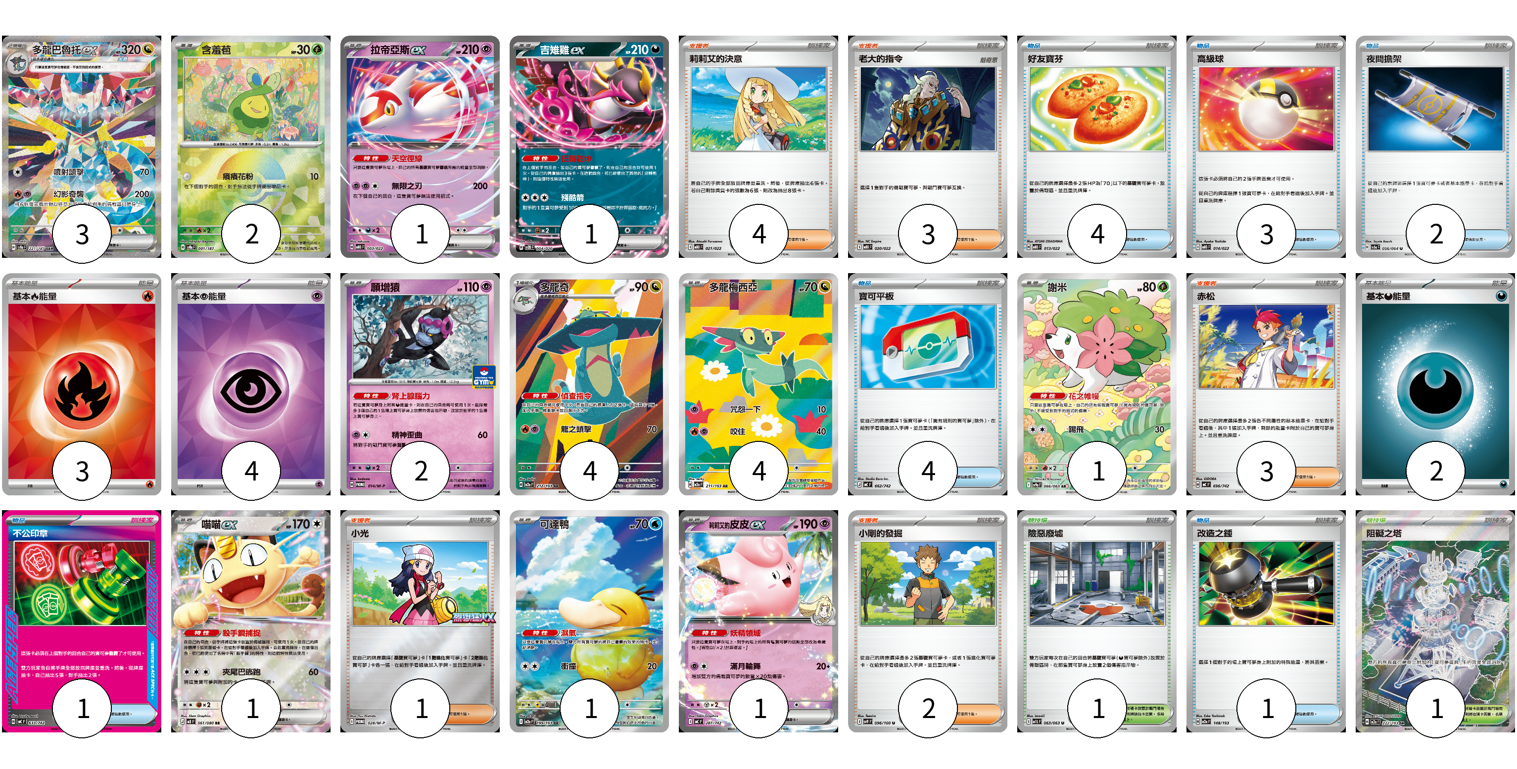 牌組構築方案 以此牌組為基礎新構築牌組 顯示卡面 顯示列表 寶可夢卡(21) 3 2 1 1 2 4 4 1 1 1 1 物品卡(15) 4 3 2 4 1 1 支援者卡(13) 4 3 3 1 2 競技場卡(2) 1 1 能量卡(9) 3 4 2 寶可夢卡(21) 卡牌名稱 張數 卡牌名稱 張數 多龍巴魯托ex SV8a 221/187 03 含羞苞 SV8a 001/187 02 拉帝亞斯ex MBD 003/022 01 吉雉雞ex SVOD 004/020 01 願增猿 M-P 014/M-P 02 多龍奇 M2a 212/193 04 多龍梅西亞 M2a 211/193 04 謝米 SV9a 066/063 01 喵喵ex M3 061/080 01 可達鴨 M2a 199/193 01 莉莉艾的皮皮ex MC 287/742 01 物品卡(15) 卡牌名稱 張數 卡牌名稱 張數 好友寶芬 MBD 013/022 04 高級球 MBD 014/022 03 夜間擔架 SV6a 056/064 02 寶可平板 MC 662/742 04 不公印章 MC 633/742 01 改造之錘 M2a 148/193 01 支援者卡(13) 卡牌名稱 張數 卡牌名稱 張數 莉莉艾的決意 MBD 021/022 04 老大的指令 MBD 020/022 03 赤松 MC 696/742 03 小光 M-P 028/M-P 01 小剛的發掘 SV9 096/100 02 競技場卡(2) 卡牌名稱 張數 卡牌名稱 張數 險惡廢墟 M1L 063/063 01 阻礙之塔 M2a 222/193 01 能量卡(9) 卡牌名稱 張數 卡牌名稱 張數 基本【火】能量 SVQL FIR 03 基本【超】能量 SVM PSY 04 基本【惡】能量 MC DAR 02 以此牌組為基礎新構築牌組 牌組編碼 NyhOAW-grPEjN-HrmqHM copy 列印牌組單 牌組編碼已複製 分享至SNS