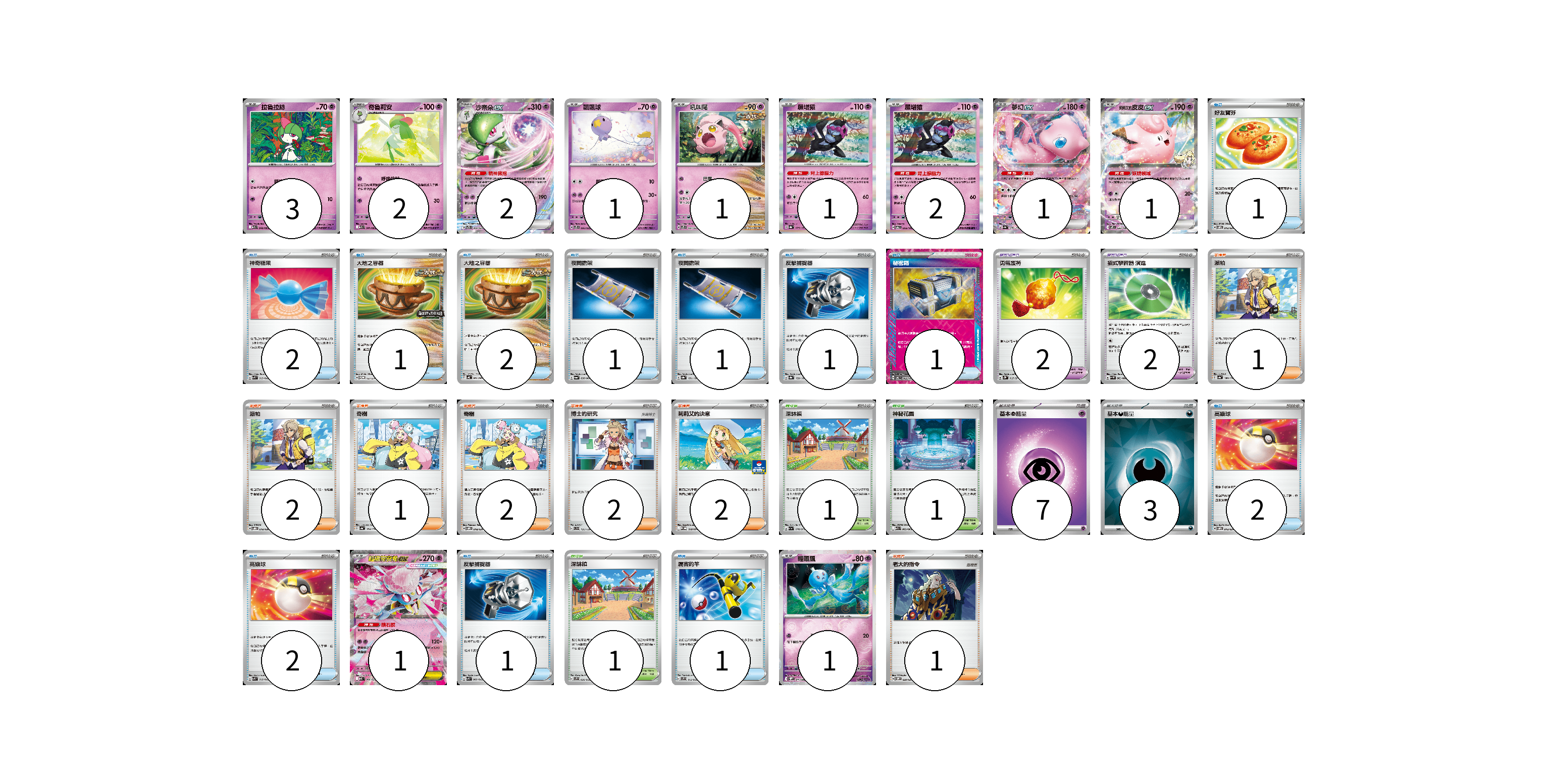 牌組構築方案 以此牌組為基礎新構築牌組 顯示卡面 顯示列表 寶可夢卡(16) 3 2 2 1 1 1 2 1 1 1 1 寶可夢道具(4) 2 2 物品卡(16) 1 2 1 2 1 1 1 1 2 2 1 1 支援者卡(11) 1 2 1 2 2 2 1 競技場卡(3) 1 1 1 能量卡(10) 7 3 寶可夢卡(16) 卡牌名稱 張數 卡牌名稱 張數 拉魯拉絲 M1S 040/063 03 奇魯莉安 M1S 041/063 02 沙奈朵ex SVTS 004/022 02 飄飄球 SVTS 005/022 01 吼叫尾 SVTS 007/022 01 願增猿 SV8a 075/187 01 願增猿 SV6 055/101 02 夢幻ex SV4a 076/190 01 莉莉艾的皮皮ex SV9 033/100 01 超級蒂安希ex MBD 006/022 01 輕飄飄 SV11W 041/086 01 寶可夢道具(4) 卡牌名稱 張數 卡牌名稱 張數 勇氣護符 SV2D 067/071 02 招式學習器 演進 SV4M 063/066 02 物品卡(16) 卡牌名稱 張數 卡牌名稱 張數 好友寶芬 SVOM 012/021 01 神奇糖果 SVK 019/042 02 大地之容器 SV-P 137/SV-P 01 大地之容器 SV4K 060/066 02 夜間擔架 SV6a 056/064 01 夜間擔架 SV8a 151/187 01 反擊捕捉器 SV8a 139/187 01 秘密箱 SV6 092/101 01 高級球 SVOM 013/021 02 高級球 SVK 018/042 02 反擊捕捉器 SVK 009/042 01 厲害釣竿 SVF 013/038 01 支援者卡(11) 卡牌名稱 張數 卡牌名稱 張數 派帕 SV4a 180/190 01 派帕 SVOD 018/020 02 奇樹 SV4a 174/190 01 奇樹 SVOM 018/021 02 博士的研究(奧琳博士) SVD 135/139 02 莉莉艾的決意 M-P 018/M-P 02 老大的指令 SVOM 020/021 01 競技場卡(3) 卡牌名稱 張數 卡牌名稱 張數 深缽鎮 SV1a 070/073 01 神秘花園 M1S 063/063 01 深缽鎮 SVF 036/038 01 能量卡(10) 卡牌名稱 張數 卡牌名稱 張數 基本【超】能量 MBD PSY 07 基本【惡】能量 SVOM DAR 03 以此牌組為基礎新構築牌組 牌組編碼 NzkQBm-zcPdCm-PhuTcD copy 列印牌組單 牌組編碼已複製 分享至SNS