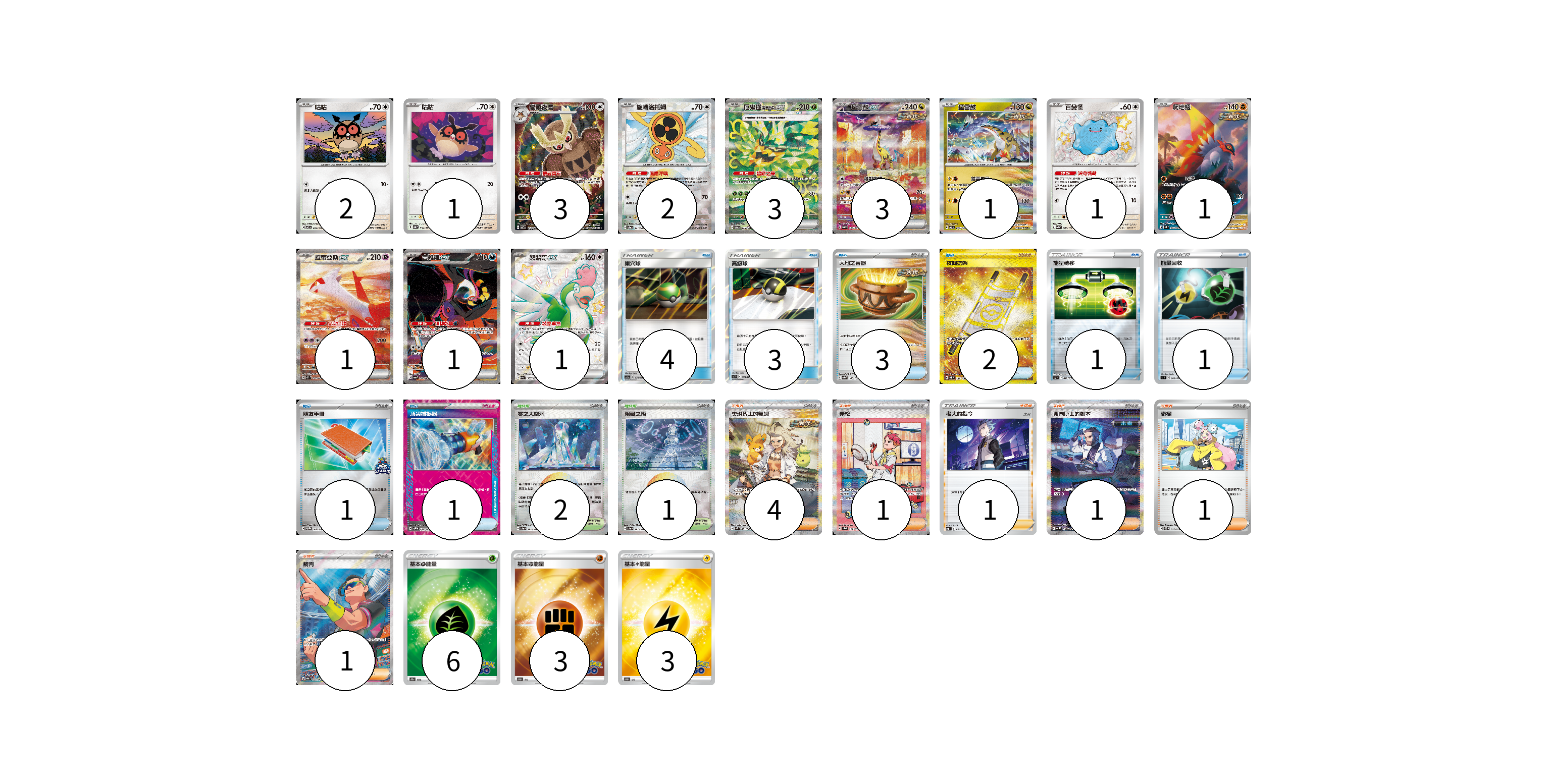 牌組構築方案 以此牌組為基礎新構築牌組 顯示卡面 顯示列表 寶可夢卡(20) 2 1 3 2 3 3 1 1 1 1 1 1 物品卡(16) 4 3 3 2 1 1 1 1 支援者卡(9) 4 1 1 1 1 1 競技場卡(3) 2 1 能量卡(12) 6 3 3 寶可夢卡(20) 卡牌名稱 張數 卡牌名稱 張數 咕咕 SV7 076/102 02 咕咕 SV5K 054/071 01 貓頭夜鷹 SV7 114/102 03 旋轉洛托姆 SV8a 131/187 02 厄鬼椪 碧草面具ex SV6 125/101 03 猛雷鼓ex SV5K 095/071 03 猛雷鼓 SV7 075/102 01 百變怪 SV4a 309/190 01 爬地翅 SV4K 074/066 01 拉帝亞斯ex SV7a 087/064 01 吉雉雞ex SV6a 089/064 01 怒鸚哥ex SV4a 337/190 01 物品卡(16) 卡牌名稱 張數 卡牌名稱 張數 巢穴球 AS5a 178/184 04 高級球 AS5b 178/186 03 大地之容器 SV8a 143/187 03 夜間擔架 SV8 137/106 02 能量轉移 SO 017/030 01 能量回收 SI 365/414 01 朋友手冊 SV-P 182/SV-P 01 頂尖捕捉器 SV5M 062/071 01 支援者卡(9) 卡牌名稱 張數 卡牌名稱 張數 奧琳博士的氣魄 SV4K 091/066 04 赤松 SV8a 227/187 01 老大的指令(赤日) SVB 024/028 01 弗圖博士的劇本 SV4M 091/066 01 奇樹 SVTG 017/019 01 裁判 SV9a 083/063 01 競技場卡(3) 卡牌名稱 張數 卡牌名稱 張數 零之大空洞 SV8a 182/187 02 阻礙之塔 SV8a 181/187 01 能量卡(12) 卡牌名稱 張數 卡牌名稱 張數 基本草能量 S10b GRA 06 基本鬥能量 S10b FIG 03 基本雷能量 S10b LIG 03 以此牌組為基礎新構築牌組 牌組編碼 OCckVA-EgnuVj-iUECYx copy 列印牌組單 牌組編碼已複製 分享至SNS