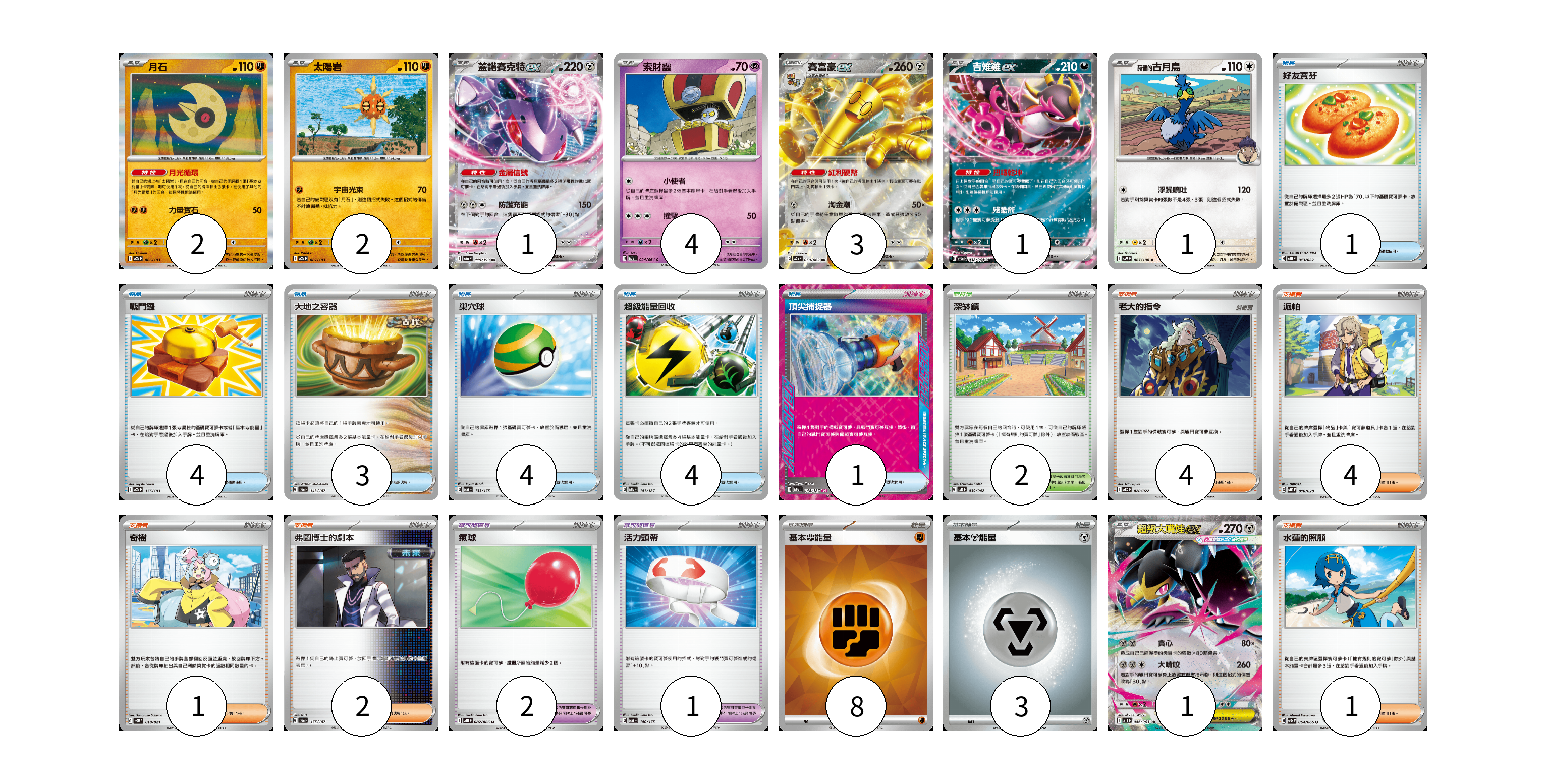 牌組構築方案 以此牌組為基礎新構築牌組 顯示卡面 顯示列表 寶可夢卡(15) 2 2 1 4 3 1 1 1 寶可夢道具(3) 2 1 物品卡(17) 1 4 3 4 4 1 支援者卡(12) 4 4 1 2 1 競技場卡(2) 2 能量卡(11) 8 3 寶可夢卡(15) 卡牌名稱 張數 卡牌名稱 張數 月石 M2a 086/193 02 太陽岩 M2a 087/193 02 蓋諾賽克特ex M2a 119/193 01 索財靈 SV7a 024/064 04 賽富豪ex SV3a 050/062 03 吉雉雞ex SV6a 038/064 01 赫普的古月鳥 SV9 087/100 01 超級大嘴娃ex M1L 046/063 01 寶可夢道具(3) 卡牌名稱 張數 卡牌名稱 張數 氣球 SV11B 082/086 02 活力頭帶 SVM 140/175 01 物品卡(17) 卡牌名稱 張數 卡牌名稱 張數 好友寶芬 MBD 013/022 01 戰鬥鑼 M2a 155/193 04 大地之容器 SV8a 143/187 03 巢穴球 SVM 133/175 04 超級能量回收 SV8a 141/187 04 頂尖捕捉器 SV8a 148/187 01 支援者卡(12) 卡牌名稱 張數 卡牌名稱 張數 老大的指令 MBD 020/022 04 派帕 SVOD 018/020 04 奇樹 SVOM 018/021 01 弗圖博士的劇本 SV8a 175/187 02 水蓮的照顧 SV5a 064/066 01 競技場卡(2) 卡牌名稱 張數 卡牌名稱 張數 深缽鎮 SVK 039/042 02 能量卡(11) 卡牌名稱 張數 卡牌名稱 張數 基本【鬥】能量 SVK FIG 08 基本【鋼】能量 M-P MET 03 以此牌組為基礎新構築牌組 牌組編碼 OIqfuk-UjiyuC-pqoeeT copy 列印牌組單 牌組編碼已複製 分享至SNS