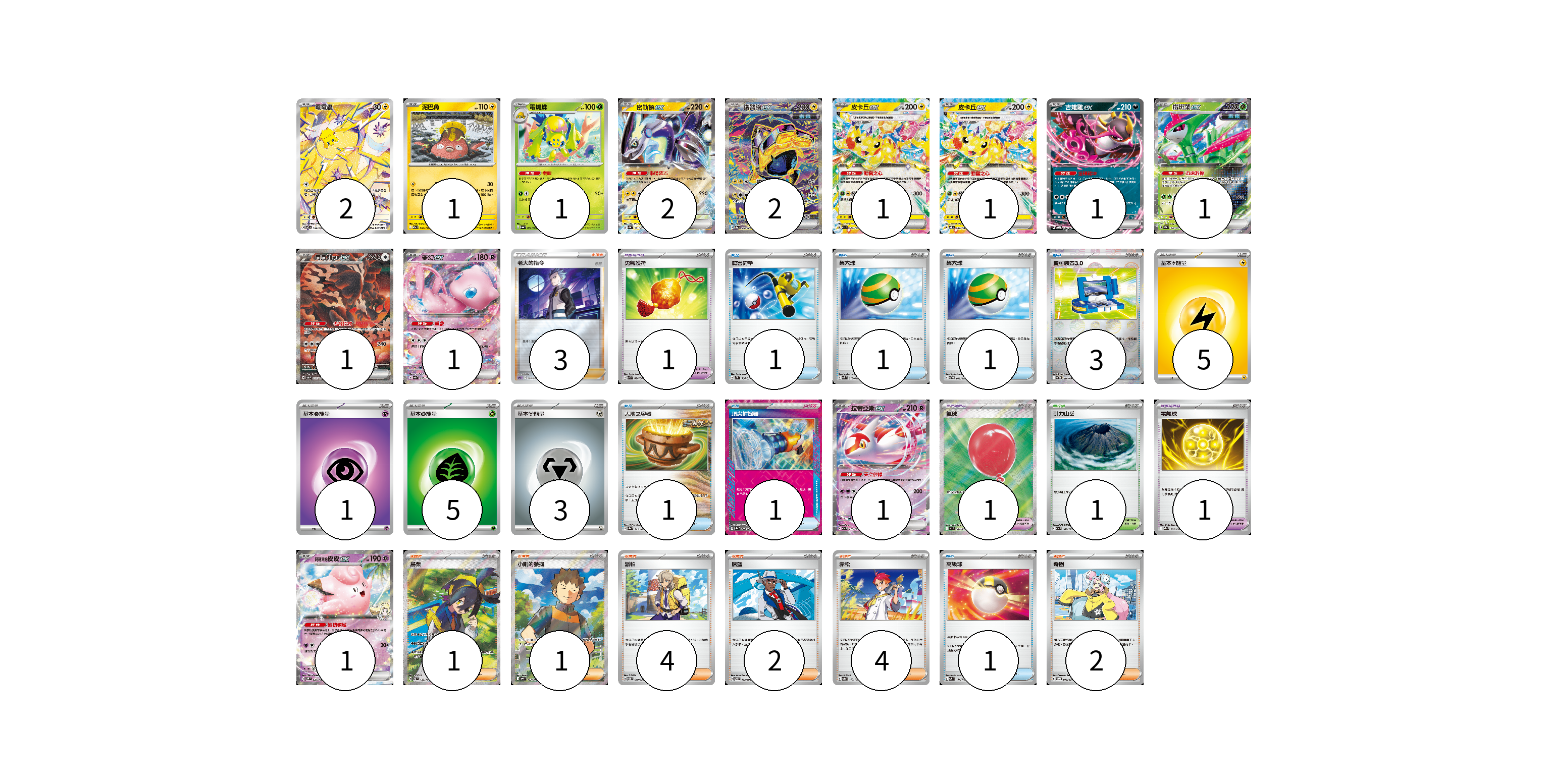 牌組構築方案 以此牌組為基礎新構築牌組 顯示卡面 顯示列表 寶可夢卡(16) 2 1 1 2 2 1 1 1 1 1 1 1 1 寶可夢道具(3) 1 1 1 物品卡(9) 1 1 1 3 1 1 1 支援者卡(17) 3 1 1 4 2 4 2 競技場卡(1) 1 能量卡(14) 5 1 5 3 寶可夢卡(16) 卡牌名稱 張數 卡牌名稱 張數 電電蟲 SV7 108/102 02 泥巴魚 M2a 050/193 01 電蜘蛛 SV6a 002/064 01 密勒頓ex SV4a 071/190 02 鐵臂膀ex SV8a 210/187 02 皮卡丘ex M2a 044/193 01 皮卡丘ex SV8 033/106 01 吉雉雞ex SVOM 009/021 01 鐵斑葉ex SV5M 016/071 01 月月熊 赫月ex SV8a 225/187 01 夢幻ex SV4a 076/190 01 拉帝亞斯ex M2a 075/193 01 莉莉艾的皮皮ex SV9 033/100 01 寶可夢道具(3) 卡牌名稱 張數 卡牌名稱 張數 勇氣護符 SVK 024/042 01 氣球 M1L 084/063 01 電氣球 M2a 163/193 01 物品卡(9) 卡牌名稱 張數 卡牌名稱 張數 厲害釣竿 SV2P 066/071 01 巢穴球 SVK 016/042 01 巢穴球 SVTG 012/019 01 寶可裝置3.0 SV11B 081/086 03 大地之容器 SV8a 143/187 01 頂尖捕捉器 SV8a 148/187 01 高級球 SVM 134/175 01 支援者卡(17) 卡牌名稱 張數 卡牌名稱 張數 老大的指令(赤日) SPD 020/020 03 烏栗 SV6 122/101 01 小剛的發掘 SV9 123/100 01 派帕 SVTM 019/022 04 席藍 SV8 102/106 02 赤松 SV8a 163/187 04 奇樹 SVOM 018/021 02 競技場卡(1) 卡牌名稱 張數 卡牌名稱 張數 引力山岳 M2a 183/193 01 能量卡(14) 卡牌名稱 張數 卡牌名稱 張數 基本雷能量 sv-p LIG 05 基本超能量 sv-p PSY 01 基本草能量 sv-p GRA 05 基本鋼能量 sv-p MET 03 以此牌組為基礎新構築牌組 牌組編碼 OQPQAT-THnHHh-nUjwjO copy 列印牌組單 牌組編碼已複製 分享至SNS