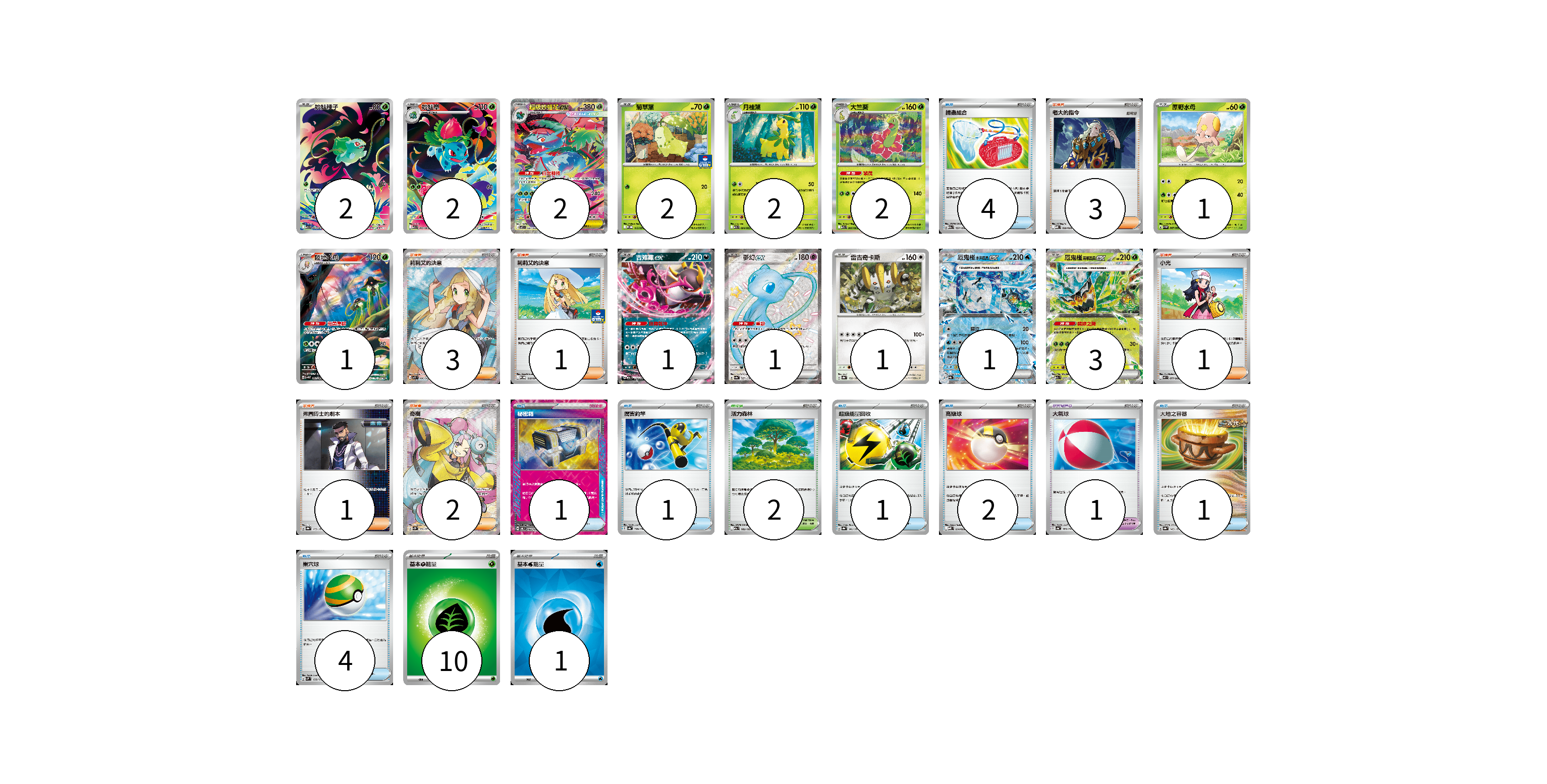 牌組構築方案 以此牌組為基礎新構築牌組 顯示卡面 顯示列表 寶可夢卡(21) 2 2 2 2 2 2 1 1 1 1 1 1 3 寶可夢道具(1) 1 物品卡(14) 4 1 1 1 2 1 4 支援者卡(11) 3 3 1 1 1 2 競技場卡(2) 2 能量卡(11) 10 1 寶可夢卡(21) 卡牌名稱 張數 卡牌名稱 張數 妙蛙種子 M1L 064/063 02 妙蛙草 M1L 065/063 02 超級妙蛙花ex M1L 087/063 02 菊草葉 M-P 012/M-P 02 月桂葉 M1S 004/063 02 大竺葵 M1S 005/063 02 原野水母 SV4M 007/066 01 陸地水母 SV4M 068/066 01 吉雉雞ex M2a 114/193 01 夢幻ex SV4a 327/190 01 雷吉奇卡斯 SV8a 132/187 01 厄鬼椪 水井面具ex SV8a 050/187 01 厄鬼椪 碧草面具ex M2a 017/193 03 寶可夢道具(1) 卡牌名稱 張數 卡牌名稱 張數 大氣球 SV4a 165/190 01 物品卡(14) 卡牌名稱 張數 卡牌名稱 張數 捕蟲組合 M2a 157/193 04 秘密箱 SV6 092/101 01 厲害釣竿 SV4a 158/190 01 超級能量回收 SV8a 141/187 01 高級球 MBD 014/022 02 大地之容器 SV8a 143/187 01 巢穴球 SVM 133/175 04 支援者卡(11) 卡牌名稱 張數 卡牌名稱 張數 老大的指令 MBD 020/022 03 莉莉艾的決意 M1L 086/063 03 莉莉艾的決意 M-P 018/M-P 01 小光 M2 077/080 01 弗圖博士的劇本 SV8a 175/187 01 奇樹 SV2D 091/071 02 競技場卡(2) 卡牌名稱 張數 卡牌名稱 張數 活力森林 M2a 182/193 02 能量卡(11) 卡牌名稱 張數 卡牌名稱 張數 基本【草】能量 M-P GRA 10 基本【水】能量 SVM WAT 01 以此牌組為基礎新構築牌組 牌組編碼 OQfVrp-zwgQRV-ElaDgw copy 列印牌組單 牌組編碼已複製 分享至SNS