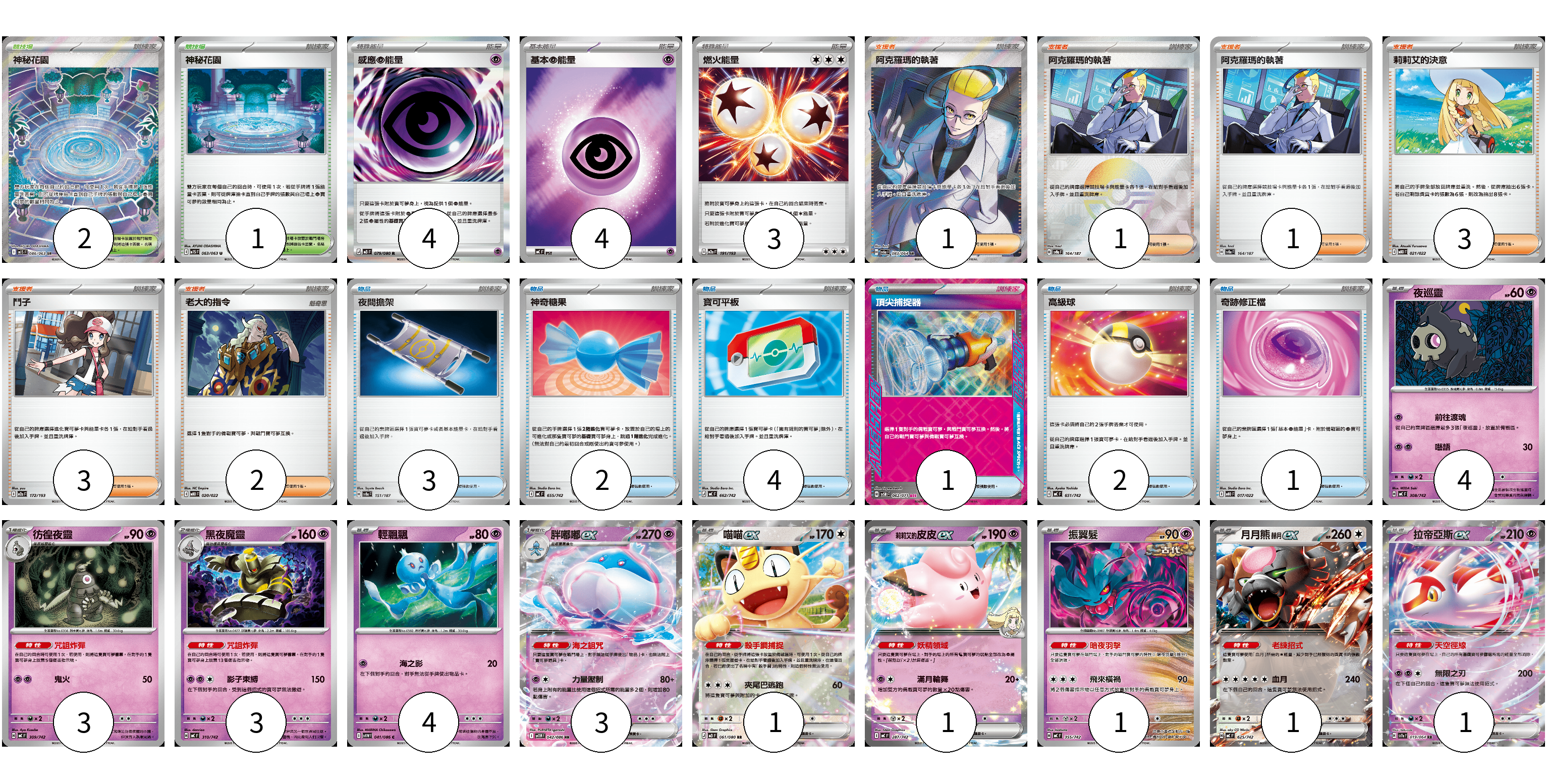牌組構築方案 以此牌組為基礎新構築牌組 顯示卡面 顯示列表 寶可夢卡(22) 4 3 3 4 3 1 1 1 1 1 物品卡(13) 3 2 4 1 2 1 支援者卡(11) 1 1 1 3 3 2 競技場卡(3) 2 1 能量卡(11) 4 4 3 寶可夢卡(22) 卡牌名稱 張數 卡牌名稱 張數 夜巡靈 MC 308/742 04 彷徨夜靈 MC 309/742 03 黑夜魔靈 MC 310/742 03 輕飄飄 SV11W 041/086 04 胖嘟嘟ex SV11W 042/086 03 喵喵ex M3 061/080 01 莉莉艾的皮皮ex MC 287/742 01 振翼髮 MC 355/742 01 月月熊 赫月 ex MC 625/742 01 拉帝亞斯ex SV7a 019/064 01 物品卡(13) 卡牌名稱 張數 卡牌名稱 張數 夜間擔架 SV8a 151/187 03 神奇糖果 MC 655/742 02 寶可平板 MC 662/742 04 頂尖捕捉器 SV5M 062/071 01 高級球 MC 651/742 02 奇跡修正檔 MBD 017/022 01 支援者卡(11) 卡牌名稱 張數 卡牌名稱 張數 阿克羅瑪的執著 SV6a 083/064 01 阿克羅瑪的執著 SV8a 164/187 01 阿克羅瑪的執著 SV8a 164/187 01 莉莉艾的決意 MBD 021/022 03 鬥子 M2a 172/193 03 老大的指令 MBD 020/022 02 競技場卡(3) 卡牌名稱 張數 卡牌名稱 張數 神秘花園 M1S 086/063 02 神秘花園 M1S 063/063 01 能量卡(11) 卡牌名稱 張數 卡牌名稱 張數 感應【超】能量 M3 079/080 04 基本【超】能量 MC PSY 04 燃火能量 M2a 191/193 03 以此牌組為基礎新構築牌組 牌組編碼 OSgTQx-mfLfUu-ZHLAav copy 列印牌組單 牌組編碼已複製 分享至SNS