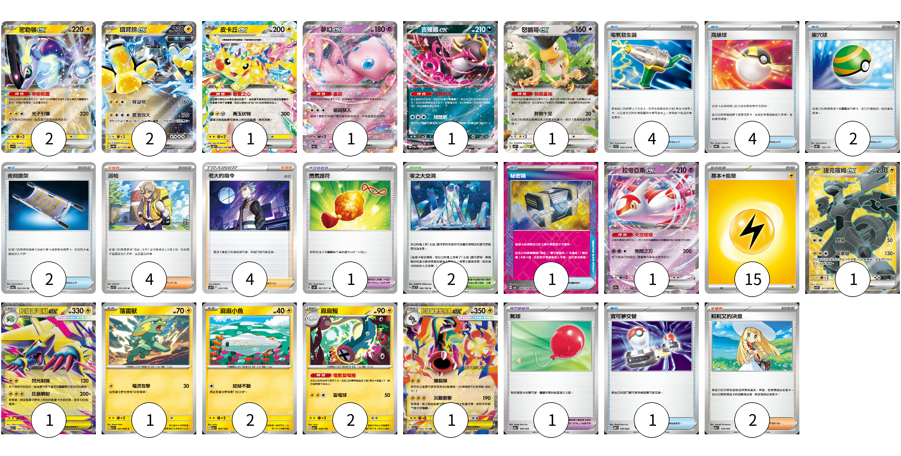 牌組構築方案 以此牌組為基礎新構築牌組 顯示卡面 顯示列表 寶可夢卡(17) 2 2 1 1 1 1 1 1 1 1 2 2 1 寶可夢道具(2) 1 1 物品卡(14) 4 4 2 2 1 1 支援者卡(10) 4 4 2 競技場卡(2) 2 能量卡(15) 15 寶可夢卡(17) 卡牌名稱 張數 卡牌名稱 張數 密勒頓ex SV1V 037/078 02 鐵臂膀ex SV4M 027/066 02 皮卡丘ex SV8 033/106 01 夢幻ex SV2a 151/165 01 吉雉雞ex SV6a 038/064 01 怒鸚哥ex SV2P 065/071 01 拉帝亞斯ex SV7a 019/064 01 捷克羅姆ex SV11B 161/086 01 超級雷電獸ex M1S 032/063 01 落雷獸 M1S 031/063 01 麻麻小魚 M2a 047/193 02 麻麻鰻 M2a 048/193 02 超級麻麻鰻魚王ex M2a 049/193 01 寶可夢道具(2) 卡牌名稱 張數 卡牌名稱 張數 勇氣護符 SV2D 067/071 01 氣球 M2a 165/193 01 物品卡(14) 卡牌名稱 張數 卡牌名稱 張數 電氣發生器 SV1V 069/078 04 高級球 SVM 134/175 04 巢穴球 SVM 133/175 02 夜間擔架 SV6a 056/064 02 秘密箱 SV6 092/101 01 寶可夢交替 MBG 015/022 01 支援者卡(10) 卡牌名稱 張數 卡牌名稱 張數 派帕 SV1V 076/078 04 老大的指令(赤日) SVB 024/028 04 莉莉艾的決意 M2a 175/193 02 競技場卡(2) 卡牌名稱 張數 卡牌名稱 張數 零之大空洞 SV7 102/102 02 能量卡(15) 卡牌名稱 張數 卡牌名稱 張數 基本雷能量 sv-p LIG 15 以此牌組為基礎新構築牌組 牌組編碼 OTCuGJ-HnVzbn-OWbVyz copy 列印牌組單 牌組編碼已複製 分享至SNS