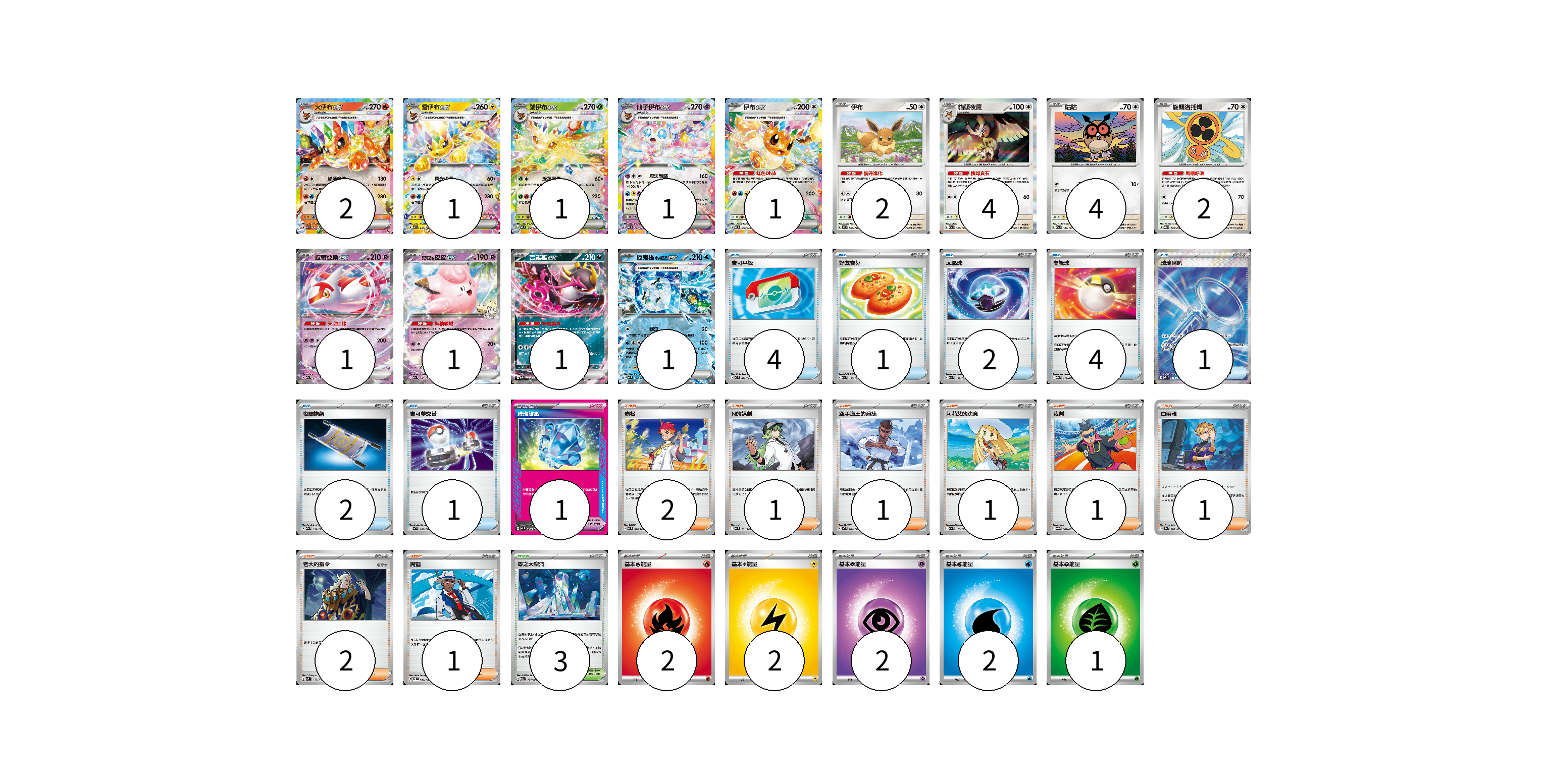 牌組構築方案 以此牌組為基礎新構築牌組 顯示卡面 顯示列表 寶可夢卡(22) 2 1 1 1 1 2 4 4 2 1 1 1 1 寶可夢道具(1) 1 物品卡(15) 4 1 2 4 1 2 1 支援者卡(10) 2 1 1 1 1 1 2 1 競技場卡(3) 3 能量卡(9) 2 2 2 2 1 寶可夢卡(22) 卡牌名稱 張數 卡牌名稱 張數 火伊布ex MC 094/742 02 雷伊布ex MC 238/742 01 葉伊布ex MC 038/742 01 仙子伊布ex MC 299/742 01 伊布ex MC 566/742 01 伊布 MC 565/742 02 貓頭夜鷹 M2a 138/193 04 咕咕 M2a 137/193 04 旋轉洛托姆 M2a 139/193 02 拉帝亞斯ex M2a 075/193 01 莉莉艾的皮皮ex M2a 060/193 01 吉雉雞ex M2a 114/193 01 厄鬼椪 水井面具ex MC 224/742 01 寶可夢道具(1) 卡牌名稱 張數 卡牌名稱 張數 璀璨結晶 MC 680/742 01 物品卡(15) 卡牌名稱 張數 卡牌名稱 張數 寶可平板 M3 070/080 04 好友寶芬 M2a 153/193 01 太晶珠 M2a 152/193 02 高級球 MBG 012/022 04 玻璃喇叭 M2a 215/193 01 夜間擔架 M2a 159/193 02 寶可夢交替 MC 663/742 01 支援者卡(10) 卡牌名稱 張數 卡牌名稱 張數 赤松 MC 696/742 02 N的謀劃 MC 701/742 01 空手道王的演練 MC 704/742 01 莉莉艾的決意 M2a 175/193 01 裁判 SV9a 062/063 01 白蕾雅 SV8a 176/187 01 老大的指令 SVM 172/175 02 席藍 SV8 102/106 01 競技場卡(3) 卡牌名稱 張數 卡牌名稱 張數 零之大空洞 M2a 184/193 03 能量卡(9) 卡牌名稱 張數 卡牌名稱 張數 基本【火】能量 MC FIR 02 基本【雷】能量 MC LIG 02 基本【超】能量 MC PSY 02 基本【水】能量 MC WAT 02 基本【草】能量 MC GRA 01 以此牌組為基礎新構築牌組 牌組編碼 OTucVi-yyHwvI-cfyXoT copy 列印牌組單 牌組編碼已複製 分享至SNS