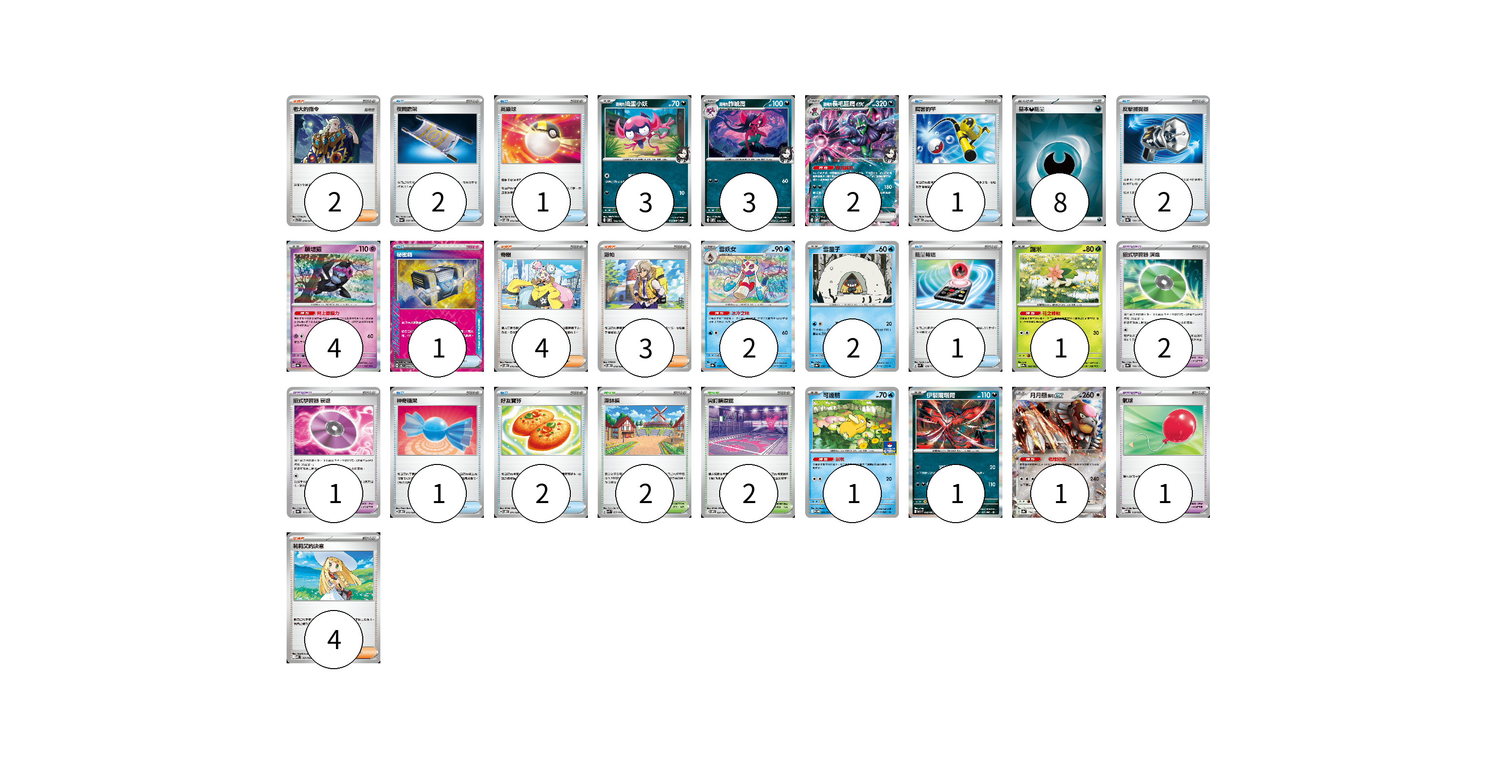 牌組構築方案 以此牌組為基礎新構築牌組 顯示卡面 顯示列表 寶可夢卡(20) 3 3 2 4 2 2 1 1 1 1 寶可夢道具(3) 2 1 物品卡(12) 2 1 1 2 1 1 1 2 1 支援者卡(13) 2 4 3 4 競技場卡(4) 2 2 能量卡(8) 8 寶可夢卡(20) 卡牌名稱 張數 卡牌名稱 張數 <瑪俐的>搗蛋小妖 SVOM 005/021 03 <瑪俐的>詐唬魔 SVOM 006/021 03 <瑪俐的>長毛巨魔ex SVOM 007/021 02 願增猿 SV8a 075/187 04 雪妖女 SV8a 038/187 02 雪童子 SV8a 037/187 02 謝米 SV9a 006/063 01 可達鴨 SV-P 220/SV-P 01 伊裴爾塔爾 M1L 040/063 01 月月熊 赫月ex SV8a 134/187 01 寶可夢道具(3) 卡牌名稱 張數 卡牌名稱 張數 招式學習器 演進 SV8a 160/187 02 招式學習器 衰退 SV8a 161/187 01 物品卡(12) 卡牌名稱 張數 卡牌名稱 張數 夜間擔架 SV6a 056/064 02 高級球 SVOD 012/020 01 厲害釣竿 SVOD 010/020 01 反擊捕捉器 SV8a 139/187 02 秘密箱 SV6 092/101 01 能量輸送 SVM 128/175 01 神奇糖果 SVOD 013/020 01 好友寶芬 SVOD 011/020 02 氣球 MBD 018/022 01 支援者卡(13) 卡牌名稱 張數 卡牌名稱 張數 老大的指令 SVTR 019/021 02 奇樹 SVOD 016/020 04 派帕 SVOD 018/020 03 莉莉艾的決意 MBD 021/022 04 競技場卡(4) 卡牌名稱 張數 卡牌名稱 張數 深缽鎮 SVK 039/042 02 尖釘鎮道館 SVOM 021/021 02 能量卡(8) 卡牌名稱 張數 卡牌名稱 張數 基本【惡】能量 SVOM DAR 08 以此牌組為基礎新構築牌組 牌組編碼 OWiWQS-nCMgGE-RvMBLU copy 列印牌組單 牌組編碼已複製 分享至SNS