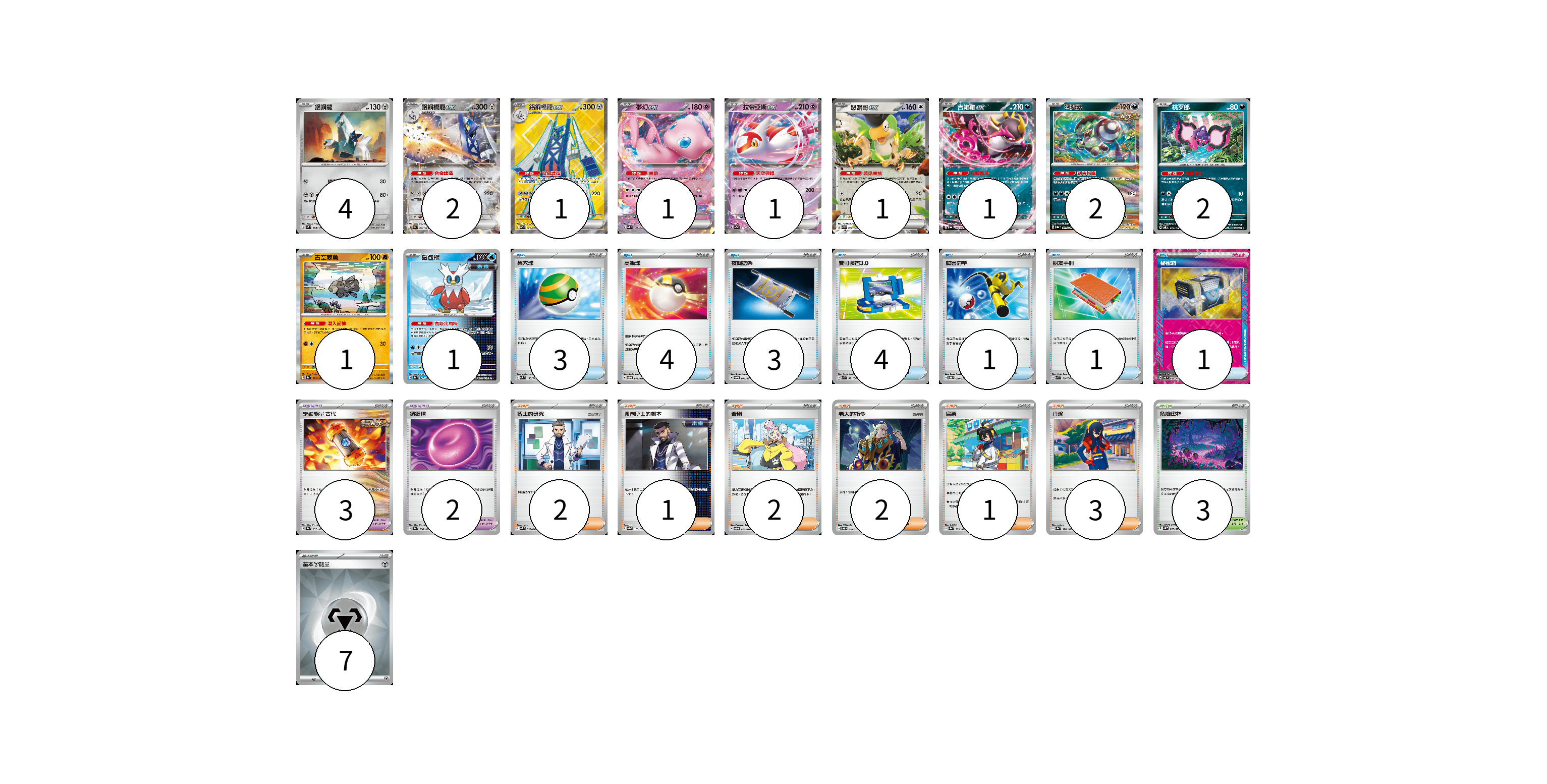 牌組構築方案 以此牌組為基礎新構築牌組 顯示卡面 顯示列表 寶可夢卡(17) 4 2 1 1 1 1 1 2 2 1 1 寶可夢道具(5) 3 2 物品卡(17) 3 4 3 4 1 1 1 支援者卡(11) 2 1 2 2 1 3 競技場卡(3) 3 能量卡(7) 7 寶可夢卡(17) 卡牌名稱 張數 卡牌名稱 張數 鋁鋼龍 SVM 088/175 04 鋁鋼橋龍ex SV7a 037/064 02 鋁鋼橋龍ex SV7a 080/064 01 夢幻ex SVK 001/042 01 拉帝亞斯ex SV7a 019/064 01 怒鸚哥ex SVK 006/042 01 吉雉雞ex SV6a 038/064 01 猛惡菇 SV8a 099/187 02 桃歹郎 SV8 075/106 02 古空棘魚 SV8a 079/187 01 鐵包袱 SV8a 047/187 01 寶可夢道具(5) 卡牌名稱 張數 卡牌名稱 張數 驅勁能量 古代 SV8a 157/187 03 鎖鏈糬 SV8a 154/187 02 物品卡(17) 卡牌名稱 張數 卡牌名稱 張數 巢穴球 SVM 133/175 03 高級球 SVOD 012/020 04 夜間擔架 SVOM 016/021 03 寶可裝置3.0 SVK 021/042 04 厲害釣竿 SVOD 010/020 01 朋友手冊 SVK 014/042 01 秘密箱 SV6 092/101 01 支援者卡(11) 卡牌名稱 張數 卡牌名稱 張數 博士的研究 SVK 033/042 02 弗圖博士的劇本 SV8a 175/187 01 奇樹 SVOD 016/020 02 老大的指令 SVOD 019/020 02 烏栗 SV8a 169/187 01 丹瑜 SV8a 170/187 03 競技場卡(3) 卡牌名稱 張數 卡牌名稱 張數 危險密林 SV5K 070/071 03 能量卡(7) 卡牌名稱 張數 卡牌名稱 張數 基本【鋼】能量 SVOD MET 07 以此牌組為基礎新構築牌組 牌組編碼 Ocryrc-TFmfxO-Muhigz copy 列印牌組單 牌組編碼已複製 分享至SNS