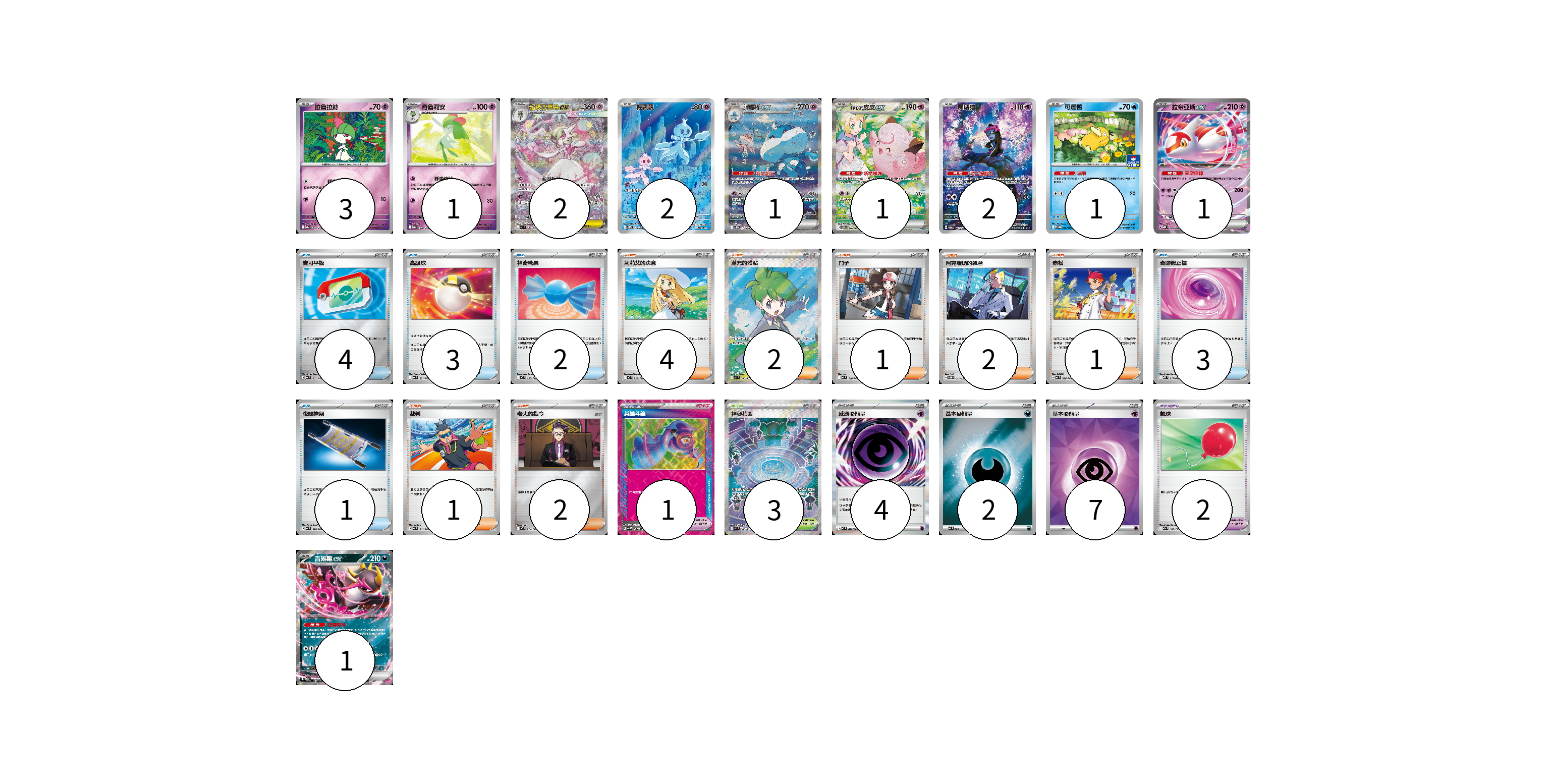 牌組構築方案 以此牌組為基礎新構築牌組 顯示卡面 顯示列表 寶可夢卡(15) 3 1 2 2 1 1 2 1 1 1 寶可夢道具(3) 1 2 物品卡(13) 4 3 2 3 1 支援者卡(13) 4 2 1 2 1 1 2 競技場卡(3) 3 能量卡(13) 4 2 7 寶可夢卡(15) 卡牌名稱 張數 卡牌名稱 張數 拉魯拉絲 M2a 069/193 03 奇魯莉安 M2a 070/193 01 超級沙奈朵ex M1S 087/063 02 輕飄飄 SV11W 124/086 02 胖嘟嘟ex SV11W 170/086 01 莉莉艾的皮皮ex SV9 126/100 01 願增猿 SV6 107/101 02 可達鴨 SV-P 220/SV-P 01 拉帝亞斯ex MBD 003/022 01 吉雉雞ex M2a 114/193 01 寶可夢道具(3) 卡牌名稱 張數 卡牌名稱 張數 英雄斗篷 SV5M 064/071 01 氣球 M2a 165/193 02 物品卡(13) 卡牌名稱 張數 卡牌名稱 張數 寶可平板 MC 662/742 04 高級球 MC 651/742 03 神奇糖果 MC 655/742 02 奇跡修正檔 MBD 017/022 03 夜間擔架 MC 670/742 01 支援者卡(13) 卡牌名稱 張數 卡牌名稱 張數 莉莉艾的決意 MC 729/742 04 滿充的體貼 M1S 085/063 02 鬥子 MC 718/742 01 阿克羅瑪的執著 SVOM 017/021 02 赤松 MC 696/742 01 裁判 MC 711/742 01 老大的指令 MC 724/742 02 競技場卡(3) 卡牌名稱 張數 卡牌名稱 張數 神秘花園 M1S 086/063 03 能量卡(13) 卡牌名稱 張數 卡牌名稱 張數 感應【超】能量 M3 079/080 04 基本【惡】能量 MC DAR 02 基本【超】能量 SVOD PSY 07 以此牌組為基礎新構築牌組 牌組編碼 OdVFmL-RScdRP-qsZHCz copy 列印牌組單 牌組編碼已複製 分享至SNS