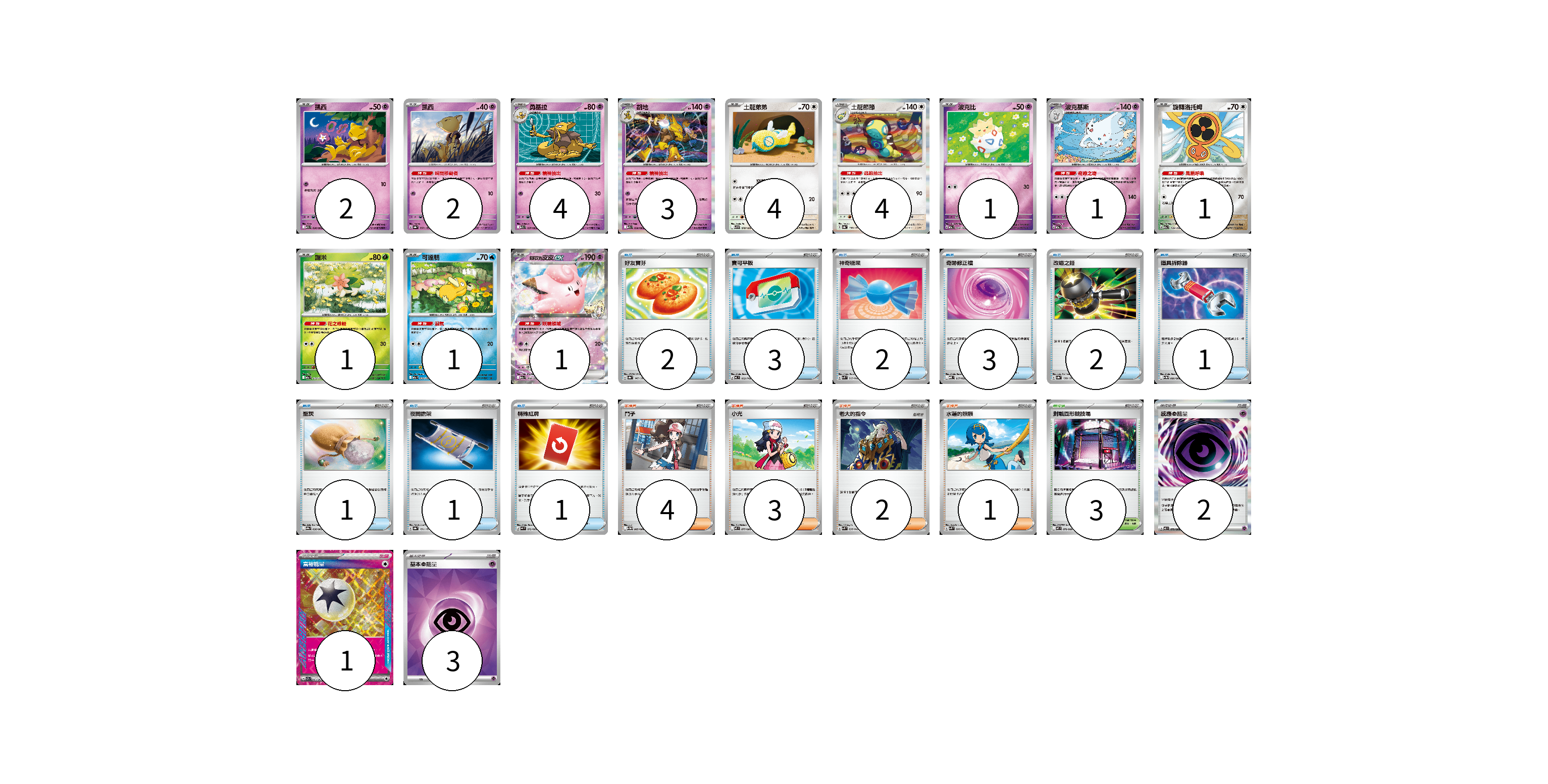 牌組構築方案 以此牌組為基礎新構築牌組 顯示卡面 顯示列表 寶可夢卡(25) 2 2 4 3 4 4 1 1 1 1 1 1 物品卡(16) 2 3 2 3 2 1 1 1 1 支援者卡(10) 4 3 2 1 競技場卡(3) 3 能量卡(6) 2 1 3 寶可夢卡(25) 卡牌名稱 張數 卡牌名稱 張數 凱西 M1S 036/063 02 凱西 SV8a 057/187 02 勇基拉 M1S 037/063 04 胡地 M1S 038/063 03 土龍弟弟 SV9 078/100 04 土龍節節 SV8a 130/187 04 波克比 M2a 064/193 01 波克基斯 M2a 066/193 01 旋轉洛托姆 M2a 139/193 01 謝米 M2a 012/193 01 可達鴨 M2a 032/193 01 莉莉艾的皮皮ex M2a 060/193 01 物品卡(16) 卡牌名稱 張數 卡牌名稱 張數 好友寶芬 SV8a 147/187 02 寶可平板 MC 662/742 03 神奇糖果 SVK 019/042 02 奇跡修正檔 MBD 017/022 03 改造之錘 SV8a 138/187 02 道具拆除器 SV11W 080/086 01 聖灰 SV9a 056/063 01 夜間擔架 SV8a 151/187 01 特殊紅牌 M4 072/083 01 支援者卡(10) 卡牌名稱 張數 卡牌名稱 張數 鬥子 SV11W 085/086 04 小光 M2 077/080 03 老大的指令 SVK 036/042 02 水蓮的照顧 SVK 028/042 01 競技場卡(3) 卡牌名稱 張數 卡牌名稱 張數 對戰圓形競技場 M2 079/080 03 能量卡(6) 卡牌名稱 張數 卡牌名稱 張數 感應【超】能量 M3 079/080 02 富裕能量 SV7a 064/064 01 基本【超】能量 SVOD PSY 03 以此牌組為基礎新構築牌組 牌組編碼 OdzeOY-PgMuuJ-uWmcSd copy 列印牌組單 牌組編碼已複製 分享至SNS