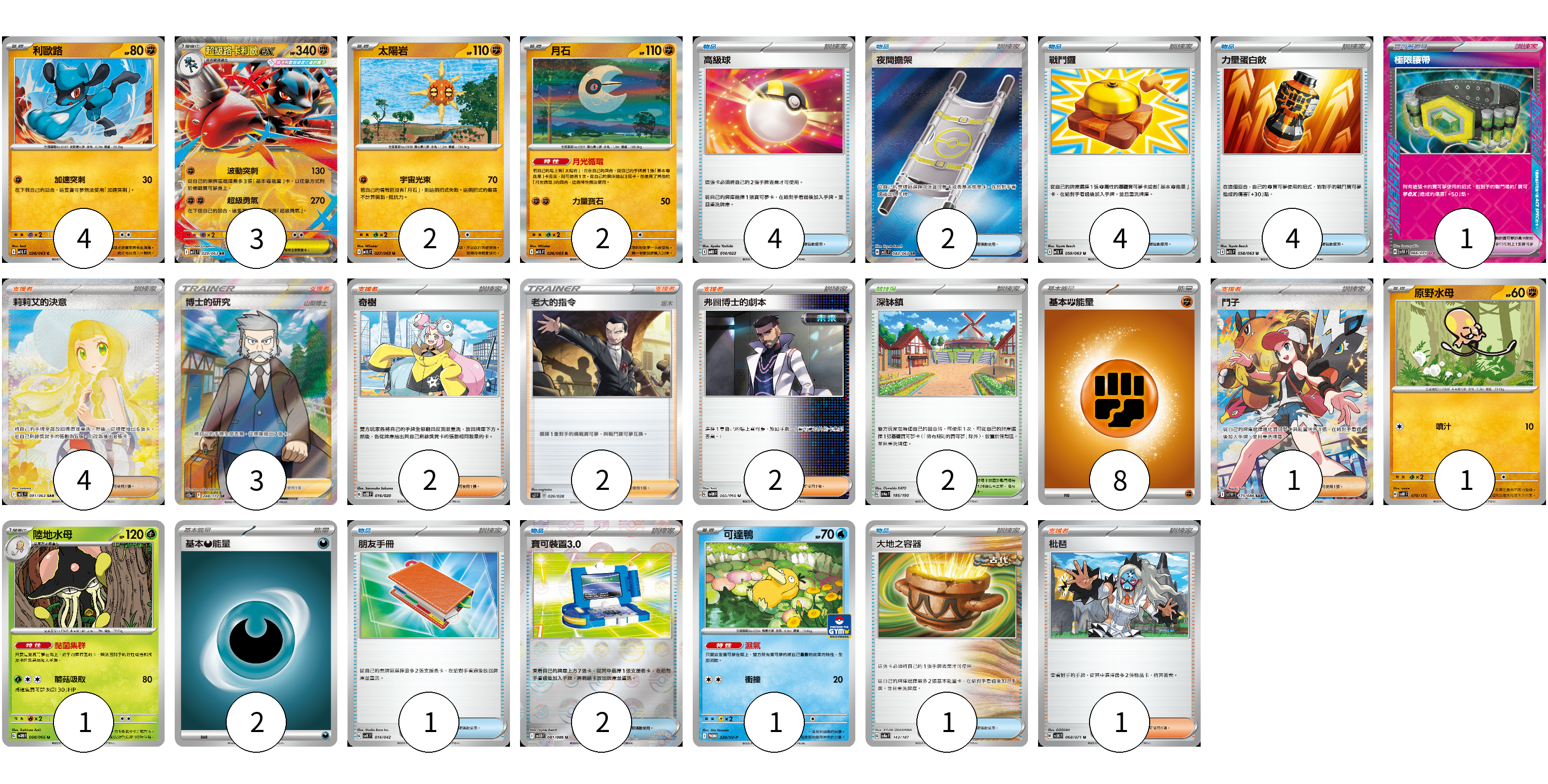 牌組構築方案 以此牌組為基礎新構築牌組 顯示卡面 顯示列表 寶可夢卡(14) 4 3 2 2 1 1 1 寶可夢道具(1) 1 物品卡(18) 4 2 4 4 1 2 1 支援者卡(15) 4 3 2 2 2 1 1 競技場卡(2) 2 能量卡(10) 8 2 寶可夢卡(14) 卡牌名稱 張數 卡牌名稱 張數 利歐路 M1L 028/063 04 超級路卡利歐ex M1L 029/063 03 太陽岩 M1L 027/063 02 月石 M1L 026/063 02 原野水母 SVM 070/175 01 陸地水母 SV4M 008/066 01 可達鴨 SV-P 220/SV-P 01 寶可夢道具(1) 卡牌名稱 張數 卡牌名稱 張數 極限腰帶 SV5K 066/071 01 物品卡(18) 卡牌名稱 張數 卡牌名稱 張數 高級球 MBD 014/022 04 夜間擔架 M1L 083/063 02 戰鬥鑼 M1L 059/063 04 力量蛋白飲 M1L 058/063 04 朋友手冊 SVK 014/042 01 寶可裝置3.0 SV11B 081/086 02 大地之容器 SV8a 143/187 01 支援者卡(15) 卡牌名稱 張數 卡牌名稱 張數 莉莉艾的決意 M1L 091/063 04 博士的研究(山梨博士) S12a 248/172 03 奇樹 SVOD 016/020 02 老大的指令(坂木) SJ 026/028 02 弗圖博士的劇本 SV4M 065/066 02 鬥子 SV11W 173/086 01 枇琶 SV5K 068/071 01 競技場卡(2) 卡牌名稱 張數 卡牌名稱 張數 深缽鎮 SV4a 185/190 02 能量卡(10) 卡牌名稱 張數 卡牌名稱 張數 基本【鬥】能量 M-P FIG 08 基本【惡】能量 SVF DAR 02 以此牌組為基礎新構築牌組 牌組編碼 OeIAuB-EEgPHy-GgqLNj copy 列印牌組單 牌組編碼已複製 分享至SNS