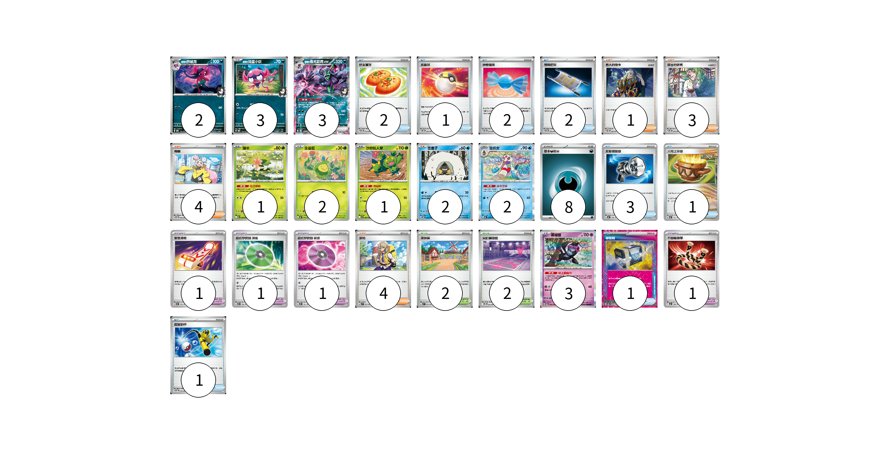 牌組構築方案 以此牌組為基礎新構築牌組 顯示卡面 顯示列表 寶可夢卡(19) 2 3 3 1 2 1 2 2 3 寶可夢道具(4) 1 1 1 1 物品卡(13) 2 1 2 2 3 1 1 1 支援者卡(12) 1 3 4 4 競技場卡(4) 2 2 能量卡(8) 8 寶可夢卡(19) 卡牌名稱 張數 卡牌名稱 張數 <瑪俐的>詐唬魔 SVOM 006/021 02 <瑪俐的>搗蛋小妖 SVOM 005/021 03 <瑪俐的>長毛巨魔ex SVOM 007/021 03 謝米 SV9a 006/063 01 含羞苞 SV8a 001/187 02 沙鈴仙人掌 SV9 006/100 01 雪童子 SV6 031/101 02 雪妖女 SV8a 038/187 02 願增猿 SV6 055/101 03 寶可夢道具(4) 卡牌名稱 張數 卡牌名稱 張數 緊急滑板 SV8a 153/187 01 招式學習器 演進 SV8a 160/187 01 招式學習器 衰退 SV8a 161/187 01 不服輸頭帶 SV4a 168/190 01 物品卡(13) 卡牌名稱 張數 卡牌名稱 張數 好友寶芬 SVOM 012/021 02 高級球 SVOM 013/021 01 神奇糖果 SVOM 014/021 02 夜間擔架 SVOM 016/021 02 反擊捕捉器 SV8a 139/187 03 大地之容器 SV8a 143/187 01 秘密箱 SV6 092/101 01 厲害釣竿 SVOD 010/020 01 支援者卡(12) 卡牌名稱 張數 卡牌名稱 張數 老大的指令 SVOM 020/021 01 博士的研究 SVOM 019/021 03 奇樹 SVOM 018/021 04 派帕 SVK 035/042 04 競技場卡(4) 卡牌名稱 張數 卡牌名稱 張數 深缽鎮 SVK 039/042 02 尖釘鎮道館 SVOM 021/021 02 能量卡(8) 卡牌名稱 張數 卡牌名稱 張數 基本【惡】能量 SVF DAR 08 以此牌組為基礎新構築牌組 牌組編碼 OedWSC-hsRbRf-dMjUsC copy 列印牌組單 牌組編碼已複製 分享至SNS