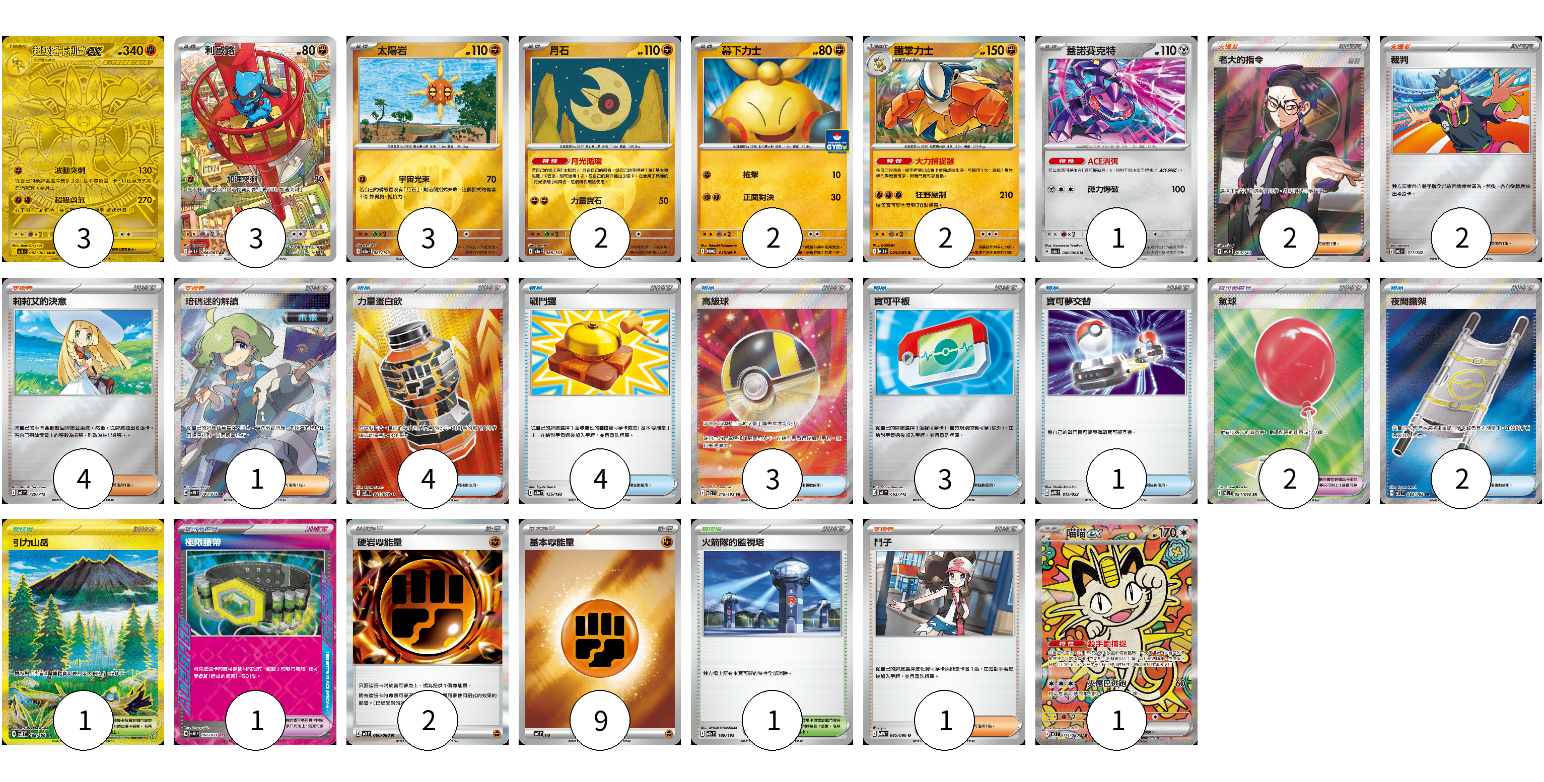 牌組構築方案 以此牌組為基礎新構築牌組 顯示卡面 顯示列表 寶可夢卡(17) 3 3 3 2 2 2 1 1 寶可夢道具(3) 2 1 物品卡(17) 4 4 3 3 1 2 支援者卡(10) 2 2 4 1 1 競技場卡(2) 1 1 能量卡(11) 2 9 寶可夢卡(17) 卡牌名稱 張數 卡牌名稱 張數 超級路卡利歐ex M1L 092/063 03 利歐路 M1L 068/063 03 太陽岩 M2a 087/193 03 月石 M2a 086/193 02 幕下力士 M-P 015/M-P 02 鐵掌力士 M1L 025/063 02 蓋諾賽克特 SV6a 040/064 01 喵喵ex M3 114/080 01 寶可夢道具(3) 卡牌名稱 張數 卡牌名稱 張數 氣球 M1L 084/063 02 極限腰帶 SV5K 066/071 01 物品卡(17) 卡牌名稱 張數 卡牌名稱 張數 力量蛋白飲 M1L 081/063 04 戰鬥鑼 M2a 155/193 04 高級球 M2a 216/193 03 寶可平板 MC 662/742 03 寶可夢交替 MBG 015/022 01 夜間擔架 M1L 083/063 02 支援者卡(10) 卡牌名稱 張數 卡牌名稱 張數 老大的指令(烏羽) MC 760/742 02 裁判 MC 711/742 02 莉莉艾的決意 MC 729/742 04 暗碼迷的解讀 SV5M 090/071 01 鬥子 SV11W 085/086 01 競技場卡(2) 卡牌名稱 張數 卡牌名稱 張數 引力山岳 SV8 138/106 01 火箭隊的監視塔 M2a 189/193 01 能量卡(11) 卡牌名稱 張數 卡牌名稱 張數 硬岩【鬥】能量 M3 080/080 02 基本【鬥】能量 MC FIG 09 以此牌組為基礎新構築牌組 牌組編碼 OgmayD-pqWQOi-fxqiYc copy 列印牌組單 牌組編碼已複製 分享至SNS