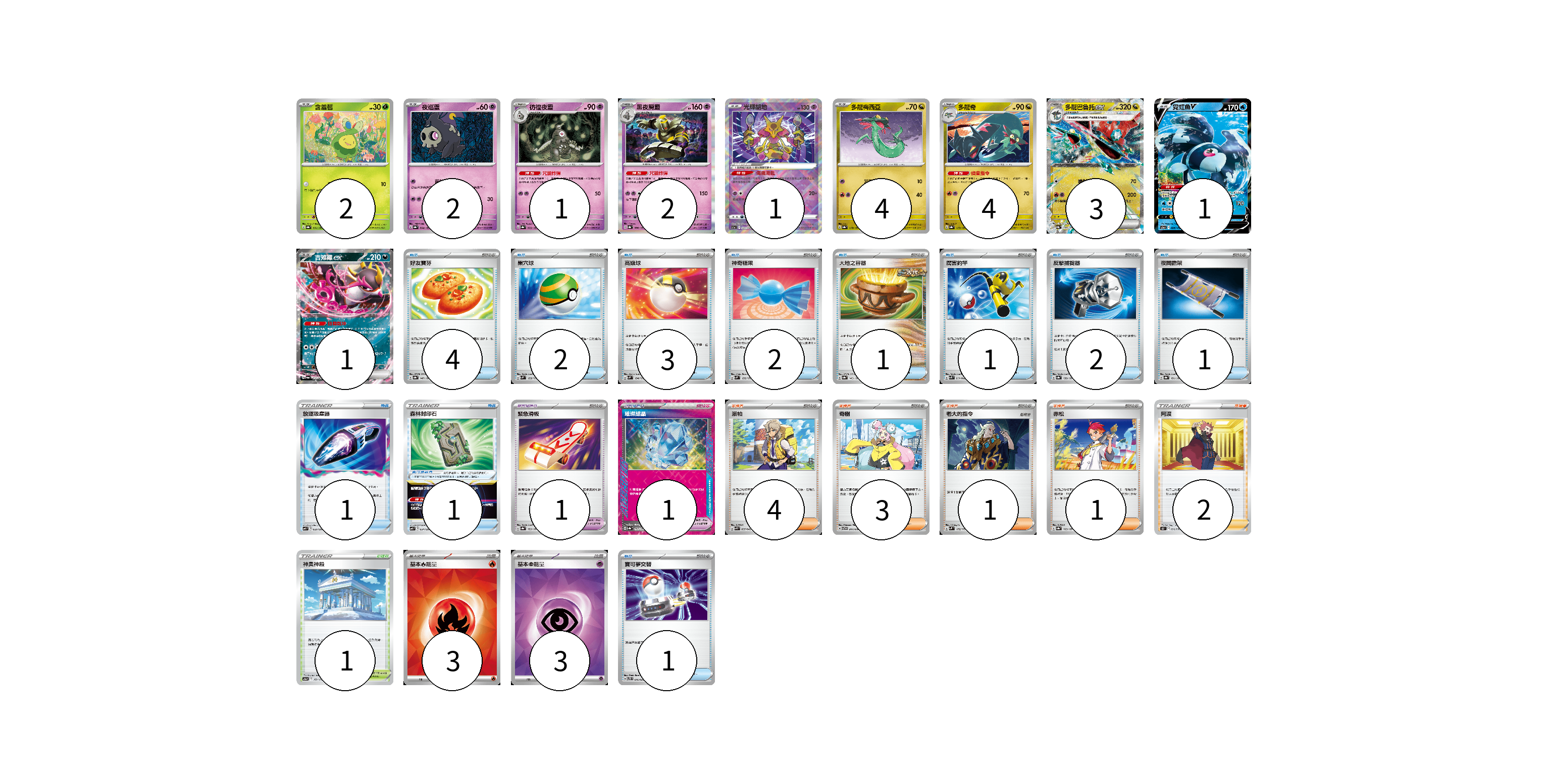牌組構築方案 以此牌組為基礎新構築牌組 顯示卡面 顯示列表 寶可夢卡(21) 2 2 1 2 1 4 4 3 1 1 寶可夢道具(2) 1 1 物品卡(19) 4 2 3 2 1 1 2 1 1 1 1 支援者卡(11) 4 3 1 1 2 競技場卡(1) 1 能量卡(6) 3 3 寶可夢卡(21) 卡牌名稱 張數 卡牌名稱 張數 含羞苞 SV8a 001/187 02 夜巡靈 SV8a 064/187 02 彷徨夜靈 SV8a 065/187 01 黑夜魔靈 SV8a 066/187 02 光輝胡地 S11a 031/068 01 多龍梅西亞 SV8a 118/187 04 多龍奇 SV8a 119/187 04 多龍巴魯托ex SV8a 120/187 03 霓虹魚V S12a 026/172 01 吉雉雞ex SV6a 038/064 01 寶可夢道具(2) 卡牌名稱 張數 卡牌名稱 張數 緊急滑板 SV8a 153/187 01 璀璨結晶 SV8a 152/187 01 物品卡(19) 卡牌名稱 張數 卡牌名稱 張數 好友寶芬 SV8a 147/187 04 巢穴球 SVM 133/175 02 高級球 SVM 134/175 03 神奇糖果 SVM 135/175 02 大地之容器 SV8a 143/187 01 厲害釣竿 SVK 011/042 01 反擊捕捉器 SV8a 139/187 02 夜間擔架 SV8a 151/187 01 放逐吸塵器 SVF 023/038 01 森林封印石 SVF 024/038 01 寶可夢交替 SVTS 016/022 01 支援者卡(11) 卡牌名稱 張數 卡牌名稱 張數 派帕 SVK 035/042 04 奇樹 SVTG 017/019 03 老大的指令 SVM 172/175 01 赤松 SV8a 163/187 01 阿渡 S12 096/098 02 競技場卡(1) 卡牌名稱 張數 卡牌名稱 張數 神奧神殿 S12a 169/172 01 能量卡(6) 卡牌名稱 張數 卡牌名稱 張數 基本【火】能量 SVK FIR 03 基本【超】能量 SVK PSY 03 以此牌組為基礎新構築牌組 牌組編碼 OkgDHO-xNNGyI-aWBsLs copy 列印牌組單 牌組編碼已複製 分享至SNS