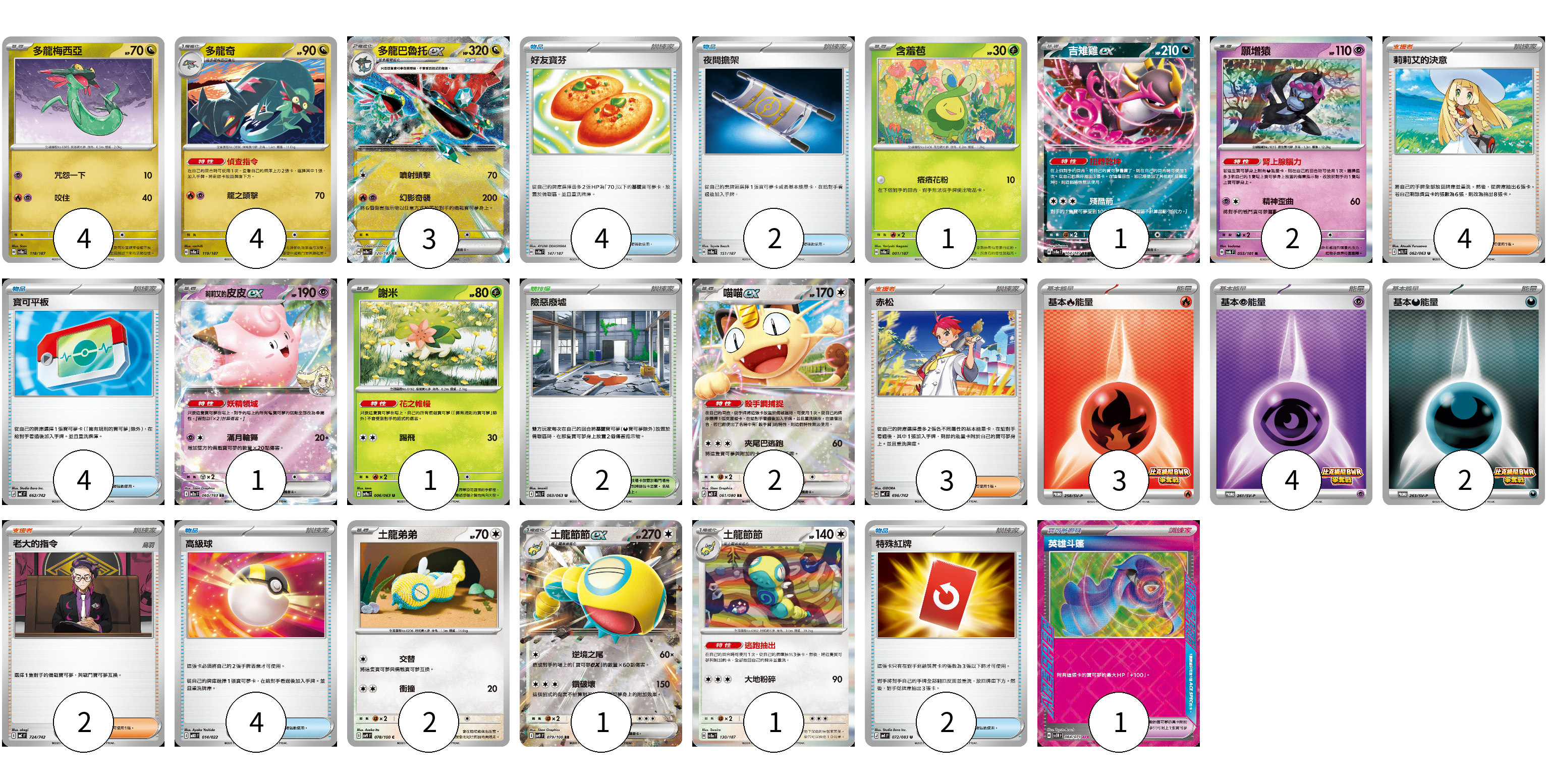 牌組構築方案 以此牌組為基礎新構築牌組 顯示卡面 顯示列表 寶可夢卡(23) 4 4 3 1 1 2 1 1 2 2 1 1 寶可夢道具(1) 1 物品卡(16) 4 2 4 4 2 支援者卡(9) 4 3 2 競技場卡(2) 2 能量卡(9) 3 4 2 寶可夢卡(23) 卡牌名稱 張數 卡牌名稱 張數 多龍梅西亞 SV8a 118/187 04 多龍奇 SV8a 119/187 04 多龍巴魯托ex SV8a 120/187 03 含羞苞 SV8a 001/187 01 吉雉雞ex SV8a 104/187 01 願增猿 SV6 055/101 02 莉莉艾的皮皮ex M2a 060/193 01 謝米 SV9a 006/063 01 喵喵ex M3 061/080 02 土龍弟弟 SV9 078/100 02 土龍節節ex SV9 079/100 01 土龍節節 SV8a 130/187 01 寶可夢道具(1) 卡牌名稱 張數 卡牌名稱 張數 英雄斗篷 SV5M 064/071 01 物品卡(16) 卡牌名稱 張數 卡牌名稱 張數 好友寶芬 SV8a 147/187 04 夜間擔架 SV8a 151/187 02 寶可平板 MC 662/742 04 高級球 MBD 014/022 04 特殊紅牌 M4 072/083 02 支援者卡(9) 卡牌名稱 張數 卡牌名稱 張數 莉莉艾的決意 M1L 062/063 04 赤松 MC 696/742 03 老大的指令 MC 724/742 02 競技場卡(2) 卡牌名稱 張數 卡牌名稱 張數 險惡廢墟 M1L 063/063 02 能量卡(9) 卡牌名稱 張數 卡牌名稱 張數 基本【火】能量 SV-P 258/SV-P 03 基本【超】能量 SV-P 261/SV-P 04 基本【惡】能量 SV-P 263/SV-P 02 以此牌組為基礎新構築牌組 牌組編碼 OmrnHm-OgfloJ-jMoGPN copy 列印牌組單 牌組編碼已複製 分享至SNS